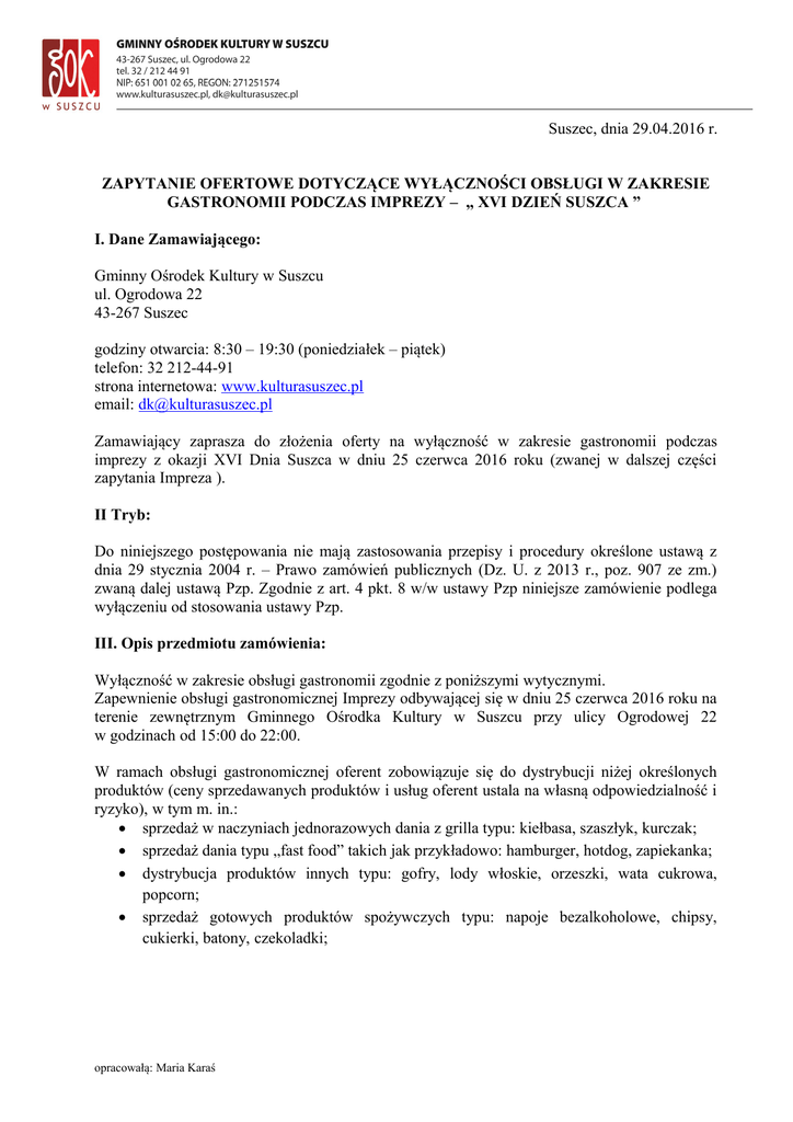 zapytanie ofertowe - Gminny Ośrodek Kultury w Suszcu