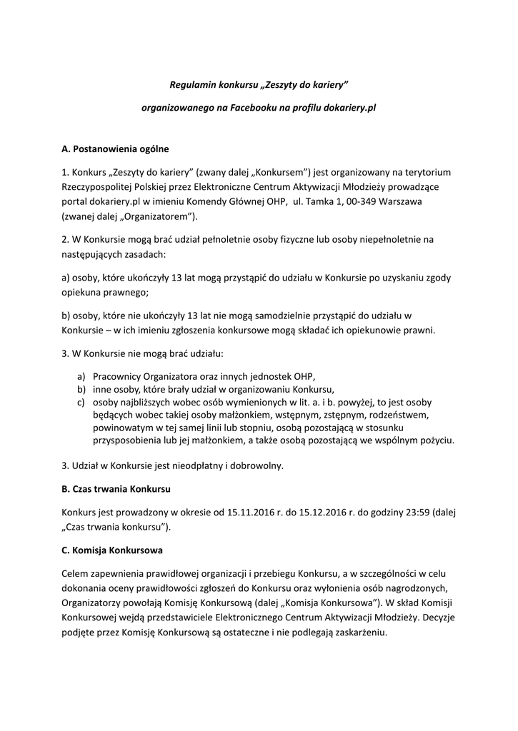 Regulamin konkursu „Zeszyty do kariery” organizowanego na Facebooku na profilu dokariery.pl A. Postanowienia ogólne 1. Konkurs „Zeszyty do kariery” (zwany dalej „Konkursem”) jest organizowany na terytorium Rzeczypospolitej Polskiej przez Elektroniczne Centrum Aktywizacji Młodzieży prowadzące portal dokariery.pl w imieniu Komendy Głównej OHP, ul. Tamka 1, 00-349 Warszawa (zwanej dalej „Organizatorem”). 2. W Konkursie mogą brać udział pełnoletnie osoby fizyczne lub osoby niepełnoletnie na następujących zasadach: a) osoby, które ukończyły 13 lat mogą przystąpić do udziału w Konkursie po uzyskaniu zgody opiekuna prawnego; b) osoby, które nie ukończyły 13 lat nie mogą samodzielnie przystąpić do udziału w Konkursie – w ich imieniu zgłoszenia konkursowe mogą składać ich opiekunowie prawni. 3. W Konkursie nie mogą brać udziału: a) Pracownicy Organizatora oraz innych jednostek OHP, b) inne osoby, które brały udział w organizowaniu Konkursu, c) osoby najbliższych wobec osób wymienionych w lit. a. i b. powyżej, to jest osoby będących wobec takiej osoby małżonkiem, wstępnym, zstępnym, rodzeństwem, powinowatym w tej samej linii lub stopniu, osobą pozostającą w stosunku przysposobienia lub jej małżonkiem, a także osobą pozostającą we wspólnym pożyciu. 3. Udział w Konkursie jest nieodpłatny i dobrowolny. B. Czas trwania Konkursu Konkurs jest prowadzony w okresie od 15.11.2016 r. do 15.12.2016 r. do godziny 23:59 (dalej „Czas trwania konkursu”). C. Komisja Konkursowa Celem zapewnienia prawidłowej organizacji i przebiegu Konkursu, a w szczególności w celu dokonania oceny prawidłowości zgłoszeń do Konkursu oraz wyłonienia osób nagrodzonych, Organizatorzy powołają Komisję Konkursową (dalej „Komisja Konkursowa”). W skład Komisji Konkursowej wejdą przedstawiciele Elektronicznego Centrum Aktywizacji Młodzieży. Decyzje podjęte przez Komisję Konkursową są ostateczne i nie podlegają zaskarżeniu. D. Nagrody 1. W Konkursie przewidzianych jest 20 nagród – zestawy gadżetów promujących Elektroniczne Centrum Aktywizacji Młodzieży i serwis dokariery.pl Zestaw I (x5): smartwatch, bidon, piłka, notes, torba eko, zawieszka-kotek, parasol, gra zręcznościowa, opaska odblaskowa, długopis z funkcją obsługi ekranów dotykowych, ołówek Zestaw II (x5): power bank, bidon, saszetka-nerka, pendrive, torba eko, zawieszka-kotek, gra zręcznościowa, opaska odblaskowa, długopis z funkcją obsługi ekranów dotykowych, ołówek Zestaw III (x5): głośnik bluetooth, bidon, pendrive, torba eko, brelok, gra zręcznościowa, opaska odblaskowa, długopis z funkcją obsługi ekranów dotykowych, ołówek Zestaw IV (x5): plecak, piłka, hub usb, torba eko, brelok, słuchawki douszne, bransoletka led, opaska odblaskowa, długopis z funkcją obsługi ekranów dotykowych, ołówek 2. Uczestnikom Konkursu nie przysługują roszczenia o wypłatę wartości Nagród w gotówce. 3. Uczestnikom Konkursu nie przysługują roszczenia o zamianę przyznanej Nagrody na inną Nagrodę. 4. Jakiekolwiek roszczenia uczestników Konkursu z tytułu nieotrzymania Nagród, które nie zostały im przyznane, są wyłączone. 5. Komisja konkursowa zastrzega sobie prawo do przyznawania dodatkowych nagród pocieszenia i nagród specjalnych. E. Przebieg konkursu 1. Zadanie konkursowe i warunki uczestnictwa w konkursie a) By wziąć udział w konkursie uczestnik powinien zrobić zdjęcie z zeszytem promocyjnym dokariery.pl i umieścić go na Facebooku, oznaczając profil portalu dokariery.pl w następujący sposób: @dokariery.pl. b) Następnie uczestnik powinien poinformować portal dokariery.pl o zamieszczeniu zdjęcia poprzez wysłanie maila z linkiem do swojego profilu pod adres: [email protected] lub w wiadomości na Facebooku. Aby Komisja Konkursowa mogła ocenić pracę konkursową, post ze zdjęciem powinien być ustawiony jako publiczny. Najwyżej oceniane będą zdjęcia najbardziej oryginalne i zabawne, opatrzone ciekawym opisem. Komisja konkursowa docenia kreatywność i nieszablonowe podejście do tematu. Prześmiewcze, obrażające kogokolwiek posty nie będą brane pod uwagę i będą zgłaszane jako naruszenie regulaminu Facebooka. c) Uczestnik powinien wyrazić zgodę na przetwarzanie, gromadzenie i wykorzystywanie danych osobowych zgodnie z ustawą o Ochronie Danych Osobowych (Dz. U. z 2016 r. poz. 922 ze zm.) na potrzeby Konkursu prowadzonego przez Organizatora (Elektroniczne Centrum Aktywizacji Młodzieży, Komenda Główna OHP) w tym, w szczególności do przesyłania korespondencji związanej z konkursem. Zgoda na przetwarzanie danych jest dobrowolna. Brak zgody oznacza jednak rezygnację z prawa do przyznanej nagrody. Jednocześnie organizatorzy informują o przysługującym prawie dostępu do swoich danych i ich korygowania. 2. Po zakończeniu Czasu Trwania Konkursu, spośród wszystkich prawidłowo opublikowanych zdjęć Komisja Konkursowa wybierze 20 laureatów konkursu, którzy otrzymają zestawy gadżetów. 3. Ogłoszenie wyników Konkursu nastąpi nie później niż 21.12.2016 r. w serwisie internetowym dokariery.pl, pod adresem http://dokariery.pl/ F. Odbiór Nagród 1. O przyznaniu Nagród laureaci zostaną poinformowani e-mailowo lub poprzez wiadomość na Facebooku. Organizatorzy prześlą taką informację na adres e-mailowy, z którego wpłynęło zawiadomienie o dodaniu zdjęcia lub na skrzynkę na Facebooku, jeśli to za pomocą tego portalu uczestnik poinformował o dodaniu zdjęcia. 2. Laureat zobowiązany jest odebrać wiadomość i potwierdzić tą samą drogą, że wiadomość tę otrzymał. Laureat zostanie poproszony o podanie swoich danych teleadresowych i numeru telefonu niezbędnych do przesłania mu wszelkich informacji związanych z wydaniem i odbiorem Nagrody. Na odpowiedź od danego laureata Organizator będzie czekać 7 dni od momentu wysłania mu informacji e-mailowej, o której mowa w pkt. 1 po