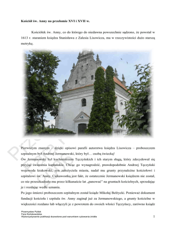 Kościół św. Anny na przełomie XVI i XVII w. Kościółek św. Anny, co do którego do niedawna powszechnie sądzono, że powstał w 1613 r. staraniem księdza Stanisława z Zalesia Lisowicza, ma w rzeczywistości dużo starszą Pr Fa ze 20 ra m 06 K ysł oń aw sk P ow yt l ol ak sk , a, metrykę. Pierwszym znanym – dzięki opisowi parafii autorstwa księdza Lisowicza – proboszczem szpitalnym był Andrzej Jermanowski, który był… osobą świecką! Ów Jermanowski był kuchmistrzem Tęczyńskich i ich starym sługą, który zdecydował się przyjąć święcenia kapłańskie. Chcąc go wynagrodzić, prawdopodobnie Andrzej Tęczyński wojewoda krakowski, syn założyciela miasta, nadał mu grunty przynależne kościołowi i szpitalowi św. Anny. Ciekawostką jest fakt, że ostatecznie Jermanowski księdzem nie został, co nie przeszkadzało mu przez kilkanaście lat „panować” na gruntach kościelnych, sprzedając je i rozdając wedle uznania. Po jego śmierci proboszczem szpitalnym został ksiądz Mikołaj Bełżycki. Ponieważ dokument fundacji kościoła i szpitala św. Anny zaginął już za Jermanowskiego, a grunty kościelne w większości rozdano lub włączyli je z powrotem do swoich włości Tęczyńscy, zarówno ksiądz Przemysław Pytlak Fara Końskowolska Wykorzystywanie publikacji dozwolone pod warunkiem cytowania źródła 1 Bełżycki, jak i ubodzy, którymi się opiekował, żyli na łasce właścicieli miasta. Lisowicz pisze, że Andrzej Tęczyński, wojewoda krakowski, obiecywał księdzu Bełżyckiemu wyznaczyć na nowo własność kościelną mawiając często „Wyjadę ja księże Mikołaju w pole za szpital y poko nogi konia mego zakopią [się], poty Twoy grunt będzie”. Jednak do tego szczególnego nadania nie doszło na skutek śmierci – najpierw Tęczyńskiego (1588 r.), a kilka Pr Fa ze 20 ra m 06 K ysł oń aw sk P ow yt l ol ak sk , a, lat później także proboszcza Bełżyckiego. Jego następcą został – prawdopodobnie w ostatnich latach XVI wieku - Stanisław z Zalesia Lisowicz. Tak opisał stan swojej parafii: „A mnie zaś pustki po nim dano. Kościółek drewniany na poły rozwalony y Dom zgniły obdarty. A grunty kościelne rozmaicie rozszaftowane, rozdane mieszczanom i chłopom wiejskim (…) Pan ostatek zagarnął: ledwo sadek siedlisku a ogród na gruncie dla ubogich zostawiono”. Stanisław Lisowicz był mieszczaninem i prawdopodobnie człowiekiem bliskim dworowi Tęczyńskich. Może świadczyć o tym fakt, że jego brat Melchior Lisowicz zwany też Trzaskowskim był krawcem Tęczyńskich i z nadania jednego z właścicieli miasta stał się posiadaczem części dawnego gruntu szpitalnego. Lisowicz poświęcił wiele czasu i energii na przywrócenie parafii szpitalnej stanu, jaki miała pierwotnie. Największym zadaniem, jakie jest mu przypisywane, stanowi budowa murowanego kościoła św. Anny. Dokumenty, jakie pozostawił po sobie Lisowicz nie stanowią tego wprost, ale koszty wystawienia tej świątyni ponieśli raczej właściciele miasta (jak przyznaje w sporządzonym inwentarzu, zawiadywanie i budowa budynków kościelnych pierwotnie należała do wyłącznych prerogatyw właścicieli miasta). Co więcej – kościół ten zbudowano na gruncie, który nadano: Piotrowi Szali kucharzowi, Stanisławowi ślusarzowi i zegarmistrzowi oraz Wojciechowi Żurawskiemu sługom „Panów hrabiów z Tęczyna”. Lisowicz przez wiele lat wcześniej starał się o przywrócenie tej działki kościołowi, ale jak pisze „ani proźbą, ani Prawem groźbą, ani podarunkami urzędnikom Lenckowskiemu, Młodeckiemu, Michałowskiemu, choć wzięli plus minus do 40 [czerwonych złotych]” nie udało się pozyskać jej własności. Wyszło to na jaw dopiero wtedy, kiedy przybył do Końskowoli – celem poświęcenia świątyni – biskup kamieniecki Jan Jędrzej Próchnicki. Dowiedziawszy się o stanie własności gruntów, na których została ona wystawiona, odmówił w pierwszym momencie konsekrowania kościoła. Kryzys zażegnała dopiero interwencja Mikołaja Karsickiego, ówczesnego dzierżawcy miasta, który choć był ewangelikiem, natychmiast w imieniu Gabriela Tęczyńskiego zapewnił, że grunty te zostaną nadane parafii. Lisowicz wychwala Karsickiego, Przemysław Pytlak Fara Końskowolska Wykorzystywanie publikacji dozwolone pod warunkiem cytowania źródła 2 który nie dość, że nie chciał przyjąć w zamian podarunku, to przez dwa dni własnym kosztem gościł biskupa i jego orszak. W kolejnych latach ksiądz Lisowicz podjął się zadania wykupu ogrodów i łąk, położonych na północ od kościoła św. Anny między Rudami a Końskowolą, które niegdyś miały stanowić własność parafii, rozdanych sługom (np. kowalowi Łubce, włodarzowi zamkowemu Tatarczakowi czy krawcowi Trzaskowskiemu) oraz mieszczanom Pr Fa ze 20 ra m 06 K ysł oń aw sk P ow yt l ol ak sk , a, Wojciechowi końskowolskim. Ksiądz Stanisław nie ograniczał się do odzyskiwania gruntów należących niegdyś do parafii; kupował także inne grunty, między innymi na „szpital białogłowski” – a więc zapewne miejsce schronienia dla wdów oraz kobiet nie posiadających rodzin. Należy przyznać, że proboszcz Lisowicz aktywnie starał się u kolejnych właścicieli miasta o zapewnienie stabilnego bytu ubogim przebywającym w szpitalu św. Anny. Pierwotnie Tęczyńscy nie oznaczyli zapewne precyzyjnie, co ich urzędnicy powinni przekazywać szpitalowi. Było to być może niepotrzebne w związku z tym, że ubogich i chorych utrzymywano z dochodu z gruntów parafialnych. Te jednak – jak widzimy – szybko zostały zagrabione. Dlatego zarówno Pan Kierłło, jak i Pan Karsicki – kolejni dzierżawcy miasta – przekazywali szpitalowi żywność dla jego podopiecznych. Lepiej wiodło się im w dniach, kiedy do Końskowoli zjeżdżali właściciele. Lisowicz pisze bowiem: „Wiem y Poświadczę Panem Bogiem, że nieboszczyk ksiądz Mikołaj