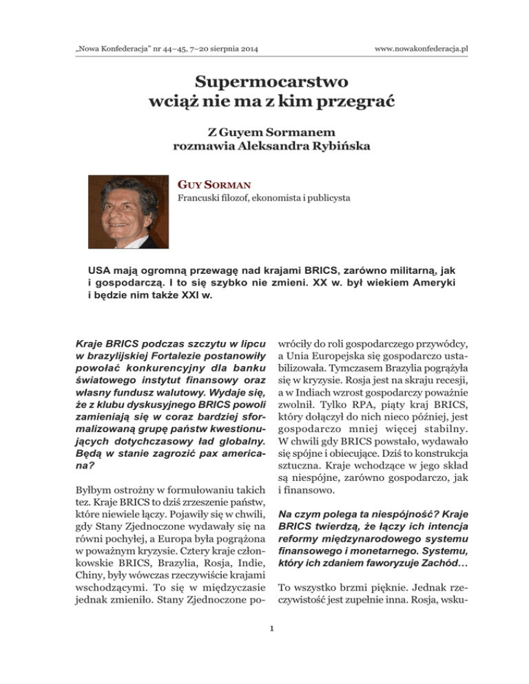 „Nowa Konfederacja” nr 44–45, 7–20 sierpnia 2014 www.nowakonfederacja.pl Supermocarstwo wciąż nie ma z kim przegrać Z Guyem Sormanem rozmawia Aleksandra Rybińska Guy SoRmAn Francuski filozof, ekonomista i publicysta USA mają ogromną przewagę nad krajami BRICS, zarówno militarną, jak i gospodarczą. I to się szybko nie zmieni. XX w. był wiekiem Ameryki i będzie nim także XXI w. Kraje BRICS podczas szczytu w lipcu w brazylijskiej Fortalezie postanowiły powołać konkurencyjny dla banku światowego instytut finansowy oraz własny fundusz walutowy. Wydaje się, że z klubu dyskusyjnego BRICS powoli zamieniają się w coraz bardziej sformalizowaną grupę państw kwestionujących dotychczasowy ład globalny. Będą w stanie zagrozić pax americana? wróciły do roli gospodarczego przywódcy, a Unia Europejska się gospodarczo ustabilizowała. Tymczasem Brazylia pogrążyła się w kryzysie. Rosja jest na skraju recesji, a w Indiach wzrost gospodarczy poważnie zwolnił. Tylko RPA, piąty kraj BRICS, który dołączył do nich nieco później, jest gospodarczo mniej więcej stabilny. W chwili gdy BRICS powstało, wydawało się spójne i obiecujące. Dziś to konstrukcja sztuczna. Kraje wchodzące w jego skład są niespójne, zarówno gospodarczo, jak i finansowo. Byłbym ostrożny w formułowaniu takich tez. Kraje BRICS to dziś zrzeszenie państw, które niewiele łączy. Pojawiły się w chwili, gdy Stany Zjednoczone wydawały się na równi pochyłej, a Europa była pogrążona w poważnym kryzysie. Cztery kraje członkowskie BRICS, Brazylia, Rosja, Indie, Chiny, były wówczas rzeczywiście krajami wschodzącymi. To się w międzyczasie jednak zmieniło. Stany Zjednoczone po- Na czym polega ta niespójność? Kraje BRICS twierdzą, że łączy ich intencja reformy międzynarodowego systemu finansowego i monetarnego. Systemu, który ich zdaniem faworyzuje Zachód… To wszystko brzmi pięknie. Jednak rzeczywistość jest zupełnie inna. Rosja, wsku- 1 „Nowa Konfederacja” nr 44–45, 7–20 sierpnia 2014 www.nowakonfederacja.pl tek działań na Ukrainie, jest obecnie międzynarodowym pariasem, a Indie usiłują się zbliżyć do USA, bez względu na to, co mówiły na szczycie w Fortalezie. Ze strachu zresztą przed Chinami, z którymi mają w ramach BRICS podważać globalny ład. Interesy tych dwóch krajów są zupełnie przeciwstawne i nie wyobrażam sobie, by dało je się ze sobą połączyć. Kraje BRICS nie mają także wystarczającego kapitału, by stworzyć własny bank rozwoju. Mają na to zbyt duże własne zapotrzebowanie finansowania. Pomysł ten wydaje mi się więc co najmniej kuriozalny. Wszystkie kraje BRICS bezustannie poszukują środków na międzynarodowych rynkach finansowych. Przede wszystkim Indie i Brazylia. Rosja jest obecnie, wskutek sankcji, częściowo od nich odcięta. to ponarzekajmy na amerykańską hegemonię. Amerykańska dominacja jest bezsporna. To USA stworzyły światowy system finansowy i monetarny, zależny od dolara, a kraje wschodzące odgrywają w nim tylko marginalną rolę… Owszem. Stany Zjednoczone dominują w Banku Światowym i w mniejszym stopniu w Międzynarodowym Funduszu Walutowym. To jednak jest tylko instytucjonalnym odzwierciedleniem rzeczywistości. Mamy dominację dolara i amerykańskie przywództwo. Ale że tak jest, nie jest winą Amerykanów. Żaden inny kraj nie był w stanie stworzyć waluty rezerwy podobnie bezpiecznej jak dolar amerykański. Kiedy spojrzy się na światową mapę patentów, czyli na to, ile patentów zostało złożonych na świecie i przez kogo, to na pierwszym miejscu są USA, na drugim Japonia, UE na trzecim, a potem daleko za tą trójką Korea Południowa. Kraje BRICS w kategorii patentów praktycznie nie istnieją. Tak samo Rosja, jak Indie i Chiny. Nie wspominając o Brazylii. Ta światowa karta patentów daje dobrą wskazówkę na przyszłość. W następnych latach, poza agitacją antyamerykańską, nie widzę szansy na znaczące zmiany. BRICS powoli wychodzą z mody. Nikt nie mówi już o gospodarkach wschodzących. Tylko schodzących. BRICS powoli wychodzą z mody. nikt nie mówi już o gospodarkach wschodzących. Tylko schodzących Kraje BRICS zdecydowały się jednak wyłożyć 100 mld dol. na bank, a kolejne 100 mld ma wynosić kapitał rezerwy funduszu walutowego. Chiny są gospodarką schodzącą? Do dlaczego wszyscy, z Amerykanami na czele, niepokoją się rosnącą potęgą Państwa Środka? Z naciskiem na „ma”. Kraje BRICS zobowiązały się te pieniądze wyłożyć. Jak na razie ich nie wyłożyły i mam bardzo duże wątpliwości, że się tak stanie. Co zaś dotyczy niesprawiedliwości pax americana, to jest to temat chętnie odkurzany, kiedy nie ma się nic innego do zaoferowania. Nie idzie nam tak dobrze, jak sądziliśmy, Chiny pozostają jednym z najbiedniejszych państw na świecie, patrząc na dochód na głowę mieszkańca. Znajdują się na 70. miejscu światowego rankingu. Mówi się, 2 „Nowa Konfederacja” nr 44–45, 7–20 sierpnia 2014 www.nowakonfederacja.pl że Państwo Środka jest drugą gospodarką świata. Możliwe, że tak jest, jeśli chodzi o objętość, choć nikt tego dokładnie nie wie, bo nie można ufać danym wytwarzanym przez chińską partię komunistyczną. Jeśli jednak rzeczywiście tak jest, to tylko dlatego, że Chiny są bardzo ludnym krajem. Połowa mieszkańców żyje w skrajnej biedzie. W ostatnim czasie gospodarka chińska zresztą znacząco zwolniła. Rosła w olbrzymim tempie przez ostatnie 25 lat, bo ruszyła od zera. Kiedy startuje się od zera, następuje efekt dopędzenia, co powoduje, że poziom wzrostu jest bardzo wysoki. Tak było też w przypadku Japonii i Korei Południowej, kiedy rozpoczęły swoją długą drogę rozwoju. Jak dotąd Chiny nie były jednak w stanie stworzyć bazy przemysłowej i usługowej niezależnej od globalnego rynku. To znaczy, że wzrost Chin zależy od wzrostu gospodarki USA. 