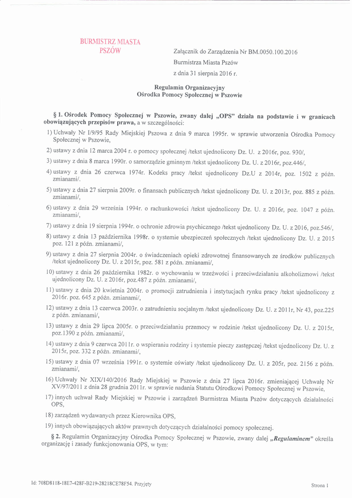 ----- BUR\lISIRZ MIASTA PSZÓW -------------~~~~~~~~~~~~~ Załącznik do Zarządzenia Nr BM.0050. 100.20 I6 Burmistrza Miasta Pszów z dnia 3 I sierpnia 20 I6 r. Regulamin Organizacyjny Ośrodka Pomocy Społecznej w Pszowie § 1. Ośrodek Pomocy Społecznej w Pszowie, zwany obowiązujących przepisów prawa, a w szczególności: dalej "OPS" działa na podstawie i w granicach I) Uchwały Nr I/9/95 Rady Miejskiej Pszowa z dnia 9 marca 1995r. w sprawie utworzenia Ośrodka Pomocy Społecznej w Pszowie, 2) ustawy z dnia 12 marca 2004 r. o pomocy społecznej /tekst ujednolicony Dz. U. z 20 l6r, poz. 930/, 3) ustawy z dnia 8 marca 1990r. o samorządzie gminnym /tekst ujednolicony Dz. U. z 20 16r, poz.446/, 4)ustawy z dnia 26 czerwca 1974r. Kodeks pracy /tekst ujednolicony OZ.U z 2014r, poz. 1502 z późno zmianami/. 5) ustawy z dnia 27 sierpnia 2009r. o finansach publicznych /tekst ujednolicony Dz. U. z 20 13r, poz. 885 z późno zmianami!, 6) ustawy z dnia 29 września 1994r. o rachunkowości /tekst ujednolicony Dz. U. z 2016r, poz. 1047 z późno zmianami/, 7) ustawy z dnia 19 sierpnia 1994r. o ochronie zdrowia psychicznego /tekst ujednolicony Dz. U. z 2016, poz.546/, 8) ustawy z dnia 13 października 1998r. o systemie ubezpieczeń społecznych /tekst ujednolicony Dz. U. z 2015 poz. 121 z późno zmianami!, 9) ustawy z dnia 27 sierpnia 2004r. o świadczeniach opieki zdrowotnej finansowanych ze środków publicznych /tekst ujednolicony Dz. U. z 20 15r, poz. 581 z późno zmianami!, 10) ustawy z dnia 26 października 1982r. o wychowaniu w trzeźwości i przeciwdziałaniu alkoholizmowi /tekst ujednolicony Dz. U. z 20 I6r, poz.487 z późno zmianami!, 11) ustawy z dnia 20 kwietnia 2004r. o promocj i zatrudnienia i instytucjach rynku pracy /tekst ujednolicony z 20 16r. poz. 645 z późno zmianami!, 12) ustawy z dnia 13 czerwca 2003r. o zatrudnieniu socjalnym /tekst ujednolicony Dz. U. z 2011r, Nr 43, poz.225 z późno zmianami!, 13) ustawy z dnia 29 lipca 2005r. o przeciwdziałaniu przemocy w rodzinie /tekst ujednolicony Dz. U. z 2015r, poz. I390 z późno zmianami/, 14) ustawy z dnia 9 czerwca 2011 r. o wspieraniu rodziny i systemie pieczy zastępczej /tekst ujednolicony Dz. U. z 2015r, poz. 332 z późno zmianami/, 15) ustawy z dnia 07 września 1991r. o systemie oświaty /tekst ujednolicony Dz. U. z 205r, poz. 2156 z późno zmianami!, 16) Uchwały Nr XIX/140/20 16 Rady Miejskiej w Pszowie z dnia 27 lipca 20 I6r. zmieniającej Uchwałę Nr XV/97/201 l z dnia 28 grudnia 2011r. w sprawie nadania Statutu Ośrodkowi Pomocy Społecznej w Pszowie, 17) innych uchwał Rady Miejskiej w Pszowie i zarządzeń Burmistrza Miasta Pszów dotyczących działalności OPS, 18) zarządzeń wydawanych przez Kierownika OPS, 19) innych obowiązujących aktów prawnych dotyczących działalności pomocy społecznej. § 2. Regulamin Organizacyjny Ośrodka Pomocy Społecznej w Pszowie, zwany dalej "Regulaminem" określa organizację i zasady funkcjonowania OPS, w tym: Id: 708D8118-18E7-428F-B219-28218CE78F54. Przyjęty Strona I - strukturę organizacyjną OPS, - podział zadań i kompetencje - postanowienia pracowników OPS, ogólne. § 3. Funkcjonowanie OPS podporządkowania, przydziału powierzonych zadań. opiera się na zasadach jednoosobowego kierownictwa czynności służbowych i indywidualnej odpowiedzialności za służbowego, wykonanie § 4. Pracą OPS zarządza Kierownik OPS wykonujący wszelkie czynności z zakresu prawa pracy wobec pozostałych pracowników OPS, czynności z zakresu prawa pracy wobec Kierownika OPS wykonuje Burmistrz Miasta. § 5. OPS w Pszowie realizuje: l. - zadania w zakresie pomocy społecznej, będące zadaniami ustawami albo wykonywane na podstawie porozumienia, 2. - inne zadania szczegó Iności: Miasta Pszów określone jako a) - ustawy z dnia 12 marca 2004r. o pomocy społecznej b) - ustawy z dnia 9 czerwca 2011 r. o wspieraniu 2016r, poz. 575 z późno zmianami!, c) - rozdziału 8a ustawy z dnia 7 września ze zmianami!, zadania Miasta Pszów - własne oraz zlecone - nałożone OPS, wynikające /tekst jednolity rodziny i systemie 1991 r. o systemie oświaty z przepisów prawa, w tym w OZ.U. z 20 16r. poz. 930/, pieczy zastępczej /tekst ujednolicony /tekst jednolity Dz. U. z Dz. U. z 20 15r, poz. 2156 3. - programy i projekty mające na celu ochronę poziomu życia ludności, zapobieganie marginalizacji, przeciwdziałanie ubóstwu oraz w miarę możliwości doprowadzanie do życiowego usamodzielnienia się osób i rodzin, zgodnie z obowiązującymi w tym zakresie przepisami prawa, w tym programów i projektów współfinansowanych środkami Unii Europejskiej zgodnie z obowiązującymi wytycznymi instytucji zarządzającej. § 6. 1. OPS jest czynny w dni robocze w godzinach od 7,30 do 15,30. 2. Pracownicy wykonujący pracę w środowisku przyjmują strony w siedzibie OPS w wyznaczonych pozostali pracownicy przyjmują strony w godzinach pracy OPS. 3. Kierownik OPS przyjmuje strony w ramach skarg i wniosków wcześniejszym ustaleniu terminu). 4. Szczegółowe OPS. zasady funkcjonowania OPS określają Struktura w poniedziałki instrukcje DZIALI. or~anizacyjna i zarządzenia - Kierownik - Księgowość OPS wyodrębnia się następujące wydawane 8,00 do 10,30 (po przez Kierownika OPS § 7. l. Dla pracowników OPS jest zakładem pracy w rozumieniu poszczególnych stanowisk pracy określają zakresy czynności pracowników. 2. W strukturze organizacyjnej w godzinach godzinach, przepisow stanowiska prawa pracy. Zadania dla pracy: OPS, OPS: Główny Księgowy, Referent - Kasjer, - Sekcja Pracy Socjalnej - pracownicy socjalni i specjaliści tym przeprowadzający rodzinne wywiady środowiskowe, - Sekcja świadczeń pracy socjalnej świadczący pracę w środowisku, w OPS, - Asystenci Rodziny, - Pracownik obsługi. 3. W celu realizacji zadań określonych w przepisach prawa dopuszcza się możliwość pracy - w zależności od potrzeb oraz w ramach posiadanych możliwości finansowych. 4. Sc
