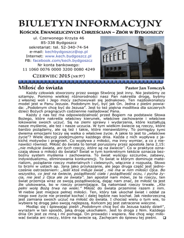 BIULETYN INFORMACYJNY KOŚCIÓŁ EWANGELICZNYCH CHRZEŚCIJAN – ZBÓR W BYDGOSZCZY ul. Czerwonego Krzyża 46 85-338 Bydgoszcz sekretariat: tel. 52-340-74-54 e-mail: [email protected] Internet: www.kech.bydgoszcz.pl FB: facebook.com/kech.bydgoszcz Nr konta bankowego: 11 1060 0076 0000 3200 0080 4249 CZERWIEC 2015 (NR 97) Miłość do świata Pastor Jan Tomczyk Każdy człowiek stworzony przez swego Stwórcę jest inny. Nie jesteśmy ze sztampy. Pomimo wielkiej różnorodności nasz Pan nakreśla drogę, byśmy z własnej woli i Jego mocy zachowywali się jednakowo. Ten najdoskonalszy model jest w Panu Jezusie. Podobnym być, być jak On. Jedna z pieśni powiada: „Podobnym chcę być do Jezusa”. Jest to też piękna modlitwa dla szczerych dzieci Bożych pragnących codziennie naśladować Pana. Każdy z nas też ma odpowiedzialność przed Bogiem na podstawie Słowa Bożego, które nakreśla właściwy kierunek, właściwe zachowanie i właściwe lokowanie swoich uczuć. Są na ziemi sprawy i wydarzenia, które kształtują nasze myślenie, ale też i nasze uczucia. W tym wielkim świecie są rzeczy, które bardzo pożądamy, ale są też i takie, które nienawidzimy. To pomiędzy tymi dwiema emocjami toczy się walka o właściwe życie. A jakie to jest to „właściwe życie”? Wiele decyzji podejmujemy każdego dnia. Każda z nich wypływa z jakichś motywów i pragnień. Co wypływa z miłości, ma inny wymiar, a co z nienawiści również. Miłość do świata to temat poruszony przez apostoła Jana 2,15: „nie miłujcie świata, ani tych rzeczy, które są na świecie”. Co w praktyce oznaczają słowa o miłości do świata? Świat w tym konkretnym tekście oznacza bezbożny system myślenia i zachowania. To świat wyścigu szczurów, zabawy, indywidualizmu, eliminowania konkurencji. To świat w którym dominuje materializm, pożądanie rzeczy materialnych i cielesnych, włącznie z rozpustą. Słowo to brzmi w ustach ap. Jana jako przykazanie, ale jego druga część jest jednocześnie ostrzeżeniem: „Jeśli ktoś miłuje świat , nie ma w nim miłości Ojca. Bo wszystko, co jest na świecie, pożądliwość ciała i pożądliwość oczu, i pycha życia, nie jest z Ojca ale ze świata”. Jan apostoł nam mówi, że te rzeczy, ten świat przemija wraz ze swoją pożądliwością, dając nam znać, że miłość ta jest źle ulokowana, bo w rzeczy przemijające. Są natomiast rzeczy trwałe. „Kto pełni wolę Bożą trwa na wieki.” Miłość do świata przeminie razem z nim. W niebie jest miejsce pełnej miłości. Ten, który tak ukochał świat i oddał za niego swe życie nie przestał kochać i dalej będzie nas kochał. Jak niedorzeczną jest zamiana swoich uczuć na miłość do świata. I chociaż wielu o tym wie, to wybiera tę drogę jako swoją najlepszą. Końcem jej jest zatracenie wieczne. Modląc się i śpiewając pieśń „Podobnym chcę być do Jezusa każdy dzień”, wyrażam w ten sposób, jaką drogę ukochałem. Jest to droga z Nim. Każdego dnia On jest ze mną i mi pomaga. On prowadzi i wspiera. Nie chcę więc miłować świata ani rzeczy, które na świecie są. Zachęcam do śpiewu tej pieśni. Informacje o spotkaniach Niedzielne nabożeństwa (godz. 10:00) 7.06.2015 r. – kazanie br. Tomasz Chyłka, pamiątka Wieczerzy Pańskiej; 14.06.2015 r. – kazanie br. Daniel Cichocki; 21.06.2015 r. – kazanie Pastor Jan Tomczyk; 28.06.2015 r. – kazanie gość; Po każdym niedzielnym nabożeństwie zapraszamy wszystkich obecnych do sali kominkowej na nieformalne rozmowy i dyskusje przy kawie i herbacie. Prosimy o wyłączenie telefonów komórkowych podczas nabożeństwa!!! Środowe studium biblijne (godz. 18:00) W każdą środę zapraszamy na studium biblijne w małej kaplicy naszego zboru. Pozostałe spotkania cykliczne młodzież i studenci – spotkania dla młodzieży i studentów w każdy piątek o godz. 18:00 w podziemiach budynku zboru; w programie każdego spotkania, wspólne śpiewanie, wykłady ze słowa Bożego, zabawy integracyjne, czas rozmów i nawiązywania relacji; informacje: Marcin Wojciechowski, kom. 663-357-719; spotkanie studenckie co dwa tygodnie w środę o godz. 19:00. zakończenie spotkań młodzieżowych: 27.06 br. (sobota) około godz. 10:00 zbiórka i wyjazd do Oćwieki; klub „Underground” – działa w każdy piątek w godz. 17:00-21:00 (z przerwą na spotkanie młodzieżowe) oraz w niedzielę po nabożeństwie; szkółka niedzielna – w każdą niedzielę, po pierwszej części nabożeństwa, wypełnionej uwielbieniem poprzez śpiew (około godz. 10:30) dzieci ze szkoły podstawowej przechodzą do sali naprzeciwko kaplicy, skąd jedna grupa (klasy I-III) przechodzi do budynku obok, a druga (klasy IV-VI) zostaje. Osobą odpowiedzialną za punkt katechetyczny w naszym zborze jest s. Dorota Kopczyńska. Do niej prosimy kierować wszelkie pytania; zakończenie szkółki: 21.06 br. „Dziupla malucha” – w czasie nabożeństwa rodzice z dziećmi w wieku od 0 do 6 lat mogą przejść do pomieszczenia na I piętrze, gdzie można wysłuchać przebiegu nabożeństwa przez głośnik; dzieci w wieku 5-6 lat mają krótką lekcję biblijną (trwa 15 min.) w pokoju pastorskim, potem są odprowadzane do „Dziupli malucha” na I piętrze; prosimy przyprowadzić dzieci po uwielbieniu w kaplicy (ok. godz. 10:30); zajęcia prowadzi s. Marlena Hypszer oraz s. Magda Siemaszko. Nabożeństwa w innych lokalizacjach Świecie nad Wisłą Adres placówki: ul. Mickiewicza 7. Nabożeństwa wg bieżących ustaleń. Piła Adres placówki: ul. Słowiańska 15, strona internetowa: www.ewangeliczni.org Nabożeństwa wg bieżących ustaleń. H 2 „Społeczność Chrześcijańska Fordon” (Bydgoszcz) spotkanie w grupie domowej w każdą niedzielę o godz. 10:00, kontakt br. Darek Szymkowiak, tel. 515-718-106; studium biblijne w dwóch grupach, w różnych dniach i godzinach wg bieżących ustaleń; we współpracy z naszym zborem dzia