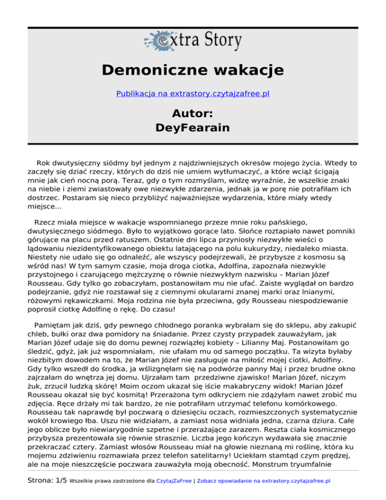 Demoniczne wakacje Publikacja na extrastory.czytajzafree.pl Autor: DeyFearain Rok dwutysięczny siódmy był jednym z najdziwniejszych okresów mojego życia. Wtedy to zaczęły się dziać rzeczy, których do dziś nie umiem wytłumaczyć, a które wciąż ścigają mnie jak cień nocną porą. Teraz, gdy o tym rozmyślam, widzę wyraźnie, że wszelkie znaki na niebie i ziemi zwiastowały owe niezwykłe zdarzenia, jednak ja w porę nie potrafiłam ich dostrzec. Postaram się nieco przybliżyć najważniejsze wydarzenia, które miały wtedy miejsce… Rzecz miała miejsce w wakacje wspomnianego przeze mnie roku pańskiego, dwutysięcznego siódmego. Było to wyjątkowo gorące lato. Słońce roztapiało nawet pomniki górujące na placu przed ratuszem. Ostatnie dni lipca przyniosły niezwykłe wieści o lądowaniu niezidentyfikowanego obiektu latającego na polu kukurydzy, niedaleko miasta. Niestety nie udało się go odnaleźć, ale wszyscy podejrzewali, że przybysze z kosmosu są wśród nas! W tym samym czasie, moja droga ciotka, Adolfina, zapoznała niezwykle przystojnego i czarującego mężczyznę o równie niezwykłym nazwisku – Marian Józef Rousseau. Gdy tylko go zobaczyłam, postanowiłam mu nie ufać. Zaiste wyglądał on bardzo podejrzanie, gdyż nie rozstawał się z ciemnymi okularami znanej marki oraz lnianymi, różowymi rękawiczkami. Moja rodzina nie była przeciwna, gdy Rousseau niespodziewanie poprosił ciotkę Adolfinę o rękę. Do czasu! Pamiętam jak dziś, gdy pewnego chłodnego poranka wybrałam się do sklepu, aby zakupić chleb, bułki oraz dwa pomidory na śniadanie. Przez czysty przypadek zauważyłam, jak Marian Józef udaje się do domu pewnej rozwiązłej kobiety – Lilianny Maj. Postanowiłam go śledzić, gdyż, jak już wspomniałam, nie ufałam mu od samego początku. Ta wizyta byłaby niezbitym dowodem na to, że Marian Józef nie zasługuje na miłość mojej ciotki, Adolfiny. Gdy tylko wszedł do środka, ja wślizgnęłam się na podwórze panny Maj i przez brudne okno zajrzałam do wnętrza jej domu. Ujrzałam tam przedziwne zjawisko! Marian Józef, niczym żuk, zrzucił ludzką skórę! Moim oczom ukazał się iście makabryczny widok! Marian Józef Rousseau okazał się być kosmitą! Przerażona tym odkryciem nie zdążyłam nawet zrobić mu zdjęcia. Ręce drżały mi tak bardzo, że nie potrafiłam utrzymać telefonu komórkowego. Rousseau tak naprawdę był poczwarą o dziesięciu oczach, rozmieszczonych systematycznie wokół krowiego łba. Uszu nie widziałam, a zamiast nosa widniała jedna, czarna dziura. Całe jego oblicze było niewiarygodnie szpetne i przerażające zarazem. Reszta ciała kosmicznego przybysza prezentowała się równie strasznie. Liczba jego kończyn wydawała się znacznie przekraczać cztery. Zamiast włosów Rousseau miał na głowie nieznaną mi roślinę, która ku mojemu zdziwieniu rozmawiała przez telefon satelitarny! Uciekłam stamtąd czym prędzej, ale na moje nieszczęście poczwara zauważyła moją obecność. Monstrum tryumfalnie Strona: 1/5 Wszelkie prawa zastrzeżone dla CzytajZaFree | Zobacz opowiadanie na extrastory.czytajzafree.pl stwierdziło, że nie mam dowodów na to, że jest kosmitą. Upierał się, że może przybrać każdą postać, a moje oskarżenia zostaną potraktowane jako majaczenie osoby cierpiącej na zaburzenia psychiczne. Co więcej, zagroził, że jeśli skalam jego dobre imię, on wyssie mózgi całej mojej rodzinie, a nie tylko ciotce Adolfinie, jak przedtem zamierzał. Przerażona widmem katastrofy postanowiłam działać, mimo grożącego mi niebezpieczeństwa ze strony kosmicznej kreatury. Wiedząc, że Rousseau wyspowiadał się przed ślubem u miejscowego proboszcza, księdza Stefana, zatrudniłam się na plebanii jako ogrodniczka. Zrobiłam to, gdyż wiedziałam, że ksiądz ten prowadzi pamiętniki ze spowiedzi. Poza tym ufałam, że w papierach przyszłego pana młodego odnajdę obciążające go dowody. Mój pierwszy dzień pracy u księdza przebiegł pomyślnie, choć nie obyło się bez pewnych komplikacji. Już wstępna rozmowa z proboszczem okazała się ryzykownym przedsięwzięciem. Przytoczę teraz jej fragment oraz zdarzenia, które nastąpiły po tej wymianie zdań: - To wspaniale, że zechciałaś się podjąć pracy przy moim ogrodzie! – rzekł uradowany ksiądz, przebierając się w ornat do mszy świętej. Zaznaczę, że chcąc nie chcąc, wykonywałam też robotę ministrantów. – Piękne kwiaty w ogrodzie zostały niestety zniszczone przez moje czarne kozy! – dodał ksiądz i posmutniał nagle. - Wiedziałam, że przydam się na coś! – powiedziałam z entuzjazmem. – Przeczytałam aż trzy poradniki dotyczące pielęgnacji roślin! - To bardzo dobrze. – rzekł ksiądz. – Podaj mi dziecko stułę. Spełniając prośbę proboszcza, dostrzegłam ze zgrozą, że w lustrze wiszącym naprzeciwko nas, nie obija się sylwetka księdza. Lepszego dowodu na demoniczne pochodzenie tej istoty nie było trzeba! Zastanawiałam się, co zrobił z prawdziwym księdzem. Obawiałam się najgorszego! Zachowałam jednak zimną krew i nie dałam po sobie poznać, jakiego odkrycia właśnie dokonałam. Nie czekając na rozwój wydarzeń, ciemną nocą zakradłam się na plebanię. Ksiądz proboszcz znany był ze swojego niewzruszonego snu, ufałam więc, że demon uczyni to samo, by odpowiednio wczuć się w rolę duchownego. Wcześniej dowiedziałam się, że w dużej, trzydrzwiowej szafie składał on swoje pamiętniki i dokumenty różnej maści. Gdy otworzyłam drzwi do pokoju księdza Stefana, zobaczyłam rzecz równie niezwykłą jak przeobrażenie Rousseau. Oto przez środek pokoju przepłynęła miękko dębowa trumna. Chwile później wniknęła w ścianę. Przez chwilę wpatrywałam się w ciemność, próbując się zastanowić, czy to zjawisko rzeczywiście miało miejsce. Starając się o tym nie myśleć, zabrałam się za przeszukiwanie szaf