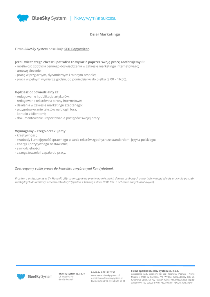Dział Marketingu Firma BlueSky System poszukuje SEO Copywriter. Jeżeli wiesz czego chcesz i potrafisz to wyrazić poprzez swoją pracę zaoferujemy Ci: - możliwość zdobycia cennego doświadczenia w zakresie marketingu internetowego; - umowę zlecenie; - pracę w przyjaznym, dynamicznym i młodym zespole; - praca w pełnym wymiarze godzin, od poniedziałku do piątku (8:00 – 16:00). Będziesz odpowiedzialny za: - redagowanie i publikacja artykułów; - redagowane tekstów na strony internetowe; - działania w zakresie marketingu szeptanego; - przygotowywanie tekstów na blogi i fora; - kontakt z Klientami; - dokumentowanie i raportowanie postępów swojej pracy. Wymagamy – czego oczekujemy: - kreatywności; - swobody i umiejętność sprawnego pisania tekstów zgodnych ze standardami języka polskiego; - energii i pozytywnego nastawienia; - samodzielności; - zaangażowania i zapału do pracy. Zastrzegamy sobie prawo do kontaktu z wybranymi Kandydatami. Prosimy o umieszczenie w CV klauzuli: „Wyrażam zgodę na przetwarzanie moich danych osobowych zawartych w mojej ofercie pracy dla potrzeb niezbędnych do realizacji procesu rekrutacji” (zgodnie z Ustawą z dnia 29.08.97r. o ochronie danych osobowych). BlueSky System sp. z o. o. Ul. Wspólna 40 61-479 Poznań Infolinia: 0 801 022 232 www: www.blueskysystem.pl e-mail: [email protected] fax: 61 625 69 99, tel: 61 625 69 81 Firma spółka: BlueSky System sp. z o.o. oznaczenie sadu rejonowego: Sad Rejonowy Poznań - Nowe Miasto i Wilda w Poznaniu VIII Wydział Gospodarczy KRS ul. Grochowe Łąki 6, 61-752 Poznań numer KRS 0000362986 kapitał zakładowy: 100 000,00 zł NIP: 7822509785 REGON 301524240