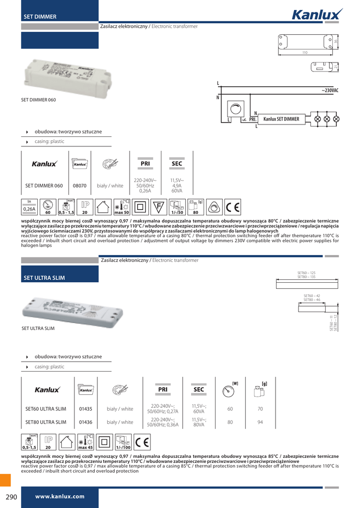 SET DIMMER 36 Zasilacz elektroniczny / Electronic transformer 21 110 L ~230VAC N SET DIMMER 060 L obudowa: tworzywo sztuczne N PRI. L Kanlux SET DIMMER casing: plastic SET DIMMER 060 0,26A 60 08070 0,5 - 1,5 biały / white 20 max 50 220-240V~ 50/60Hz 0,26A 11,5V~ 4,9A 60VA 1/-/50 80 współczynnik mocy biernej cosØ wynoszący 0,97 / maksymalna dopuszczalna temperatura obudowy wynosząca 80°C / zabezpieczenie termiczne wyłączające zasilacz po przekroczeniu temperatury 110°C / wbudowane zabezpieczenie przeciwzwarciowe i przeciwprzeciążeniowe / regulacja napięcia wyjściowego ściemniaczami 230V, przystosowanymi do współpracy z zasilaczami elektronicznymi do lamp halogenowych reactive power factor cosØ is 0,97 / max allowable temperature of a casing 80°C / thermal protection switching feeder off after themperature 110°C is exceeded / inbuilt short circuit and overload protection / adjustment of output voltage by dimmers 230V compatible with electric power supplies for halogen lamps Zasilacz elektroniczny / Electronic transformer SET60 – 125 SET80 – 135 SET ULTRA SLIM SET60 – 11 SET80 – 12 SET60 – 42 SET80 – 46 SET ULTRA SLIM obudowa: tworzywo sztuczne casing: plastic SET60 ULTRA SLIM 01435 biały / white 220-240V~; 50/60Hz; 0,27A 11,5V~; 60VA 60 70 SET80 ULTRA SLIM 01436 biały / white 220-240V~; 50/60Hz; 0,36A 11,5V~; 80VA 80 94 0,5-1,5 20 max 45 1/-/100 współczynnik mocy biernej cosØ wynoszący 0,97 / maksymalna dopuszczalna temperatura obudowy wynosząca 85°C / zabezpieczenie termiczne wyłączające zasilacz po przekroczeniu temperatury 110°C / wbudowane zabezpieczenie przeciwzwarciowe i przeciwprzeciążeniowe reactive power factor cosØ is 0,97 / max allowable temperature of a casing 85°C / thermal protection switching feeder off after themperature 110°C is exceeded / inbuilt short circuit and overload protection 290 www.kanlux.com