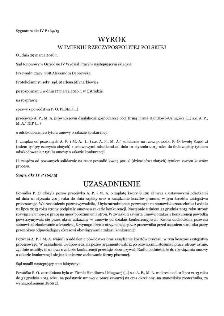 Sygnatura akt IV P 169/15 WYROK W IMIENIU RZECZYPOSPOLITEJ POLSKIEJ O., dnia 29 marca 2016 r. Sąd Rejonowy w Ostródzie IV Wydział Pracy w następującym składzie: Przewodniczący: SSR Aleksandra Dąbrowska Protokolant: st. sekr. sąd. Marlena Młynarkiewicz po rozpoznaniu w dniu 17 marca 2016 r. w Ostródzie na rozprawie sprawy z powództwa P. O. PESEL (...) przeciwko A. P., M. A. prowadzącym działalność gospodarczą pod firmą Firma Handlowo-Usługowa (...) s.c. A. P., M. A.” NIP (...) o odszkodowanie z tytułu umowy o zakazie konkurencji I. zasądza od pozwanych A. P. i M. A. (...) s.c. A. P., M. A.” solidarnie na rzecz powódki P. O. kwotę 8.400 zł (osiem tysięcy czterysta złotych) z ustawowymi odsetkami od dnia 01 stycznia 2015 roku do dnia zapłaty tytułem odszkodowania z tytułu umowy o zakazie konkurencji, II. zasądza od pozwanych solidarnie na rzecz powódki kwotę 900 zł (dziewięćset złotych) tytułem zwrotu kosztów procesu. Sygn. akt IV P 169/15 UZASADNIENIE Powódka P. O. złożyła pozew przeciwko A. P. i M. A. o zapłatę kwoty 8.400 zł wraz z ustawowymi odsetkami od dnia 01 stycznia 2015 roku do dnia zapłaty oraz o zasądzenie kosztów procesu, w tym kosztów zastępstwa procesowego. W uzasadnieniu pozwu wywodziła, iż była zatrudniona u pozwanych na stanowisku zootechnika i w dniu 01 lipca 2013 roku strony podpisały umowę o zakazie konkurencji. Następnie z dniem 31 grudnia 2013 roku strony rozwiązały umowę o pracę na mocy porozumienia stron. W związku z zawartą umową o zakazie konkurencji powódka powstrzymywała się przez okres wskazany w umowie od działań konkurencyjnych. Kwota dochodzona pozwem stanowi odszkodowanie w kwocie 25% wynagrodzenia otrzymanego przez pracownika przed ustaniem stosunku pracy przez okres odpowiadający okresowi obowiązywania zakazu konkurencji. Pozwani A. P. i M. A. wnieśli o oddalenie powództwa oraz zasądzenie kosztów procesu, w tym kosztów zastępstwa procesowego. W uzasadnieniu odpowiedzi na pozew argumentowali, iż po rozwiązaniu stosunku pracy, strony ustnie, zgodnie ustaliły, że umowa o zakazie konkurencji przestaje obowiązywać. Nadto podnieśli, że do rozwiązania umowy o zakazie konkurencji nie jest konieczne zachowanie formy pisemnej. Sąd ustalił następujący stan faktyczny: Powódka P. O. zatrudniona była w Firmie Handlowo-Usługowej (...) s.c. A. P., M. A. w okresie od 01 lipca 2013 roku do 31 grudnia 2013 roku, na podstawie umowy o pracę zawartej na czas określony, na stanowisku zootechnika, za wynagrodzeniem 2800 zł. (okoliczności bezsporne, dowód: umowa o pracę z 01 lipca 2013 r. k. 9) W dniu 01 lipca 2013 roku strony zawarły umowę o zakazie konkurencji, której przedmiotem było ustalenie obowiązków zootechnika, jako osoby pełniącej funkcje zawodowe w (...) w rozumieniu ustawy o działalności gospodarczej na podstawie umowy o pracę w zakresie dotyczącym zakazu prowadzenia działalności konkurencyjnej w stosunku do (...). W § 2 umowy o zakazie konkurencji, strony ustaliły, że w czasie pełnienia funkcji zootechnika, zootechnik jest zobowiązany do powstrzymywania się od podejmowania lub prowadzenia dodatkowej działalności zarobkowej, przez którą rozumie się odpłatne świadczenie pracy na podstawie umowy o pracę lub innego stosunku prawnego, a także prowadzenie wszelkiej działalności gospodarczej, zawodowej lub zarobkowej na własny lub cudzy rachunek. W czasie dwunastu miesięcy od dnia zaprzestania pełnienia funkcji zootechnika, zootechnik nie może zajmować się interesami konkurencyjnymi wobec (...) bez względu na ich formę, miejsce lub sposób prowadzenia, bezpośrednio lub pośrednio, samodzielnie lub niesamodzielnie, odpłatnie lub nieodpłatnie, w szczególności: - wykonywać lub świadczyć usług na rzecz innych osób lub ich przedsiębiorstw zorganizowanych w dowolnej formie prawnej na terenie powiatu (...), (...), (...) i (...) na podstawie stosunku pracy lub innego stosunku prawnego, jeżeli osoby te lub ich przedsiębiorstwa prowadzą interesy konkurencyjne wobec (...), - obejmować funkcji w organach zarządzających, kontrolnych lub stanowiących u innych osób lub w ich przedsiębiorstwach, na terenie powiatu (...), (...), (...) i (...), a takży wykonywać funkcji doradczych u tych osób i w tych przedsiębiorstwach, jeżeli osoby te lub ich przedsiębiorstwa prowadzą działalność konkurencyjną wobec (...), - podejmować i prowadzić działalności gospodarczej, zawodowej lub zarobkowej bezpośrednio lub pośrednio, na własny lub cudzy rachunek, jeżeli są to interesy konkurencyjne wobec (...), - dokonywać transakcji na własny lub cudzy rachunek, jeżeli wchodzą w zakres przedsiębiorstwa (...), - uczestniczyć w spółkach konkurencyjnych jako wspólnik, w szczególności przez wnoszenie wkładów, nabywanie lub podejmowanie akcji lub udziałów, - zatrudniać na podstawie stosunku pracy lub innego stosunku prawnego osób spośród wspólników lub personelu spółki na własny lub cudzy rachunek u osób lub w przedsiębiorstwach, które prowadzą interesy konkurencyjne wobec (...) (§ 3). Zgodnie z § 8 pkt 1 umowy zobowiązania zootechnika pozostaną w mocy po ustaniu stosunku pracy przez okres 12 miesięcy. W zamian za wykonywanie powyższego zobowiązania (...) wypłaci zootechnikowi odszkodowanie w kwocie 30% wynagrodzenia jakie zootechnik otrzymał w okresie 3 miesięcy bezpośrednio poprzedzającym ustanie stosunku pracy, lub jeśli okres stosunku pracy będzie krótszy niż 24 miesiące w wysokości 50% kwoty stanowiącej wynagrodzenie jakie otrzymał za ostatni pełny miesiąc pracy (odszkodowanie). Odszkodowanie będzie płatne po upływie 12-to miesięcznego okresu, o którym mowa w art. 1 . W punkcie 4 strony przewidziały, że niezwłocznie po ustaniu stosunku pracy (...) może jednostronnie zdecydować, że okres, o którym mowa w art. 1 będzie krótszy, zootechnik będzie zwolniony z obowiązku, o kt