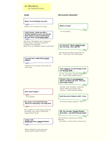 24. FEELING ILL ZŁE SAMOPOCZUCIE ADAM: RESTAURANT MANAGER: Boss, I’m not feeling very well. Szefie, nie za dobrze się czuję. I don’t know. I woke up with a terrible headache and a sore throat. And I think I’ve got a temperature. Do you think I could leave early? Nie wiem. Obudziłem się z okropnym bólem głowy i piekącym gardłem. I chyba mam gorączkę. Myśli Pan, że mógłbym wyjść wcześniej? What’s wrong? Co się dzieje? Is it that bad ? Maria called in sick this morning. She’s got flu. Jest aż tak źle? Maria dzwoniła, że jest chora dziś rano. Ma grypę. I’m sorry but I really think I won’t make it. Przykro mi, ale chyba naprawdę nie dam rady. Yeah. Hold on. I’ll ask Phoebe if she can do your shift. No tak. Poczekaj. Zapytam Phoebe czy może wziąć twoją zmianę. Phoebe! There is an emergency. Adam and Maria are sick . Can you stay longer today? Phoebe. Jest awaryjna sytuacja. Adam i Maria są chorzy. Czy możesz zostać dzisiaj dłużej? How much longer? O ile dłużej? No, sorry I can’t stay that long. But if it’s necessary I can stay till 8. Nie, przykro mi. Nie mogę zostać aż tak długo. Ale jeśli to konieczne mogę zostać do 20. I hope I will. Thank you boss, cheers Phoebs! Mam nadzieję, że się wykuruję. Dzięki szefie, dzięki Phoebs! Until the end of Adam’s shift – 9 pm. Do końca zmiany Adama – do 21. OK. Fair enough. Thanks Phoebe. And Adam – go home and get better ! OK. Powinno wystarczyć. Dzięki Phoebe. A ty Adam – idź do domu i kuruj się ! NOTES: 1. leave early = wyjść wcześniej (np. z pracy, ze spotkania) 2. call in sick = zadzwonić do pracy , że jest się chorym 3. I won’t make it = Nie dam rady I can make it = Dam radę 4. hold on / wait / hang on = zaczekaj 5. do / take somebody’s shift = wziąć czyjąś zmianę ( w zastępstwie) 6. an emergency = nagła, awaryjna sytuacja 7. „Dziękuję” możemy wyrazić różnymi słowami , w zależności od bliskości relacji Thank you – podstawowa , najbardziej oficjalna forma Thanks – mniej formalna, zbliżona do polskiego Dzięki Cheers – zupełnie nieformalna forma, stosowana tylko w relacjach koleżeńskich HOW MUCH DO YOU REMEMBER? - STEP 1 ADAM: RESTAURANT MANAGER: Boss, I’m not feeling very well. What’s wrong? Szefie, nie za dobrze się czuję. I don’t know. I woke up with a terrible headache and a sore throat. And I think I’ve got a temperature. Do you think I could 1. ? Nie wiem. Obudziłem się z okropnym bólem głowy i piekącym gardłem. I chyba mam gorączkę. Myśli Pan, że mógłbym wyjść wcześniej? Co się dzieje? Is it that bad ? Maria 2. this morning. She’s got flu. . Jest aż tak źle? Maria dzwoniła, że jest chora dziś rano. Ma grypę. I’m sorry but I really think 3 . . Przykro mi, ale chyba naprawdę nie dam rady. Yeah. 4. she can 5. . I’ll ask Phoebe if . No tak. Poczekaj. Zapytam Phoebe czy może wziąć twoją zmianę. Phoebe! There is 6. . Adam and Maria are sick . Can you stay longer today? Phoebe. Jest awaryjna sytuacja. Adam i Maria są chorzy. Czy możesz zostać dzisiaj dłużej? How much longer? Until the end of Adam’s shift – 9 pm. O ile dłużej? No, sorry I can’t stay that long. But if it’s necessary I can stay till 8. Nie, przykro mi. Nie mogę zostać aż tak długo. Ale jeśli to konieczne mogę zostać do 20. I hope I will. 7. boss, 7. Phoebs! Mam nadzieję, że się wykuruję. Dzięki szefie, dzięki Phoebs! Do końca zmiany Adama – do 21. OK. Fair enough. 7. Phoebe. And Adam – go home and get better ! OK. Powinno wystarczyć. Dzięki Phoebe. A ty Adam – idź do domu i kuruj się ! HOW MUCH DO YOU REMEMBER? - STEP 2 – Adam’s part ADAM: Szefie, nie za dobrze się czuję. Nie wiem. Obudziłem się z okropnym bólem głowy i piekącym gardłem. I chyba mam gorączkę. Myśli Pan, że mógłbym wyjść wcześniej? Przykro mi, ale chyba naprawdę nie dam rady. RESTAURANT MANAGER: What’s wrong? Is it that bad ? Maria called in sick this morning. She’s got flu. Yeah. Hold on. I’ll ask Phoebe if she can do your shift. Phoebe! There is an emergency. Adam and Maria are sick . Can you stay longer today? How much longer? O ile dłużej? Until the end of Adam’s shift – 9 pm. No, sorry I can’t stay that long. But if it’s necessary I can stay till 8. Nie, przykro mi. Nie mogę zostać aż tak długo. Ale jeśli to konieczne mogę zostać do 20. Mam nadzieję, że się wykuruję. Dzięki szefie, dzięki Phoebs! OK. Fair enough. Thanks Phoebe. And Adam – go home and get better !