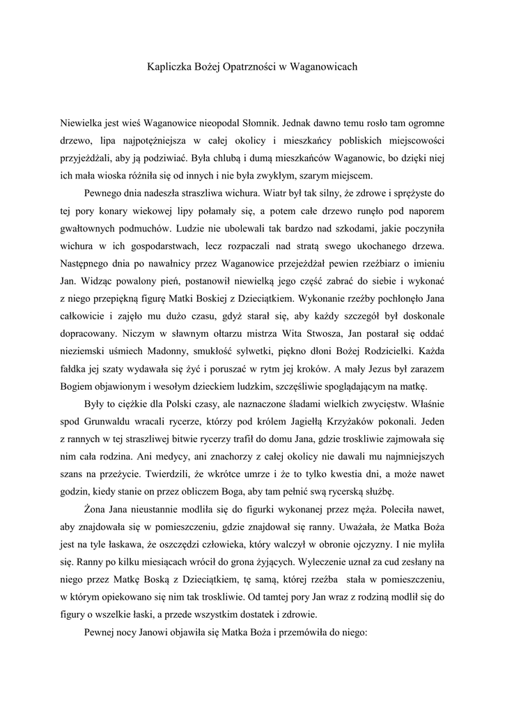 Kapliczka Bożej Opatrzności w Waganowicach Niewielka jest wieś Waganowice nieopodal Słomnik. Jednak dawno temu rosło tam ogromne drzewo, lipa najpotężniejsza w całej okolicy i mieszkańcy pobliskich miejscowości przyjeżdżali, aby ją podziwiać. Była chlubą i dumą mieszkańców Waganowic, bo dzięki niej ich mała wioska różniła się od innych i nie była zwykłym, szarym miejscem. Pewnego dnia nadeszła straszliwa wichura. Wiatr był tak silny, że zdrowe i sprężyste do tej pory konary wiekowej lipy połamały się, a potem całe drzewo runęło pod naporem gwałtownych podmuchów. Ludzie nie ubolewali tak bardzo nad szkodami, jakie poczyniła wichura w ich gospodarstwach, lecz rozpaczali nad stratą swego ukochanego drzewa. Następnego dnia po nawałnicy przez Waganowice przejeżdżał pewien rzeźbiarz o imieniu Jan. Widząc powalony pień, postanowił niewielką jego część zabrać do siebie i wykonać z niego przepiękną figurę Matki Boskiej z Dzieciątkiem. Wykonanie rzeźby pochłonęło Jana całkowicie i zajęło mu dużo czasu, gdyż starał się, aby każdy szczegół był doskonale dopracowany. Niczym w sławnym ołtarzu mistrza Wita Stwosza, Jan postarał się oddać nieziemski uśmiech Madonny, smukłość sylwetki, piękno dłoni Bożej Rodzicielki. Każda fałdka jej szaty wydawała się żyć i poruszać w rytm jej kroków. A mały Jezus był zarazem Bogiem objawionym i wesołym dzieckiem ludzkim, szczęśliwie spoglądającym na matkę. Były to ciężkie dla Polski czasy, ale naznaczone śladami wielkich zwycięstw. Właśnie spod Grunwaldu wracali rycerze, którzy pod królem Jagiełłą Krzyżaków pokonali. Jeden z rannych w tej straszliwej bitwie rycerzy trafił do domu Jana, gdzie troskliwie zajmowała się nim cała rodzina. Ani medycy, ani znachorzy z całej okolicy nie dawali mu najmniejszych szans na przeżycie. Twierdzili, że wkrótce umrze i że to tylko kwestia dni, a może nawet godzin, kiedy stanie on przez obliczem Boga, aby tam pełnić swą rycerską służbę. Żona Jana nieustannie modliła się do figurki wykonanej przez męża. Poleciła nawet, aby znajdowała się w pomieszczeniu, gdzie znajdował się ranny. Uważała, że Matka Boża jest na tyle łaskawa, że oszczędzi człowieka, który walczył w obronie ojczyzny. I nie myliła się. Ranny po kilku miesiącach wrócił do grona żyjących. Wyleczenie uznał za cud zesłany na niego przez Matkę Boską z Dzieciątkiem, tę samą, której rzeźba stała w pomieszczeniu, w którym opiekowano się nim tak troskliwie. Od tamtej pory Jan wraz z rodziną modlił się do figury o wszelkie łaski, a przede wszystkim dostatek i zdrowie. Pewnej nocy Janowi objawiła się Matka Boża i przemówiła do niego: – Janie, pragnę, abyś mnie oddał do kościoła, gdzie będą mogli nawiedzać mnie wszyscy ludzie. Jan zlekceważył jednak zalecenia Matki Boskiej, gdyż nie chciał, aby innym powodziło się w życiu równie dobrze jak jemu. Na gniew Boży nie trzeba było długo czekać. W krótkim czasie po objawieniu nadeszła straszna ulewa. Deszcz padał bez przerwy przez kilka dni i nocy. Zalał pobliskie wioski, a nurt płynącej wody zabrał figurkę Matki Bożej z Dzieciątkiem aż do Waganowic. Gdy woda opadła, figura Madonny z Dzieciątkiem osiadła dokładnie w miejscu, gdzie rosła złamana przed laty lipa, z której rzeźbiarz wykonał figurkę. Mieszkańcy na pamiątkę tego wydarzenia postanowili w tym miejscu wybudować drewnianą kapliczkę i umieścić w niej Matkę Bożą z Dzieciątkiem. W podzięce za to, że w czasie powodzi nie zginął żaden z mieszkańców Waganowic, nazwano ją Kapliczką Bożej Opatrzności.