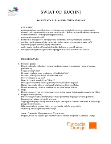ŚWIAT OD KUCHNI WARSZTATY KULINARNE- CHINY 17.01.2013 CEL ZAJĘĆ − przeciwdziałanie uprzedzeniom, przełamywanie stereotypów poprzez poznawanie nowych osób reprezentujących inne narodowości i kultury w sposób aktywny (poprzez wspólne działanie i w bezpiecznej przestrzeni) − poznawanie nowych osób − kształcenie umiejętności nawiązywania kontaktu z nowo poznanymi osobami − przełamywanie postawy lęku i wrogości wobec nowo poznawanych osób, osób reprezentujących szeroko pojętą odmienność − zdobywanie wiedzy o Chinach i chińskiej kulturze w sposób aktywny − rozwijanie umiejętności gotowania i przygotowywania posiłków dla innych PRZEBIEG ZAJĘĆ 1. Poznanie gościa Dzieci zadawały Hubertowi różne pytania dotyczące jego samego i kraju z którego pochodzi np. Co jest stolicą Chin? Ile czasu zajęłaby jazda pociągiem z Polski do Chin? Ile czasu leci się samolotem z Polski do Chin? Czy w Chinach je się psy? Iloma językami mówi się w Chinach? Dlaczego w chińskiej telewizji muszą być wyświetlane napisy? Hubert opowiadał także o obchodach chińskiego Nowego Roku. Dzieci poznawały chińskie znaki ucząc się pisać swoje imiona. 2. Mapa Dzieci zaznaczyły na przygotowanej przez siebie mapie świata gdzie znajdują się Chiny 3. Przygotowanie potrawy Dzieci przygotowały z Hubertem produkty potrzebne do przygotowania potrawy. Przygotowały ciasto na kluski oraz sos. Najprzyjemniejszą częścią warsztatów było rozciąganie ciasta na makaron. Każdy mógł przyjść i się dołączyć. Gdy potrawa była gotowa dzieci przygotowały stół dla wszystkich. Warsztaty zakończyła wspólna kolacja. Autor: Pracownia Alternatywnego Wychowania Projekt „Świat od kuchni” jest realizowany w ramach programu Akademia Orange LISTA UCZESTNIKÓW: 1.Aleksandra Cymer 2.Maciej Kozłowski 3.Paulina Ziółkowska 4.Marta Ziółkowska 5.Bartek Sobuń 6.Marcin Chojnacki 7.Grzegorz Pasikowski 8.Justyna Różalska 9.Paulina Rynkiewicz 10. Franciszek Charliński 11. Aleksandra Zawadowska 12. Paulina Milczarek 13. Ewelina Wieczorek 14. Patrycja Siekiera 15. Karina Lubczyńska 16. Patrycja Kozanecka 17. Hanna Janczak 18. Oliwia Szambelan 19. Julia Szambelan 20. Martyna Milczarek 21. Dawid Nowak 22. Jakub Pilarz 23. Andrzej Kozłowski 24. Ganda Reszka 25.Oliwia Jukiel 26. Dawid Jukiel 27. Gabrysia Budzyńska 28. Miłosz Szambelan 29. Hubert Pilarz 30. Franciszek Janczak 31.Mikołaj Sobuń