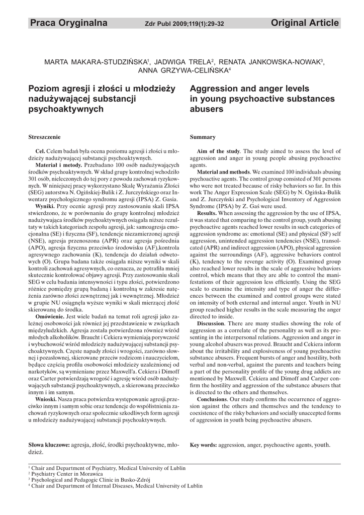 Praca Oryginalna Zdr Publ 2009;119(1):29-32 Original Article MARTA MAKARA-STUDZIŃSKA1, JADWIGA TRELA 2, RENATA JANKOWSKA-NOWAK3, ANNA GRZYWA-CELIŃSKA4 Poziom agresji i złości u młodzieży nadużywającej substancji psychoaktywnych Aggression and anger levels in young psychoactive substances abusers Streszczenie Summary Cel. Celem badań była ocena poziomu agresji i złości u młodzieży nadużywającej substancji psychoaktywnych. Materiał i metody. Przebadano 100 osób nadużywających środków psychoaktywnych. W skład grupy kontrolnej wchodziło 301 osób, nieleczonych do tej pory z powodu zachowań ryzykownych. W niniejszej pracy wykorzystano Skalę Wyrażania Złości (SEG) autorstwa N. Ogińskiej-Bulik i Z. Jurczyńskiego oraz Inwentarz psychologicznego syndromu agresji (IPSA) Z. Gasia. Wyniki. Przy ocenie agresji przy zastosowaniu skali IPSA stwierdzono, że w porównaniu do grupy kontrolnej młodzież nadużywająca środków psychoaktywnych osiągała niższe rezultaty w takich kategoriach zespołu agresji, jak: samoagresja emocjonalna (SE) i fi zyczna (SF), tendencje niezamierzonej agresji (NSE), agresja przenoszona (APR) oraz agresja pośrednia (APO), agresja fi zyczna przeciwko środowisku (AF),kontrola agresywnego zachowania (K), tendencja do działań odwetowych (O). Grupa badana także osiągała niższe wyniki w skali kontroli zachowań agresywnych, co oznacza, ze potrafi ła mniej skutecznie kontrolować objawy agresji. Przy zastosowaniu skali SEG w celu badania intensywności i typu złości, potwierdzono różnice pomiędzy grupą badaną i kontrolną w zakresie natężenia zarówno złości zewnętrznej jak i wewnętrznej. Młodzież w grupie NU osiągnęła wyższe wyniki w skali mierzącej złość skierowaną do środka. Omówienie. Jest wiele badań na temat roli agresji jako zależnej osobowości jak również jej przedstawienie w związkach międzyludzkich. Agresja została potwierdzona również wśród młodych alkoholików. Braucht i Cekiera wymieniają porywczość i wybuchowość wśród młodzieży nadużywającej substancji psychoaktywnych. Częste napady złości i wrogości, zarówno słownej i pozasłownej, skierowane przeciw rodzicom i nauczycielom, będące częścią profilu osobowości młodzieży uzależnionej od narkotyków, są wymieniane przez Maxwell’a. Cekiera i Dimoff oraz Carter potwierdzają wrogość i agresję wśród osób nadużywających substancji psychoaktywnych, a skierowaną przeciwko innym i im samym. Wnioski. Nasza praca potwierdza występowanie agresji.przeciwko innym i samym sobie oraz tendencje do współistnienia zachowań ryzykownych oraz społecznie szkodliwych form agresji u młodzieży nadużywającej substancji psychoaktywnych. Aim of the study. The study aimed to assess the level of aggression and anger in young people abusing psychoactive agents. Material and methods. We examined 100 individuals abusing psychoactive agents. The control group consisted of 301 persons who were not treated because of risky behaviors so far. In this work The Anger Expression Scale (SEG) by N. Ogińska-Bulik and Z. Jurczyński and Psychological Inventory of Aggression Syndrome (IPSA) by Z. Gaś were used. Results. When assessing the aggression by the use of IPSA, it was stated that comparing to the control group, youth abusing psychoactive agents reached lower results in such categories of aggression syndrome as: emotional (SE) and physical (SF) self aggression, unintended aggression tendencies (NSE), transolcated (APR) and indirect aggression (APO), physical aggression against the surroundings (AF), aggressive behaviors control (K), tendency to the revenge activity (O). Examined group also reached lower results in the scale of aggressive behaviors control, which means that they are able to control the manifestations of their aggression less efficiently. Using the SEG scale to examine the intensity and type of anger the differences between the examined and control groups were stated on intensity of both external and internal anger. Youth in NU group reached higher results in the scale measuring the anger directed to inside. Discussion. There are many studies showing the role of aggression as a correlate of the personality as well as its presenting in the interpersonal relations. Aggression and anger in young alcohol abusers was proved. Braucht and Cekiera inform about the irritability and explosiveness of young psychoactive substance abusers. Frequent bursts of anger and hostility, both verbal and non-verbal, against the parents and teachers being a part of the personality profile of the young drug addicts are mentioned by Maxwell. Cekiera and Dimoff and Carper confi rm the hostility and aggression of the substance abusers that is directed to the others and themselves. Conclusions. Our study confi rms the occurrence of aggression against the others and themselves and the tendency to coexistence of the risky behaviors and socially unaccepted forms of aggression in youth being psychoactive abusers. Słowa kluczowe: agresja, złość, środki psychoaktywne, młodzież. Key words: aggression, anger, psychoactive agents, youth. 1 Chair and Department of Psychiatry, Medical University of Lublin Psychiatry Center in Morawica 3 Psychological and Pedagogic Clinic in Busko-Zdrój 4 Chair and Department of Internal Diseases, Medical University of Lublin 2 30 BACKGROUND Many risk factors of the psychoactive substances using by the youth have been listed in the literature. Windle et al. [1] distinguished five fields to which they attribute risk factors of adolescents drinking alcohol, depending on their social location so: socio-environmental factors, school, family, peers and individual. Youth confessing to drinking of big amounts of alcohol is characterized by the combination of personality attributes indicating low self-control level and tolerance attitudes towards behaviors different from the norm, lower evaluation and expectation of succ