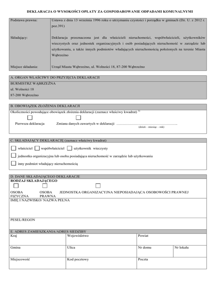 DEKLARACJA O WYSOKOŚCI OPŁATY ZA GOSPODAROWANIE ODPADAMI KOMUNALNYMI Ustawa z dnia 13 września 1996 roku o utrzymaniu czystości i porządku w gminach (Dz. U. z 2012 r. Podstawa prawna: poz.391) Składający: Deklaracja przeznaczona jest dla właścicieli nieruchomości, współwłaścicieli, użytkowników wieczystych oraz jednostek organizacyjnych i osób posiadających nieruchomość w zarządzie lub użytkowaniu, a także innych podmiotów władających nieruchomością położonych na terenie Miasta Wąbrzeźno Miejsce składania: Urząd Miasta Wąbrzeźno, ul. Wolności 18, 87-200 Wąbrzeźno A. ORGAN WŁAŚCIWY DO PRZYJĘCIA DEKLARACJI BURMISTRZ WĄBRZEŹNA ul. Wolności 18 87-200 Wąbrzeźno B. OBOWIĄZEK ZŁOŻENIA DEKLARACJI Okoliczności powodujące obowiązek złożenia deklaracji (zaznacz właściwy kwadrat) 1) Pierwsza deklaracja Zmiana danych zawartych w deklaracji ………………………………………….. (dzień – miesiąc – rok) C. SKŁADAJĄCY DEKLARACJĘ (zaznacz właściwy kwadrat) właściciel współwłaściciel użytkownik wieczysty jednostka organizacyjna lub osoba posiadająca nieruchomość w zarządzie lub użytkowaniu inny podmiot władający nieruchomością D. DANE SKŁADAJĄCEGO DEKLARACJE RODZAJ SKŁADAJĄCEGO OSOBA OSOBA JEDNOSTKA ORGANIZACYJNA NIEPOSIADAJĄCA OSOBOWOŚCI PRAWNEJ FIZYCZNA PRAWNA IMIĘ I NAZWISKO/ NAZWA PEŁNA PESEL/REGON E. ADRES ZAMIESZKANIA/ADRES SIEDZIBY Kraj Województwo Powiat Gmina Ulica Nr domu Miejscowość Kod pocztowy Poczta Nr lokalu F. ADRES NIERUCHOMOŚCI NA KTÓREJ POWSTAJĄ ODPADY KOMUNALNE Kraj Województwo Powiat Gmina Ulica Nr domu Miejscowość Kod pocztowy Poczta Nr lokalu Nr ewidencyjny działki G. WYSOKOŚĆ OPŁATY ZA GOSPODAROWANIE ODPADAMI KOMUNALNYMI 1. Dotyczy właścicieli nieruchomości zamieszkałych Oświadczam, że na terenie nieruchomości wskazanej w części F niniejszej deklaracji: 1. Jest zameldowanych 2. Zamieszkuje osób. osób. Wyliczenie miesięcznej opłaty: ………………………………… X ………………………………….. = ………………………………………….. zł (liczba mieszkańców) (stawka opłaty) (iloczyn liczby mieszkańców i stawki opłaty) Wysokość opłaty miesięcznej za gospodarowanie odpadami komunalnymi wynosi słownie:…………..…………………………zł 2. Dotyczy właścicieli nieruchomości niezamieszkałych, na których powstają odpady Oświadczam, że na terenie nieruchomości wskazanej w części F niniejszej deklaracji odpady komunalne niesegregowane (zmieszane) gromadzone są w następujących pojemnikach: Wyliczenie miesięcznej opłaty: 1. ………………………………… X ………………………………….. = ………………………………………….. zł (miesięczna liczba pojemników 60 l) (stawka opłaty) (iloczyn liczby pojemników i stawki opłaty) 2. ………………………………… X ………………………………….. = ………………………………………….. zł (miesięczna liczba pojemników 120 l) (stawka opłaty) (iloczyn liczby pojemników i stawki opłaty) 3. ………………………………… X ………………………………….. = ………………………………………….. zł (miesięczna liczba pojemników 240 l) (stawka opłaty) (iloczyn liczby pojemników i stawki opłaty) 4. ………………………………… X ………………………………….. = ………………………………………….. zł (miesięczna liczba pojemników 360 l) (stawka opłaty) (iloczyn liczby pojemników i stawki opłaty) 5. ………………………………… X ………………………………….. = ………………………………………….. zł (miesięczna liczba pojemników 600 l) (stawka opłaty) (iloczyn liczby pojemników i stawki opłaty) 6. ………………………………… X ………………………………….. = ………………………………………….. zł (miesięczna liczba pojemników 1100 l) (stawka opłaty) (iloczyn liczby pojemników i stawki opłaty) Wysokość opłaty miesięcznej za gospodarowanie odpadami komunalnymi wynosi łącznie………………………………………..zł (należy wpisać sumę z poz. 1-6) (słownie: ……………………………………………………………………………………………………………………………….) 3. Dotyczy właścicieli nieruchomości, których część nieruchomości, stanowi nieruchomość, o której mowa w pkt 1, a w części nieruchomość, o której mowa w pkt 2. Oświadczam, że wysokość opłaty miesięcznej za gospodarowanie odpadami komunalnymi, zgodnie z lit. G pkt 1 i 2 wynosi: ……………………………………..……….. zł (należy wpisać sumę opłat z punktu 1 i 2) (słownie: ……………………………………………………………………………………………………………………………….) H. ZAŁĄCZNIK 1. Kopia obowiązującej umowy zawartej z przedsiębiorcą na odbieranie odpadów komunalnych – obowiązkowo do pierwszej deklaracji. 2) I. PODPIS SKŁADAJĄCEGO DEKLARACJĘ ................................................ (miejscowość i data) ..................................................... (czytelny podpis) J. ADNOTACJE ORGANU Pouczenie: 1. Deklaracja stanowi podstawę do wystawienia tytułu wykonawczego zgodnie z przepisami ustawy z dnia 17 czerwca 1996 r. o postępowaniu egzekucyjnym w administracji (Dz. U. z 2005 r. Nr 229, poz. 1954 z późn.zm.) 2. Właściciel nieruchomości jest obowiązany złożyć do Burmistrza Wąbrzeźna deklarację o wysokości opłaty za gospodarowanie odpadami komunalnymi w terminie 14 dni od dnia zamieszkania na danej nieruchomości pierwszego mieszkańca lub powstania na danej nieruchomości odpadów komunalnych. 3. Pierwszą deklarację należy złożyć do dnia 10 listopada 2012 r. 4. W przy