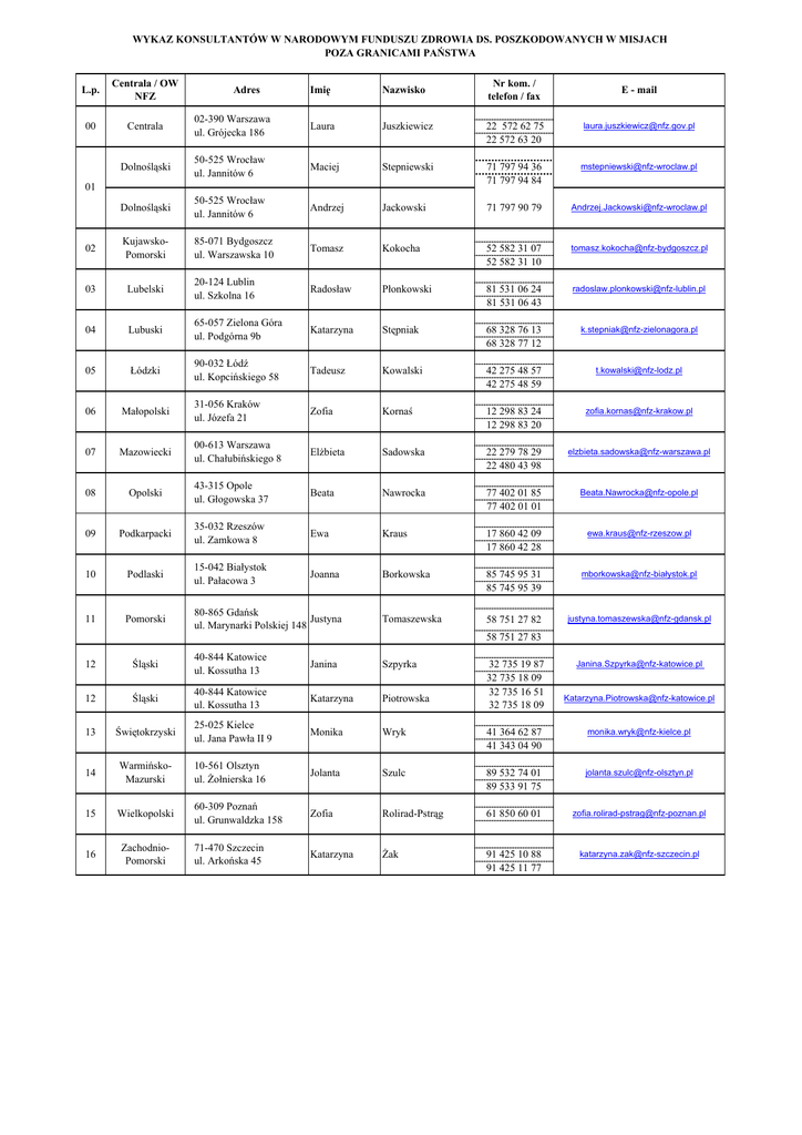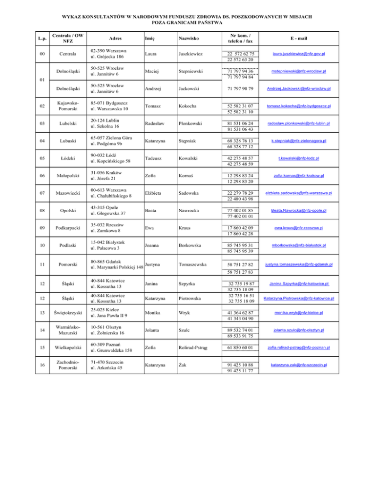 WYKAZ KONSULTANTÓW W NARODOWYM FUNDUSZU ZDROWIA DS. POSZKODOWANYCH W MISJACH POZA GRANICAMI PAŃSTWA L.p. Centrala / OW NFZ 00 Centrala Adres Nr kom. / telefon / fax Imię Nazwisko 02-390 Warszawa ul. Grójecka 186 Laura Juszkiewicz 22 572 62 75 22 572 63 20 [email protected] Dolnośląski 50-525 Wrocław ul. Jannitów 6 Maciej Stepniewski 71 797 94 36 71 797 94 84 [email protected] Dolnośląski 50-525 Wrocław ul. Jannitów 6 Andrzej Jackowski 71 797 90 79 [email protected] 02 KujawskoPomorski 85-071 Bydgoszcz ul. Warszawska 10 Tomasz Kokocha 52 582 31 07 52 582 31 10 [email protected] 03 Lubelski 20-124 Lublin ul. Szkolna 16 Radosław Płonkowski 81 531 06 24 81 531 06 43 [email protected] 04 Lubuski 65-057 Zielona Góra ul. Podgórna 9b Katarzyna Stępniak 68 328 76 13 68 328 77 12 [email protected] 05 Łódzki 90-032 Łódź ul. Kopcińskiego 58 Tadeusz Kowalski 42 275 48 57 42 275 48 59 [email protected] 06 Małopolski 31-056 Kraków ul. Józefa 21 Zofia Kornaś 12 298 83 24 12 298 83 20 [email protected] 07 Mazowiecki 00-613 Warszawa ul. Chałubińskiego 8 Elżbieta Sadowska 22 279 78 29 22 480 43 98 [email protected] 08 Opolski 43-315 Opole ul. Głogowska 37 Beata Nawrocka 77 402 01 85 77 402 01 01 [email protected] 09 Podkarpacki 35-032 Rzeszów ul. Zamkowa 8 Ewa Kraus 17 860 42 09 17 860 42 28 [email protected] 10 Podlaski 15-042 Białystok ul. Pałacowa 3 Joanna Borkowska 85 745 95 31 85 745 95 39 mborkowska@nfz-białystok.pl 11 Pomorski 80-865 Gdańsk Justyna ul. Marynarki Polskiej 148 Tomaszewska 58 751 27 82 [email protected] 01 E - mail 58 751 27 83 12 Śląski 40-844 Katowice ul. Kossutha 13 Janina Szpyrka 12 Śląski 40-844 Katowice ul. Kossutha 13 Katarzyna Piotrowska 13 Świętokrzyski 25-025 Kielce ul. Jana Pawła II 9 Monika Wryk 41 364 62 87 41 343 04 90 [email protected] 14 WarmińskoMazurski 10-561 Olsztyn ul. Żołnierska 16 Jolanta Szulc 89 532 74 01 89 533 91 75 [email protected] 15 Wielkopolski 60-309 Poznań ul. Grunwaldzka 158 Zofia Rolirad-Pstrąg 61 850 60 01 [email protected] 16 ZachodnioPomorski 71-470 Szczecin ul. Arkońska 45 Katarzyna Żak 91 425 10 88 91 425 11 77 [email protected] 32 735 19 87 32 735 18 09 32 735 16 51 32 735 18 09 [email protected] [email protected]
