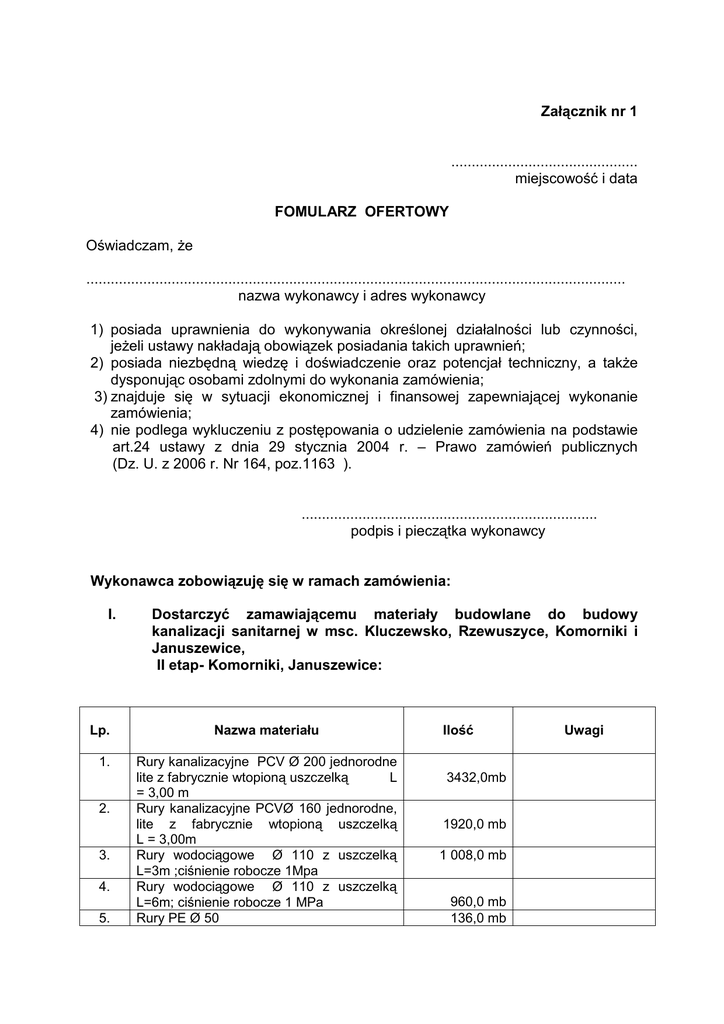 Załącznik nr 1 .............................................. miejscowość i data FOMULARZ OFERTOWY Oświadczam, Ŝe ..................................................................................................................................... nazwa wykonawcy i adres wykonawcy 1) posiada uprawnienia do wykonywania określonej działalności lub czynności, jeŜeli ustawy nakładają obowiązek posiadania takich uprawnień; 2) posiada niezbędną wiedzę i doświadczenie oraz potencjał techniczny, a takŜe dysponując osobami zdolnymi do wykonania zamówienia; 3) znajduje się w sytuacji ekonomicznej i finansowej zapewniającej wykonanie zamówienia; 4) nie podlega wykluczeniu z postępowania o udzielenie zamówienia na podstawie art.24 ustawy z dnia 29 stycznia 2004 r. – Prawo zamówień publicznych (Dz. U. z 2006 r. Nr 164, poz.1163 ). ......................................................................... podpis i pieczątka wykonawcy Wykonawca zobowiązuję się w ramach zamówienia: I. Lp. 1. 2. 3. 4. 5. Dostarczyć zamawiającemu materiały budowlane do budowy kanalizacji sanitarnej w msc. Kluczewsko, Rzewuszyce, Komorniki i Januszewice, II etap- Komorniki, Januszewice: Nazwa materiału Rury kanalizacyjne PCV Ø 200 jednorodne lite z fabrycznie wtopioną uszczelką L = 3,00 m Rury kanalizacyjne PCVØ 160 jednorodne, lite z fabrycznie wtopioną uszczelką L = 3,00m Rury wodociągowe Ø 110 z uszczelką L=3m ;ciśnienie robocze 1Mpa Rury wodociągowe Ø 110 z uszczelką L=6m; ciśnienie robocze 1 MPa Rury PE Ø 50 Ilość 3432,0mb 1920,0 mb 1 008,0 mb 960,0 mb 136,0 mb Uwagi 6. Pompownia ścieków P-1, P-2, kompletne wg załączonych rysunków. 7. 8. 9. 10. Rury stalowe osłonowe Ø 300 L 6m Rury stalowe osłonowe Ø 200 L 6m Kręgi betonowe Ø 1200 Pokrywa nastudzienna Ø 1400 z otworem Ø 600 Właz Ŝeliwny kanalizacyjny typu cięŜkiego Pompownia Pd-1, Pd-2, wg załączonych rysunków Manszeta DN 200*350 Manszeta DN 150*250 Kineta z króćcami kielichowymi umoŜliwiającymi zmianę kierunku nastawienia + / - 7,5°w ka Ŝdej płaszczyźnie z fabrycznie wtopioną uszczelką zbiorcza 11. 12. 13. 14. 15. 16. 17. 18. 19. 20. 21. 22. P-3 Ø 200 x 200 Ø 600 ∡ 45º + pierścień odciąŜający + właz B-125 Kineta z króćcami kielichowymi umoŜliwiającymi zmianę kierunku nastawienia + / - 7,5°w ka Ŝdej płaszczyźnie z fabrycznie wtopioną uszczelką zbiorcza Ø 200 x 160 Ø 600 ∡ 45º + pierścień odciąŜający + właz B-125 Kineta z króćcami kielichowymi umoŜliwiającymi zmianę kierunku nastawienia + / - 7,5°w ka Ŝdej płaszczyźnie z fabrycznie wtopioną uszczelką przelotowa Ø 200 Ø 600 + pierścień odciąŜający + właz Ŝeliwny B-125 Kineta z fabrycznie wtopioną uszczelką przelotowa Ø 160 Ø 400 + adapter teleskopowy umoŜliwiający dokładne ustalenie wysokości studzienki z włazem A -15 Kineta z z fabrycznie wtopioną uszczelką zbiorcza Ø160x160 Ø 400∡ 45º+ adapter teleskopowy umoŜliwiający dokładne ustalenie wysokości studzienki z włazem A -15 Korek Ø 200 Korek Ø 160 186,0 mb 246,0 mb 5 szt. 2 szt. 2 szt. 2 szt. 42 szt. 38 szt. 12 kpl. 35 kpl. 88 kpl. 114 kpl. 4 kpl. Kolano Ø 200 ∡ 45º 40 szt. 150 szt. 70 szt. 23. Kolano Ø 200 ∡ 30º 15 szt. 24. Kolano Ø 200 ∡ 15º 25 szt. 25. Kolano Ø 160 ∡ 45º 80 szt. 26. Kolano Ø 160 ∡ 30º 6 szt. 27. Kolano kanalizacyjne Ø 160 ∡ 15º 28. Rura trzonowa karbowana Ø 600 L =6 m 10 szt. 327 mb. 29. 30. 31. 32. 33. 34. 35. do kinet z poz.15,16,17 Rura trzonowa gładka Ø 400 L= 6m, do kinet z poz. 18,19 Redukcja kanalizacyjna 200 x 160 Wkładka in situ Ø 200 Wkładka in situ Ø 160 Wkładka in situ Ø 50 Trójnik Ø 200 x 160 143 mb. 20 szt. 1 szt. 24 szt. 1 szt. 12 szt. Łuk PCV Ø 110 ∡ 90º ciśnienie robocze 1MPa 8 szt. 36. Łuk PCV Ø 110 ∡ 45º 8 szt. 37. Łuk PCV Ø 110 ∡ 30º 5 szt. 38. Łuk PCV Ø 110 ∡ 15º Trójnik PCV Ø 110 x 110 ciśnienie robocze 1 MPa Trójnik PCV Ø 110 ciśnienie robocze 1MPa 7 szt. 39. 40. 2 szt. 10 szt. Ogólna cena brutto (łącznie z podatkiem VAT) za cały przedmiot zamówienia (wynosi:.......................................................................................................................... . słownie (brutto) łącznie z VAT............................................................................................. ………………………………………………………………………………………………… …… Wykonawca udziela Zamawiającemu gwarancji na oferowane materiały budowlane na okres zgodny z zapisami kodeksu cywilnego. Oświadczam, Ŝe stanowiący załączniku nr 2 do specyfikacji – wzór umowy, został przez mnie zaakceptowany i zobowiązuję się w przypadku wyboru mojej oferty do zawarcia umowy w miejscu i terminie wyznaczonym przez Zamawiającego. ......................................................................... podpis i pieczątka wykonawcy