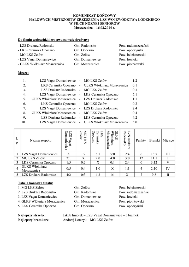 KOMUNIKAT KOŃCOWY HALOWYCH MISTRZOSTW ZRZESZENIA LZS WOJEWÓDZTWA ŁÓDZKIEGO W PIŁCE NOśNEJ SENIORÓW Moszczenica – 16.02.2014 r. Do finału wojewódzkiego awansowały druŜyny: - LZS Drukarz Radomsko - LKS Ceramika Opoczno - MG LKS Zelów - LZS Vagat Domaniewice - GLKS Włókniarz Moszczenica Gm. Radomsko Gm. Opoczno Gm. Zelów Gm. Domaniewice Gm. Moszczenica Pow. radomszczański Pow. opoczyński Pow. bełchatowski Pow. łowicki Pow. piotrkowski Mecze: 1. 2. 3. 4. 5. 6. 7. 8. 9. 10. LZS Drukarz Radomsko 5 GLKS Włókniarz Moszczenica 4 X 2:1 1:5 1:2 X 0:2 5:1 2:0 X 5:0 4:0 0:1 2:4 3:0 2:4 6 12 0 13:7 11:1 3:12 III I V 0:5 0:4 1:0 X 1:1 4 2:10 IV 4:2 0:3 4:2 1:1 X 7 9:8 II LZS Vagat Domaniewice MG LKS Zelów LKS Ceramika Opoczno GLKS Włókniarz Moszczenica LZS Drukarz Radomsko Tabela końcowa finału: 1. MG LKS Zelów 2. LZS Drukarz Radomsko 3. LZS Vagat Domaniewice 4. GLKS Włókniarz Moszczenica 5. LKS Ceramika Opoczno Najlepszy strzelec: Najlepszy bramkarz: 1:2 0:1 0:3 5:1 1:1 0:2 2:4 0:4 4:2 5:0 LKS Ceramika Opoczno 1 2 3 MG LKS Zelów GLKS Włókniarz Moszczenica MG LKS Zelów LKS Ceramika Opoczno LZS Drukarz Radomsko MG LKS Zelów LZS Drukarz Radomsko MG LKS Zelów LKS Ceramika Opoczno GLKS Włókniarz Moszczenica MG LKS Zelów Nazwa zespołu - LZS Vagat Domaniewice L p LZS Vagat Domaniewice LKS Ceramika Opoczno LZS Drukarz Radomsko LZS Vagat Domaniewice GLKS Włókniarz Moszczenica LKS Ceramika Opoczno LZS Vagat Domaniewice GLKS Włókniarz Moszczenica LZS Drukarz Radomsko LZS Vagat Domaniewice Gm. Zelów Gm. Radomsko Gm. Domaniewice Gm. Moszczenica Gm. Opoczno Punkty Bramki Miejsce Pow. bełchatowski Pow. radomszczański Pow. łowicki Pow. piotrkowski Pow. opoczyński Jakub Imiołek – LZS Vagat Domaniewice – 5 bramek Andrzej Lotczyk – MG LKS Zelów Tabela końcowa Mistrzostw: 1. MG LKS Zelów Gm. Zelów Pow. bełchatowski 2. LZS Drukarz Radomsko Gm. Radomsko Pow. radomszczański 3. LZS Vagat Domaniewice Gm. Domaniewice Pow. łowicki 4. GLKS Włókniarz Moszczenica Gm. Moszczenica Pow. piotrkowski 5. LKS Ceramika Opoczno Gm. Opoczno Pow. opoczyński 6-7. KS Jutrzenka Drzewce MLKS Konopnica Gm. Lipce Reymontowskie Gm. Konopnica Pow. skierniewicki Pow. wieluński 8-9. GLKS Sarnów LKS Ostrowia Ostrowy Gm. Dalików Gm. Nowe Ostrowy Pow. poddębicki Pow. kutnowski 10-13. LKS Grabice KS Chojne ULKS Czarnocin LKS Witonianka Witonia Gm. Cielądz Gm. Sieradz Gm. Czarnocin Gm. Witonia Pow. rawski Pow. sieradzki Pow. piotrkowski Pow. łęczycki 14. Gm. Strzelce Wielkie Pow. pajęczański LZS Rolnik Skąpa WZLZS w Łodzi