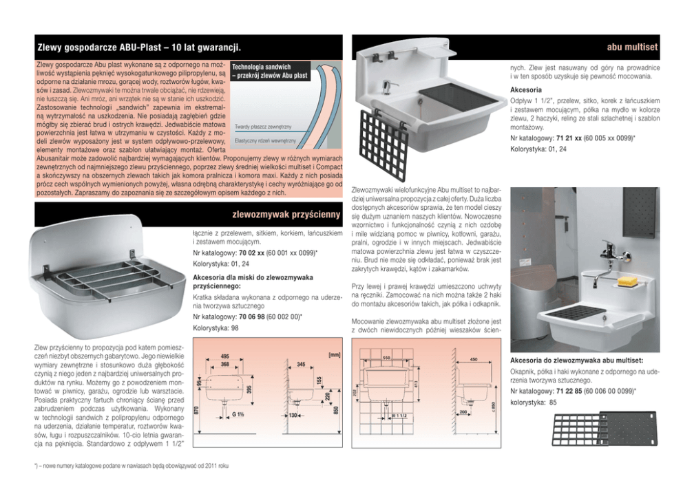 abu multiset Zlewy gospodarcze ABU-Plast – 10 lat gwarancji. Zlewy gospodarcze Abu plast wykonane są z odpornego na moż- Technologia sandwich liwość wystąpienia pęknięć wysokogatunkowego pilipropylenu, są – przekrój zlewów Abu plast odporne na działanie mrozu, gorącej wody, roztworów ługów, kwasów i zasad. Zlewozmywaki te można trwale obciążać, nie rdzewieją, nie łuszczą się. Ani mróz, ani wrzątek nie są w stanie ich uszkodzić. Zastosowanie technologii „sandwich” zapewnia im ekstremalną wytrzymałość na uszkodzenia. Nie posiadają zagłębień gdzie mógłby się zbierać brud i ostrych krawędzi. Jedwabiście matowa Twardy płaszcz zewnętrzny powierzchnia jest łatwa w utrzymaniu w czystości. Każdy z modeli zlewów wyposażony jest w system odpływowo-przelewowy, Elastyczny rdzeń wewnętrzny elementy montażowe oraz szablon ułatwiający montaż. Oferta Abusanitair może zadowolić najbardziej wymagających klientów. Proponujemy zlewy w różnych wymiarach zewnętrznych od najmniejszego zlewu przyściennego, poprzez zlewy średniej wielkości multiset i Compact a skończywszy na obszernych zlewach takich jak komora pralnicza i komora maxi. Każdy z nich posiada prócz cech wspólnych wymienionych powyżej, własna odrębną charakterystykę i cechy wyróżniające go od pozostałych. Zapraszamy do zapoznania się ze szczegółowym opisem każdego z nich. zlewozmywak przyścienny łącznie z przelewem, sitkiem, korkiem, łańcuszkiem i zestawem mocującym. Nr katalogowy: 70 02 xx (60 001 xx 0099)* Kolorystyka: 01, 24 Akcesoria dla miski do zlewozmywaka przyściennego: Kratka składana wykonana z odpornego na uderzenia tworzywa sztucznego Nr katalogowy: 70 06 98 (60 002 00)* Kolorystyka: 98 Zlew przyścienny to propozycja pod katem pomieszczeń niezbyt obszernych gabarytowo. Jego niewielkie wymiary zewnętrzne i stosunkowo duża głębokość czynią z niego jeden z najbardziej uniwersalnych produktów na rynku. Możemy go z powodzeniem montować w piwnicy, garażu, ogrodzie lub warsztacie. Posiada praktyczny fartuch chroniący ścianę przed zabrudzeniem podczas użytkowania. Wykonany w technologii sandwich z polipropylenu odpornego na uderzenia, działanie temperatur, roztworów kwasów, ługu i rozpuszczalników. 10-cio letnia gwarancja na pęknięcia. Standardowo z odpływem 1 1/2” *) – nowe numery katalogowe podane w nawiasach będą obowiązywać od 2011 roku nych. Zlew jest nasuwany od góry na prowadnice i w ten sposób uzyskuje się pewność mocowania. Akcesoria Odpływ 1 1/2”, przelew, sitko, korek z łańcuszkiem i zestawem mocującym, półka na mydło w kolorze zlewu, 2 haczyki, reling ze stali szlachetnej i szablon montażowy. Nr katalogowy: 71 21 xx (60 005 xx 0099)* Kolorystyka: 01, 24 Zlewozmywaki wielofunkcyjne Abu multiset to najbardziej uniwersalna propozycja z całej oferty. Duża liczba dostępnych akcesoriów sprawia, że ten model cieszy się dużym uznaniem naszych klientów. Nowoczesne wzornictwo i funkcjonalność czynią z nich ozdobę i mile widzianą pomoc w piwnicy, kotłowni, garażu, pralni, ogrodzie i w innych miejscach. Jedwabiście matowa powierzchnia zlewu jest łatwa w czyszczeniu. Brud nie może się odkładać, ponieważ brak jest zakrytych krawędzi, kątów i zakamarków. Przy lewej i prawej krawędzi umieszczono uchwyty na ręczniki. Zamocować na nich można także 2 haki do montażu akcesoriów takich, jak półka i odkapnik. Mocowanie zlewozmywaka abu multiset złożone jest z dwóch niewidocznych później wieszaków ścien- Akcesoria do zlewozmywaka abu multiset: Okapnik, półka i haki wykonane z odpornego na uderzenia tworzywa sztucznego. Nr katalogowy: 71 22 85 (60 006 00 0099)* kolorystyka: 85 ć! nowoś Zlewozmywak Komora gospodarcza abu compact maxi zamontowanie baterii stojącej, dozownika na mydło lub przechowywanie środków czystości. Nr katalogowy: 60 009 xx Kolorystyka: 01, 24 Komora maxi jest szczególnie użyteczna gdy jest potrzebna duża komora gospodarcza montowana obok pralki, w suterenie, kotłowni, garażu, pralni, warsztacie, ogrodzie etc. Compact to kolejna propozycja firmy Abu-plast dla klientów poszukujących zlewu gospodarczego. Ergonomiczna zwarta budowa, brak ostrych krawędzi, ciekawa linia wzornicza to cechy które z całą pewnością czynią ten zlew atrakcyjnym. Sprawdzony system montażu za pomocą mocowań wstępnie przykręcanych do ściany sprawia, że po nasunięciu zlewu na mocowania nie widać żadnych otworów i śrub montażowych. Compact posiada płaszcz naścienny, który zapobiega zabrudzeniom ściany podczas użytkowania. Posiada szeroką półkę która umożliwia komora pralnicza Akcesoria do komory pralniczej: Kratka nakładana wykonana z odpornego na uderzenia tworzywa sztucznego Nr katalogowy: 70 08 98 (60 004 00 0099)* Kolorystyka: 98 Jej duże wymiary: 700x500x250 mm i pojemność 33 litrów sprawiają, że w pomieszczeniach gospodarczych staje się niezastąpiona. Komora posiada półkę, która jest technologicznie przygotowana do montażu np. dozownika do mydła lub baterii zlewozmywakowej stojącej. Dodatkowa wygodna półka pod komorą zapewnia możliwość przechowywania np. środków czystości lub innych akcesoriów. Komora maxi produkowana jest w dwóch wersjach: – do zastosowania w gospodarstwach domowych – laboratoryjna - bez przelewu, z lejkiem odpływowym. Komora gospodarcza „maxi” Nr katalogowy: 71 51 xx (60 007 xx 0099)* Komora gospodarcza „maxi”, wersja z lejkiem, do zastosowań laboratoryjnych, komora bez przelewu Nr katalogowy: 71 50 xx (60 008 xx 0099)* Kolorystyka: 01, 24 Akcesoria do 71 50 xx: 2” lejek odpływowy o długości 165 mm Zlewy Abusanitair dostępne są w następujących kolorach: 01 Biały 03 Beż 04 Szary Komora o szerokości 61 cm i głębokości ok 30 cm umożliwi każdej gospodyni domowej komfortowe wykonywanie codziennych prac porządkowych w domu takich jak pranie i sprzątanie. Monta