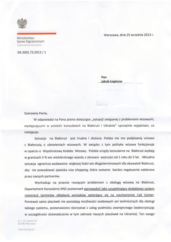 Ministerstwo Zagranicznych Spraw 2Ot3r. dnia25wrze5nia Warszawa, Konsularny Departament DK.3301.73.20t3 / t Pan Jakubtosinow Panie, Szanowny wizowymi, z problemami zwiqzanej na Panapismodotyczqce W odpowiedzi ,,sytuacji co na Biatorusii Ukrainie"uprzejmiewyja6niam, w polskichkonsulatach wystepujecymi nastqpuje. Sytuacja na Biatorusi jest trudna i zto2ona.Polskanie ma podpisanejumowy z Biatorusiqo utatwieniachwizowych.W zwiqzkuz tym politykawizowa funkcjonuje na Biatorusi wydajq KodeksWizowy.Polskieurzqdykonsularne w oparciuo Wsp6lnotowy od 1 rokudo 5 lat. Aktualna wjazduz okresemwa2no6ci w granicach 5 % wizwielokrotnego dlaobywateliBiatorusi, ilo5ciwizdtugoterminowych wydawaniewiqkszej sytuacjaogranicza aby nie powodowa6zjawiskavisoshopping,kt6re zostanie bardzonegatywnieodebrane przeznaszychpartner6w. Wychodzqcna przeciw rosnacymproblemomz obstugqwizowq na Biatorusi, dodatkowvsvstem wprowadzid MSZpostanowil iakouzupefniaiacv Konsularny Departament reiestraciitermin6w sktadaniawniosk6wopieraiacvsie na mechanizmieCall Center. dla obstugi mo2liwo5ci osobowych ani technicznych Poniewa2 sameplac6wkinie posiadajq (wykorzystujqc takiegosystemu,postanowionoskorzystaiz ustugpodmiotuzewnqtrznego Ten swego w tym zakresienaszychplac6wekna Ukrainie). doSwiadczenia w szczeg6lnoSci Al. L Ch.Szucha 23 00-580Warszawa www.msz.gov.pl outsourcing"w warunkachBiatorusi,gdzie niewiadomymjest spos6b rodzaju,,ograniczony reakcjina niegomiejscowychwtadz, zdecvdowanosie wprowadzidna zasadzieekspervmentuograniczonegodo iednei plac6wki,w ramach kt6rego osoby zainteresowaneuzyskaniemwizy mogtyby- w ramach wizyty korzystaiz um6wienia limit6wilo6ciowych za poSrednictwem w konsulacie pfatnejustugiCallCenter.Od rezultat6weksperymentuuzale2nione bytybydalszedziatania. W czerwcu br. Departament KonsularnyMSZ w zakresiepraktyki wizowej zlecif realizacjqzwiekszeniaodsetekwiz wielokrotnvch.wa2nvchod 1 roku do 5 lat. wvdawanvch w trvbie art.5 lJmowv miedzv Wsp6lnota Europeiskoo Ukraina o ulotwienioch w wvdawoniu poinformowanokonsul6w,2e wL w urzedachkonsularnvchna Ukrainie. JednoczeSnie praktyka ta powinna by6 na bie2qco przedmiotem koordynacji w ramach Lokalnej w celu unikniqciazjawiskavisoshopping. Wsp6tpracySchengen, W zwiqzkuz powy2szym zobligowanokonsul6w do przeprowadzeniaspecjalnych szkolei dla pracownik6wmerytorycznychReferat6w RuchuOsobowego,kt6rzyna bie2qco analizujqprocesy wizowe w WydziatachKonsularnych,oraz przygotowaniainformacji w tym wizualnych na tablicachi w poczekalniachPPWW,odno6niepromowaniaprawa wiz wielokrotnych. i zasaduzyskiwania Kategorvczniezalecono doprowadzenie do istotnego i zauwa2alnegowzrostu odsetka wiz wa2nvchod L roku do 5 lat (w tvm tak2e w segmencie2-5 lat). Zwr6cono uwagq, i2 wydanietakiej wizy nie zale2yod okresu,na jaki opiewa zaproszenie, szczeg6lna a w pozytywnejhistoriiwizowej liczqsiq nie tylko polskiewizy jednolite, lecztak2ewydane przez inne Pafstwa Cztonkowskie. Poniewa2wydanie wizy ,,dtugiej"zale2yod wystqpienia o niq we wniosku wizowym, zalecono aby przeprowadzono szkoleniadla wszystkich Punkt6wPrzyjmowaniaWniosk6wWizowych(orazw konsulatach),aby osoby kwalifikujqce sie do ich otrzymywania byty ,,wychwytywane" i u6wiadamianena okienkach, dla im zmiany(poprawy)wnioskuwizowego. umo2liwienia W wyniku podjqtychdziatafiprzezurzqdykonsularnena Ukrainie nastqpitstopniowy wzrost liczbywniosk6wwizowych,w kt6rychaplikujqcyubiegajqsiq o wizy wieloletnie,a tym samymi wzrostiloSciwydawanychwiz wieloletnich. Pragnqpoinformowai Pana,i2 podjqte dzialaniapozwolq do korica br. przejii z ekstensywnegodo intensywnegomodelu obstugi wizowej na Ukrainie, a cdselgkwiz element6wocenvwta5ciweirealizacii ,.dfugich"wielokrotnvchbedzieiednvmz kluczowvch polskieipolitvkiwizoweiw ka2dvmz urzed6w.