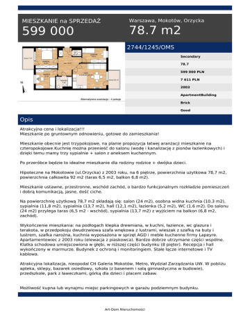 MIESZKANIE na SPRZEDAŻ 599 000 Warszawa, Mokotów, Orzycka 78.7 m2 2744/1245/OMS Secondary 78.7 599 000 PLN 7 611 PLN 2003 ApartmentBuilding Brick Good Opis Atrakcyjna cena i lokalizacja!!! Mieszkanie po gruntownym odnowieniu, gotowe do zamieszkania! Mieszkanie obecnie jest trzypokojowe, na planie propozycja łatwej aranżacji mieszkanie na czteropokojowe.Kuchnię można przenieść do salonu (wodę i kanalizację z pionów łazienkowych) i dzięki temu mamy trzy sypialnie + salon z aneksem kuchennym. Po przeróbce będzie to idealne mieszkanie dla rodziny rodzice + dwójka dzieci. Hipoteczne na Mokotowie (ul.Orzycka) z 2003 roku, na 6 piętrze, powierzchnia użytkowa 78,7 m2, powierzchnia całkowita 92 m2 (taras 6,5 m2, balkon 6,8 m2). Mieszkanie ustawne, przestronne, wschód zachód, o bardzo funkcjonalnym rozkładzie pomieszczeń i dobrą komunikacją, jasne, dość ciche. Na powierzchnię użytkową 78,7 m2 składają się: salon (24 m2), osobna widna kuchnia (10,3 m2), sypialnia (11,8 m2), sypialnia (13,7 m2), hall (12,1 m2), łazienka (5,2 m2), WC (1,6 m2). Do salonu (24 m2) przylega taras (6,5 m2 - wschód), sypialnia (13,7 m2) z wyjściem na balkon (6,8 m2, zachód). Wykończenie mieszkania: na podłogach klepka drewniana, w kuchni, łazience, wc glazura i terakota, w przedpokoju dwudrzwiowa szafa wnękowa z lustrami, wieszak z szafką na buty i lustrem, szafka narożna, kuchnia wyposażona w sprzęt AGD i meble kuchenne firmy Lapeyre. Apartamentowiec z 2003 roku (elewacja z piaskowca). Bardzo dobrze utrzymane części wspólne. Klatka schodowa umiejscowiona w głębi, w niższej części budynku (8 pięter). Recepcja i hall wykończony w marmurze. Budynek z ochroną i monitoringiem. Stałe łącze internetowe i TV kablowa. Atrakcyjna lokalizacja, nieopodal CH Galeria Mokotów, Metro, Wydział Zarządzania UW. W pobliżu apteka, sklepy, bazarek osiedlowy, szkoła (z basenem i salą gimnastyczna w budowie), przedszkole, park z ławeczkami, górką dla dzieci i placem zabaw. Możliwość kupna lub wynajmu miejsc parkingowych w garażu podziemnym budynku. Art-Dom Nieruchomości Kinga Sokulska tel. 226700580 502788848 email: [email protected] Art-Dom Nieruchomości Powered by TCPDF (www.tcpdf.org)