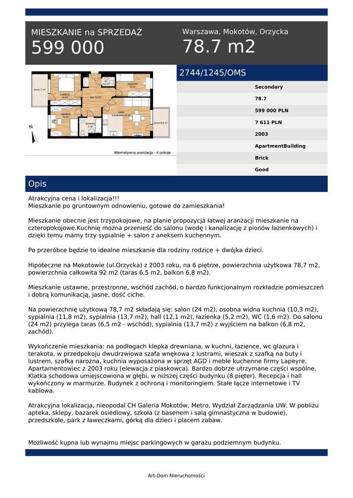 599 000 78.7 m2 - Biuro nieruchomości ART