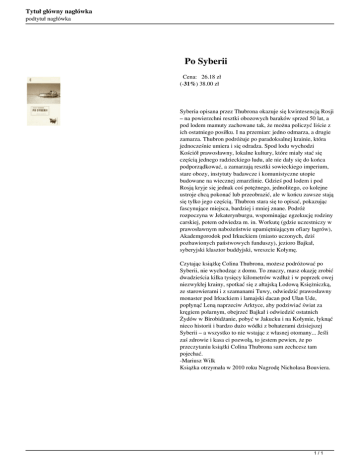Tytuł główny nagłówka podtytuł nagłówka Po Syberii Cena: 26.18 zł (-31%) 38.00 zł Syberia opisana przez Thubrona okazuje się kwintesencją Rosji – na powierzchni resztki obozowych baraków sprzed 50 lat, a pod lodem mamuty zachowane tak, że można policzyć liście z ich ostatniego posiłku. I na przemian: jedno odmarza, a drugie zamarza. Thubron podróżuje po paradoksalnej krainie, która jednocześnie umiera i się odradza. Spod lodu wychodzi Kościół prawosławny, lokalne kultury, które miały stać się częścią jednego radzieckiego ludu, ale nie dały się do końca podporządkować, a zamarzają resztki sowieckiego imperium, stare obozy, instytuty badawcze i komunistyczne utopie budowane na wiecznej zmarzlinie. Gdzieś pod lodem i pod Rosją kryje się jednak coś potężnego, jednolitego, co kolejne ustroje chcą pokonać lub przeobrazić, ale w końcu zawsze stają się tylko jego częścią. Thubron stara się to opisać, pokazując fascynujące miejsca, bardziej i mniej znane. Podróż rozpoczyna w Jekaterynburgu, wspominając egzekucję rodziny carskiej, potem odwiedza m. in. Workutę (gdzie uczestniczy w prawosławnym nabożeństwie upamiętniającym ofiary łagrów), Akademgorodok pod Irkuckiem (miasto uczonych, dziś pozbawionych państwowych funduszy), jezioro Bajkał, syberyjski klasztor buddyjski, wreszcie Kołymę. Czytając książkę Colina Thubrona, możesz podróżować po Syberii, nie wychodząc z domu. To znaczy, masz okazję zrobić dwadzieścia kilka tysięcy kilometrów wzdłuż i w poprzek owej niezwykłej krainy, spotkać się z ałtajską Lodową Księżniczką, ze starowierami i z szamanami Tuwy, odwiedzić prawosławny monaster pod Irkuckiem i lamajski dacan pod Ułan Ude, popłynąć Leną naprzeciw Arktyce, aby podziwiać świat za kręgiem polarnym, obejrzeć Bajkał i odwiedzić ostatnich Żydów w Birobidżanie, pobyć w Jakucku i na Kołymie, łyknąć nieco historii i bardzo dużo wódki z bohaterami dzisiejszej Syberii – a wszystko to nie wstając z własnej otomany... Jeśli zaś zdrowie i kasa ci pozwolą, to jestem pewien, że po przeczytaniu książki Colina Thubrona sam zechcesz tam pojechać. -Mariusz Wilk Książka otrzymała w 2010 roku Nagrodę Nicholasa Bouviera. 1/1 Powered by TCPDF (www.tcpdf.org)