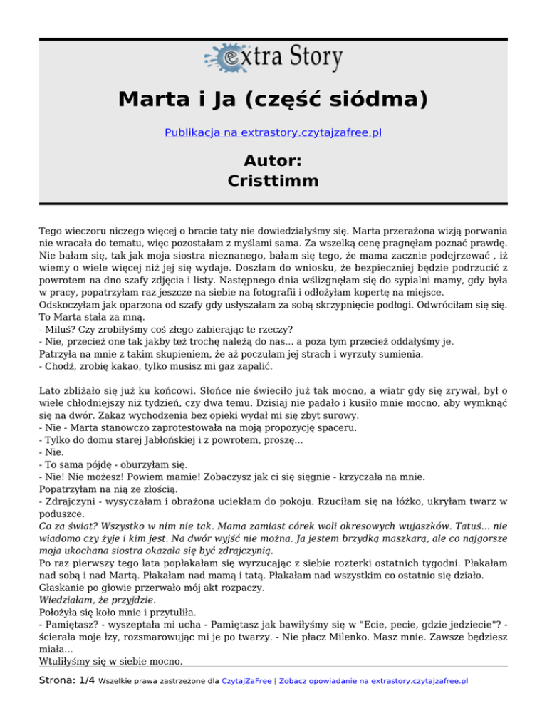 Marta i Ja (część siódma) Publikacja na extrastory.czytajzafree.pl Autor: Cristtimm Tego wieczoru niczego więcej o bracie taty nie dowiedziałyśmy się. Marta przerażona wizją porwania nie wracała do tematu, więc pozostałam z myślami sama. Za wszelką cenę pragnęłam poznać prawdę. Nie bałam się, tak jak moja siostra nieznanego, bałam się tego, że mama zacznie podejrzewać , iż wiemy o wiele więcej niż jej się wydaje. Doszłam do wniosku, że bezpieczniej będzie podrzucić z powrotem na dno szafy zdjęcia i listy. Następnego dnia wślizgnęłam się do sypialni mamy, gdy była w pracy, popatrzyłam raz jeszcze na siebie na fotografii i odłożyłam kopertę na miejsce. Odskoczyłam jak oparzona od szafy gdy usłyszałam za sobą skrzypnięcie podłogi. Odwróciłam się się. To Marta stała za mną. - Miluś? Czy zrobiłyśmy coś złego zabierając te rzeczy? - Nie, przecież one tak jakby też trochę należą do nas... a poza tym przecież oddałyśmy je. Patrzyła na mnie z takim skupieniem, że aż poczułam jej strach i wyrzuty sumienia. - Chodź, zrobię kakao, tylko musisz mi gaz zapalić. Lato zbliżało się już ku końcowi. Słońce nie świeciło już tak mocno, a wiatr gdy się zrywał, był o wiele chłodniejszy niż tydzień, czy dwa temu. Dzisiaj nie padało i kusiło mnie mocno, aby wymknąć się na dwór. Zakaz wychodzenia bez opieki wydał mi się zbyt surowy. - Nie - Marta stanowczo zaprotestowała na moją propozycję spaceru. - Tylko do domu starej Jabłońskiej i z powrotem, proszę... - Nie. - To sama pójdę - oburzyłam się. - Nie! Nie możesz! Powiem mamie! Zobaczysz jak ci się sięgnie - krzyczała na mnie. Popatrzyłam na nią ze złością. - Zdrajczyni - wysyczałam i obrażona uciekłam do pokoju. Rzuciłam się na łóżko, ukryłam twarz w poduszce. Co za świat? Wszystko w nim nie tak. Mama zamiast córek woli okresowych wujaszków. Tatuś... nie wiadomo czy żyje i kim jest. Na dwór wyjść nie można. Ja jestem brzydką maszkarą, ale co najgorsze moja ukochana siostra okazała się być zdrajczynią. Po raz pierwszy tego lata popłakałam się wyrzucając z siebie rozterki ostatnich tygodni. Płakałam nad sobą i nad Martą. Płakałam nad mamą i tatą. Płakałam nad wszystkim co ostatnio się działo. Głaskanie po głowie przerwało mój akt rozpaczy. Wiedziałam, że przyjdzie. Położyła się koło mnie i przytuliła. - Pamiętasz? - wyszeptała mi ucha - Pamiętasz jak bawiłyśmy się w "Ecie, pecie, gdzie jedziecie"? ścierała moje łzy, rozsmarowując mi je po twarzy. - Nie płacz Milenko. Masz mnie. Zawsze będziesz miała... Wtuliłyśmy się w siebie mocno. Strona: 1/4 Wszelkie prawa zastrzeżone dla CzytajZaFree | Zobacz opowiadanie na extrastory.czytajzafree.pl - Muszę wysmarkać nos... - powiedziałam po chwili zduszonym głosem - i odechciało mi się spaceru. Przez kilka dni było spokojnie. Zachowywałyśmy się bardzo grzecznie, a mama wynagradzała to czasem wspólnie spędzanym. Bawiliśmy się w czwórkę wraz z wujaszkiem Sławkiem w gry, zgadywanki, szarady. To jedyny czas w naszym dzieciństwie, gdy delektowałyśmy się z Martą smakiem prawdziwej rodziny. Sielankę przerwali nieoczekiwani goście. Jednego dnia pod dom zajechał elegancki, biały samochód. Nie pamiętam, a może nawet nie wiem, jakiej był marki, to zresztą nieważne. Ważne, że pojawienie się takiego auta w naszej wiosce to wydarzenie, które komentowane jest jeszcze przez wiele tygodni. Właśnie z takiego samochodu wysiadło dwoje ludzi i zapukało do naszych drzwi. Podbiegłyśmy otworzyć, ale uprzedziła nas mama. Rozwarła je szeroko i zbladła. Przed nami stała para starszych ludzi. On niezbyt wysoki, siwy z sumiastym wąsem, ona - szczupła, ubrana niezwykle elegancko, z zaczesanymi w kok kasztanowymi włosami. - Dzień dobry Barbaro - odezwała się kobieta - poznajesz nas? Mama odpowiedziała nienaturalnie ugrzecznionym głosem. - Tak, poznaję ale jestem bardzo zaskoczona.... - No tak... - uśmiechnęła się starsza pani - to całkiem zrozumiałe... Wpuścisz nas, czy będziemy tak konwersować w progu? - Proszę... wejdźcie. Tam na wprost - mama wskazała w kierunku kuchni. My też wycofałyśmy się do tamtego pomieszczenia. - Kto to? - wyszeptała Marta. Wzruszyłam ramiona. Niby skąd mam wiedzieć? A zresztą pewnie i tak zaraz się wyjaśni. Weszli zaraz za nami, mama zapraszająco wskazała krzesła przy stole. - Proszę usiąść. Coś do picia? - Tak, poproszę herbatę - odezwał się po raz pierwszy mężczyzna. Kobieta przyglądała się bacznie mi i Marcie. Nawet gdy siadała nie spuszczała z nas wzroku. - Dzień dobry dziewczynki - zagadnęła nas. - One nie mają pojęcia kim jesteśmy, prawda - zwróciła się do mamy. - Nie, bo niby skąd mają wiedzieć, przecież nigdy się nimi nie interesowaliście - teraz ton mamy był bardzo zgryźliwy. - Oj, nie do końca to prawda, ale nie chcę zaczynać naszego spotkania od sprzeczki - pani z kokiem uśmiechała się promiennie, jednak ten uśmiech nie spodobał mi się - raczej prosiłabym cię, abyś nas sobie przedstawiła, chociaż akurat ja wiem, że macie na imię Milena i Marta - teraz zwróciła się do nas. Mama podeszła tak, aby ująć za ramię mnie i siostrę. - Dziewczynki to wasi dziadkowie od strony tatusia - powiedziała. Marta aż otworzyła buzię ze zdziwienia, ja też nie kryłam zaskoczenia. Nigdy, przez całe nasze życie dziadkowie nie odezwali się do nas, nie napisali listu, nie zaprosili, nie przysłali prezentu, praktycznie nie istnieli dla nas. A teraz wkroczyli z uśmiechem w nasze życie i rozsiedli się w kuchni. - Tak, jestem waszą babcią. Czy wiecie jak mam na imię? Nie pamiętałam, a po prawdzie to nawet nie wiedziałam. Spojrzałam pytająco na Martę, zaprzeczyła ruchem głowy. - Widzę, że nie - kobieta popatrzyła na mamę z politowaniem nie przestają się uśmiechać - nazywam się Karolina Miś