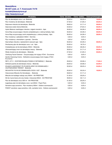 BeautyNova 90-437 Łódź, ul. T. Kościuszki 74/78 [email protected] http://beautynova.pl/ Produkty Cena (brutto) Cena (netto) Cena promocyjna Płyn do demakijażu oczu i ust -Bielenda 25,00 zł 20,33 zł 19,00 zł Płyn micelarny do demakijażu -Bielenda 27,00 zł 21,95 zł 20,00 zł Satynowe mleczko do demakijażu -Bielenda 39,00 zł 31,71 zł 29,00 zł Satynowa woda różana-Bielenda 34,00 zł 27,64 zł 26,00 zł Hydro Balance nawilżające mleczko z algami morskimi - Apis 30,00 zł 24,39 zł 28,00 zł Acne-Stop oczyszczające mleczko antybakteryjne z zieloną herbatą -Apis 30,00 zł 24,39 zł 28,00 zł Acne-Stop oczyszczający tonik antybakteryjny z zieloną herbatą - Apis 30,00 zł 24,39 zł 28,00 zł Płyn micelarny z jedwabiem 500ml - Dermika 0,00 zł 0,00 zł Plyn micelarny z ekstraktem z granatu - Dermika 0,00 zł 0,00 zł Goji terApis mleczko z tybetańskimi owocami goji - Apis 30,00 zł 24,39 zł Dwufazowy płyn do demakijażu oczu i ust - Apis 23,00 zł 18,70 zł Antybakteryjny żel do demakijażu 500ml - Bielenda 35,00 zł 28,46 zł 26,00 zł Ultranawilżający krem do demakijażu twarzy - Bielenda 39,00 zł 31,71 zł 29,00 zł Woda micelarna do demakijażu - Bielenda 27,00 zł 21,95 zł 20,00 zł Clarifying Facial Cleanser - Oczyszczający żel myjący 473ml - Exuviance 0,00 zł 0,00 zł Gentle Cleansing Creme - Delikatnie oczyszczający krem myjący 473ml Exuviance 0,00 zł 0,00 zł 28,00 zł RETI_VIT C - OCZYSZCZAJĄCA PIANKA Z WITAMINĄ C - Bielenda 29,00 zł 23,58 zł 17,60 zł Delikatna pianka do demakijażu twarzy - Bielenda 29,00 zł 23,58 zł 22,00 zł KOJĄCO-ŁAGODZĄCY PŁYN MICELARNY DO DEMAKIJAŻU I OCZYSZCZANIA TWARZY - Bielenda 32,00 zł 26,02 zł 24,00 zł DELIKATNY PŁYN DO DEMAKIJAŻU OCZU I UST - Bielenda 25,00 zł 20,33 zł 19,00 zł Hialuronowe Mleczko Do Demakijażu - Bielenda 39,00 zł 31,71 zł Mleczko do każdego rodzaju cery 500ml - AA PRESTIGE 31,00 zł 25,20 zł Żel do mycia twarzy do cery tłustej i mieszanej 500ml - AA PRESTIGE 39,50 zł 32,11 zł Płyn do demakijażu oczu 500 ml - AA PRESTIGE 31,00 zł 25,20 zł Łagodzący płyn do demakijażu oczu i ust 200ml - Payot Paris 0,00 zł 0,00 zł Sensitore aqua sensitive - Płyn micelarny 500ml - Dottore cosmeceutici 0,00 zł 0,00 zł PAKIET sensitore: aqua sensitive, milk, cavitation tonic - Dottore cosmeceutici 0,00 zł 0,00 zł