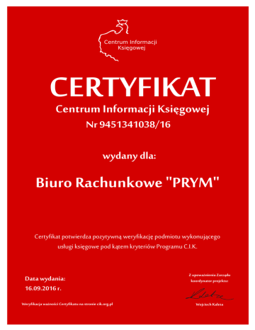 Centrum Informacji Księgowej CERTYFIKAT Centrum Informacji Księgowej Nr 9451341038/16 wydany dla: Biuro Rachunkowe "PRYM" Certyfikat potwierdza pozytywną weryfikację podmiotu wykonującego usługi księgowe pod kątem kryteriów Programu C.I.K. Data wydania: 16.09.2016 r. Weryfikacja ważności Certyfikatu na stronie cik.org.pl Z upoważnienia Zarządu koordynator projektu: Wojciech Kaleta