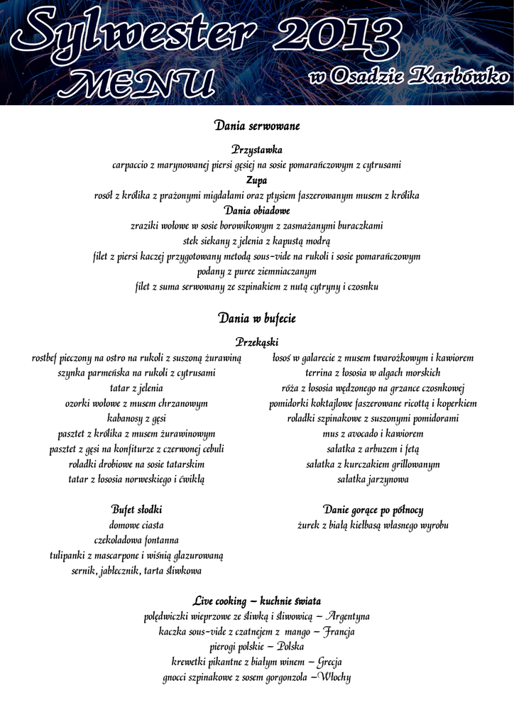 Dania serwowane Przystawka carpaccio z marynowanej piersi gęsiej na sosie pomarańczowym z cytrusami Zupa upa rosół z królika z prażonymi migdałami oraz ptysiem faszerowanym musem z królika Dania obiadowe zraziki wołowe w sosie borowikowym z zasmażanymi buraczkami stek siekany z jelenia z kapustą modrą filet z piersi kaczej przygotowany metodą sous-vide na rukoli i sosie pomarańczowym podany z puree ziemniaczanym filet z suma serwowany ze szpinakiem z nutą cytryny i czosnku Dania w bufecie Przeką Przeką ski rostbef pieczony na ostro na rukoli z suszoną żurawiną łosoś w galarecie z musem twarożkowym i kawiorem szynka parmeńska na rukoli z cytrusami terrina z łososia w algach morskich tatar z jelenia róża z łososia wędzonego na grzance czosnkowej ozorki wołowe z musem chrzanowym pomidorki koktajlowe faszerowane ricottą i koperkiem kabanosy z gęsi roladki szpinakowe z suszonymi pomidorami pasztet z królika z musem żurawinowym mus z avocado i kawiorem pasztet z gęsi na konfiturze z czerwonej cebuli sałatka z arbuzem i fetą roladki drobiowe na sosie tatarskim sałatka z kurczakiem grillowanym tatar z łososia norweskiego i ćwikłą sałatka jarzynowa Bufet sł sł odki domowe ciasta czekoladowa fontanna tulipanki z mascarpone i wiśnią glazurowaną sernik, jabłecznik, tarta śliwkowa Danie gorą gorą ce po pół pół nocy żurek z białą kiełbasą własnego wyrobu Live cooking – kuchnie świata polędwiczki wieprzowe ze śliwką i śliwowicą – Argentyna kaczka sous-vide z czatnejem z mango – Francja pierogi polskie – Polska krewetki pikantne z białym winem – Grecja gnocci szpinakowe z sosem gorgonzola –Włochy