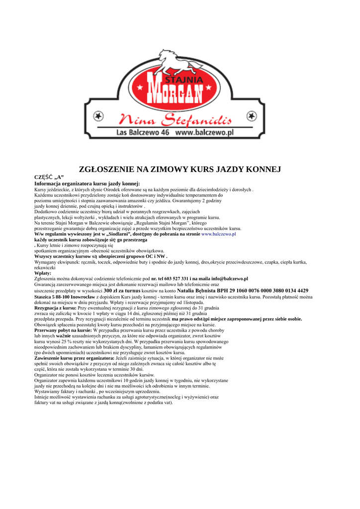 ZGŁOSZENIE NA ZIMOWY KURS JAZDY KONNEJ CZĘŚĆ „A” Informacja organizatora kursu jazdy konnej: Kursy jeździeckie, z których słynie Ośrodek oferowane są na każdym poziomie dla dziecimłodzieży i dorosłych . Każdemu uczestnikowi przydzielony zostaje koń dostosowany indywidualnie temperamentem do poziomu umiejętności i stopnia zaawansowania amazonki czy jeźdźca. Gwarantujemy 2 godziny jazdy konnej dziennie, pod czujną opieką i instruktorów . Dodatkowo codziennie uczestnicy biorą udział w porannych rozgrzewkach, zajęciach plastycznych, lekcji woltyżerki , wykładach i wielu atrakcjach oferowanych w programie kursu. Na terenie Stajni Morgan w Balczewie obowiązuje ,,Regulamin Stajni Morgan’’, którego przestrzeganie gwarantuje dobrą organizację zajęć a przede wszystkim bezpieczeństwo uczestników kursu. W/w regulamin wywieszony jest w „Siodlarni”, dostępny do pobrania na stronie www.balczewo.pl każdy uczestnik kursu zobowiązuje się go przestrzega . Kursy letnie i zimowe rozpoczynają się spotkaniem organizacyjnym -obecność uczestników obowiązkowa. Wszyscy uczestnicy kursow są ubezpieczeni grupowo OC i NW . Wymagany ekwipunek: ręcznik, toczek, odpowiednie buty i spodnie do jazdy konnej, dres,okrycie przeciwdeszczowe, czapka, ciepła kurtka, rekawiczki Wpłaty: Zgłoszenia można dokonywać codziennie telefonicznie pod nr. tel 603 527 331 i na maila [email protected] Gwarancją zarezerwowanego miejsca jest dokonanie rezerwacji mailowo lub telefonicznie oraz uiszczenie przedpłaty w wysokości 300 zł za turnus kosztów na konto Natalia Bębnista BPH 29 1060 0076 0000 3080 0134 4429 Staszica 5 88-100 Inowrocław z dopiskiem Kurs jazdy konnej - termin kursu oraz imię i nazwisko uczestnika kursu. Pozostałą płatność można dokonać na miejscu w dniu przyjazdu. Wpłaty i rezerwacje przyjmujemy od 1listopada. Rezygnacja z kursu: Przy ewentualnej rezygnacji z kursu zimowego zgłoszonej do 31 grudnia zwraca się zaliczkę w kwocie 1 wpłaty w ciągu 14 dni, zgłoszonej później niż 31 grudnia przedpłata przepada. Przy rezygnacji niezależnie od terminu uczestnik ma prawo odstąpi miejsce zaproponowanej przez siebie osobie. Obowiązek spłacenia pozostałej kwoty kursu przechodzi na przyjmującego miejsce na kursie. Przerwany pobyt na kursie: W przypadku przerwania kursu przez uczestnika z powodu choroby lub innych ważnie uzasadnionych przyczyn, za które nie odpowiada organizator, zwrot kosztów kursu wynosi 25 % reszty nie wykorzystanych dni. W przypadku przerwania kursu spowodowanego nieodpowiednim zachowaniem lub brakiem dyscypliny, łamaniem obowiązujących regulaminów (po dwóch upomnieniach) uczestnikowi nie przysługuje zwrot kosztów kursu. Zawieszenie kursu przez organizatora: Jeżeli zaistnieje sytuacja, w której organizator nie może spełnić swoich obowiązków z przyczyn od niego zależnych zwraca się całość kosztów albo tę część, która nie została wykorzystana w terminie 30 dni. Organizator nie ponosi kosztów leczenia uczestników kursów. Organizator zapewnia każdemu uczestnikowi 10 godzin jazdy konnej w tygodniu, nie wykorzystane jazdy nie przechodzą na kolejne dni i nie ma możliwości ich odrobienia w innym terminie. Wystawiamy faktury i rachunki , po wcześniejszym uprzedzeniu. Istnieje możliwość wystawienia rachunku za usługi agroturystyczne(nocleg i wyżywienie) oraz faktury vat na usługi związane z jazdą konną(zwolnione z podatku vat). CZĘŚĆ „В” – wypełnia rodzic I. Dane osobowe uczestnika kursu: Imię i nazwisko dziecka:....................................................................................................................... Data i miejsce urodzenia:..................................................................................................................... Pesel dziecka:...................................................................................................................................... Adres zamieszkania:............................................................................................................................ Telefon/ fax:......................................................................................................................................... Adres i telefon rodziców w czasie pobytu dziecka na kursie E –mail......................................................................................................................... Wybrany Termin Kursu............................................................................................................. Staż jazdy konnej i stopień zaawansowania – stęp, kłus, galop, skoki, ujeżdżenie * (lub wpisać początkujący):......................................................................................................................... Zgłaszam na kurs własnego konia * TAK NIE jeżeli tak: imię konia.................................................. wiek konia................................................. płeć konia................................................... wymagany jest do wglądu paszport z aktualnymi szczepieniami, Dodatkowe informacje o koniu............................................................................................. II. Informacja rodziców ( opiekunów ) o stanie zdrowia dziecka: Dolegliwości i objawy, które mogą wystąpić u dziecka *: omdlenia, drgawki z utratą przytomności, częste bóle głowy, zaburzenia równowagi, częste wymioty, krwotoki z nosa, ataki duszności, przewlekły kaszel, szybkie męczenie się, częste bóle brzucha, bóle stawów, lęki nocne, moczenie nocne, inne:............................................................................................................... III. Przebyte choroby ( podać , w którym roku ) *: żółtaczka zakaźna, dur brzuszny, błonica, inne choroby zakaźne, zapalenie nerek, zapalenie wyrostka robaczkowego, zapalenie ucha, częste anginy, cukrzyca, pad