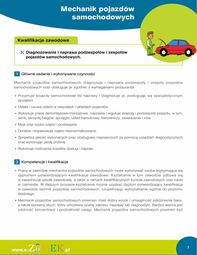 Mechanik pojazdów samochodowych Kwalifikacje zawodowe Diagnozowanie i naprawa podzespołów i zespołów pojazdów samochodowych. 1 Główne zadania i wykonywane czynności Mechanik pojazdów samochodowych diagnozuje i naprawia podzespoły i zespoły pojazdów samochodowych oraz obsługuje je zgodnie z wymaganiami producenta. Przyjmuje pojazdy samochodowe do naprawy i diagnozuje je, posługując się specjalistycznym sprzętem. Ustala i usuwa usterki w zespołach i układach pojazdów. Wykonuje prace demontażowo-montażowe, naprawia i reguluje zespoły i podzespoły pojazdu, w tym: silnik, skrzynię biegów, sprzęgło, układ hamulcowy, kierowniczy, zawieszenie i inne. Myje oraz czyści części i podzespoły. Dorabia i dopasowuje części nieznormalizowane. Sprawdza jakość wykonanych prac obsługowo-naprawczych za pomocą urządzeń diagnostycznych oraz wykonując jazdę próbną. Wykonuje rozliczenia kosztów obsługi i napraw. 2 Kompetencje i kwalifikacje Pracę w zawodzie mechanika pojazdów samochodowych może wykonywać osoba legitymująca się dyplomem potwierdzającym kwalifikacje zawodowe. Kształcenie w tym zawodzie odbywa się w zasadniczje szkole zawodowej, a także w ramach kwalifikacyjnych kursów zawodowych oraz nauki w rzemiośle. W dalszym procesie kształcenia można uzyskać dyplom potwierdzający kwalifikacje w zawodzie technik pojazdów samochodowych, uzupełniając wykształcenie ogólne do poziomu średniego. Mechanik pojazdów samochodowych powinien mieć dobry wzrok i umiejętność odróżniania barw, a także sprawny słuch, który umożliwia ocenę zakresu naprawy lub diagnostyki. Bardzo ważna jest zdolność koncentracji i podzielność uwagi. Mechanik pojazdów samochodowych powinien być 1 dokładny, rzetelny oraz powinien dbać o czystość i porządek w miejscu pracy. Ze względu na specyfikę zawodu od mechanika pojazdów samochodowych wymaga się także uzdolnień technicznych, umiejętności pracy w zespole oraz umiejętności komunikacyjnych. Mechanik pojazdów samochodowych powinien wykazywać gotowość dokształcania się i podnoszenia kwalifikacji. Mechanik pojazdów samochodowych powinien mieć wiedzę o częściach maszyn i urządzeń, rodzajach połączeń, materiałach konstrukcyjnych i eksploatacyjnych, środkach transportu wewnętrznego, sposobach transportu i składowania materiałów, rodzajach korozji oraz sposobów ochrony przed korozją, technikach i metodach wytwarzania części maszyn i urządzeń, maszynach i narzędziach do obróbki ręcznej i maszynowej, przyrządach pomiarowych stosowanych podczas obróbki ręcznej i maszynowej. Powinien także umieć sporządzać szkice części maszyn, rysunki techniczne z wykorzystaniem technik komputerowych, wykonywać pomiary warsztatowe, posługiwać się dokumentacją techniczną maszyn i urządzeń, stosować programy komputerowe wspomagające wykonywanie zadań. Aby wykonywać zawód mechanika pojazdów samochodowych, trzeba mieć praktyczne umiejętności diagnozowania i naprawy pojazdów samochodowych. Niezbędne jest również prawo jazdy kategorii B. 3 Środowisko i charakter pracy Mechanik pojazdów samochodowych jest zatrudniany w warsztatach obsługowo-naprawczych zaplecza motoryzacyjnego, może pracować na wolnym powietrzu. Pracuje indywidualnie lub w małych zespołach, a wykonywane przez niego zadania są nadzorowane przez przełożonych. Mechanik może pracować pod presją czasu i odpowiada materialnie za jakość wykonywanych usług. Pracuje w systemie jedno- lub dwuzmianowym, w ciągu dnia. Może być narażony na kontakt z substancjami drażniącymi, hałas i drgania. 2