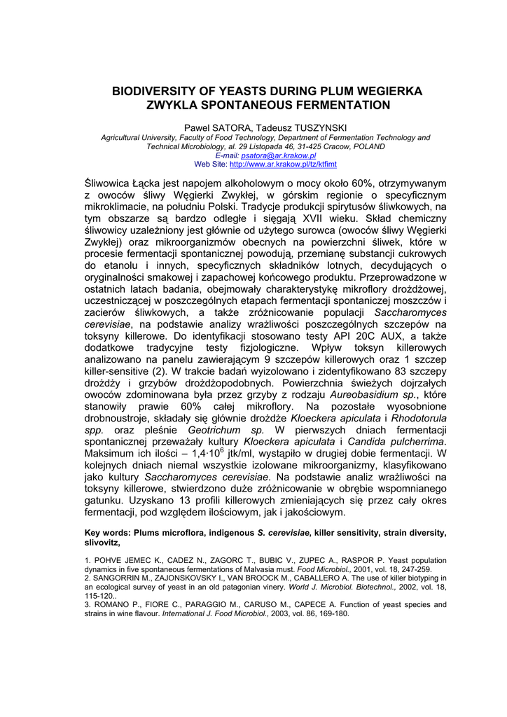 BIODIVERSITY OF YEASTS DURING PLUM WEGIERKA ZWYKLA SPONTANEOUS FERMENTATION Pawel SATORA, Tadeusz TUSZYNSKI Agricultural University, Faculty of Food Technology, Department of Fermentation Technology and Technical Microbiology, al. 29 Listopada 46, 31-425 Cracow, POLAND E-mail: [email protected] Web Site: http://www.ar.krakow.pl/tz/ktfimt Śliwowica Łącka jest napojem alkoholowym o mocy około 60%, otrzymywanym z owoców śliwy Węgierki Zwykłej, w górskim regionie o specyficznym mikroklimacie, na południu Polski. Tradycje produkcji spirytusów śliwkowych, na tym obszarze są bardzo odległe i sięgają XVII wieku. Skład chemiczny śliwowicy uzależniony jest głównie od użytego surowca (owoców śliwy Węgierki Zwykłej) oraz mikroorganizmów obecnych na powierzchni śliwek, które w procesie fermentacji spontanicznej powodują, przemianę substancji cukrowych do etanolu i innych, specyficznych składników lotnych, decydujących o oryginalności smakowej i zapachowej końcowego produktu. Przeprowadzone w ostatnich latach badania, obejmowały charakterystykę mikroflory drożdżowej, uczestniczącej w poszczególnych etapach fermentacji spontaniczej moszczów i zacierów śliwkowych, a także zróżnicowanie populacji Saccharomyces cerevisiae, na podstawie analizy wrażliwości poszczególnych szczepów na toksyny killerowe. Do identyfikacji stosowano testy API 20C AUX, a także dodatkowe tradycyjne testy fizjologiczne. Wpływ toksyn killerowych analizowano na panelu zawierającym 9 szczepów killerowych oraz 1 szczep killer-sensitive (2). W trakcie badań wyizolowano i zidentyfikowano 83 szczepy drożdży i grzybów drożdżopodobnych. Powierzchnia świeżych dojrzałych owoców zdominowana była przez grzyby z rodzaju Aureobasidium sp., które stanowiły prawie 60% całej mikroflory. Na pozostałe wyosobnione drobnoustroje, składały się głównie drożdże Kloeckera apiculata i Rhodotorula spp. oraz pleśnie Geotrichum sp. W pierwszych dniach fermentacji spontanicznej przeważały kultury Kloeckera apiculata i Candida pulcherrima. Maksimum ich ilości – 1,4·106 jtk/ml, wystąpiło w drugiej dobie fermentacji. W kolejnych dniach niemal wszystkie izolowane mikroorganizmy, klasyfikowano jako kultury Saccharomyces cerevisiae. Na podstawie analiz wrażliwości na toksyny killerowe, stwierdzono duże zróżnicowanie w obrębie wspomnianego gatunku. Uzyskano 13 profili killerowych zmieniających się przez cały okres fermentacji, pod względem ilościowym, jak i jakościowym. Key words: Plums microflora, indigenous S. cerevisiae, killer sensitivity, strain diversity, slivovitz, 1. POHVE JEMEC K., CADEZ N., ZAGORC T., BUBIC V., ZUPEC A., RASPOR P. Yeast population dynamics in five spontaneous fermentations of Malvasia must. Food Microbiol., 2001, vol. 18, 247-259. 2. SANGORRIN M., ZAJONSKOVSKY I., VAN BROOCK M., CABALLERO A. The use of killer biotyping in an ecological survey of yeast in an old patagonian vinery. World J. Microbiol. Biotechnol., 2002, vol. 18, 115-120.. 3. ROMANO P., FIORE C., PARAGGIO M., CARUSO M., CAPECE A. Function of yeast species and strains in wine flavour. International J. Food Microbiol., 2003, vol. 86, 169-180.