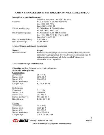 KARTA CHARAKTERYSTYKI PREPARATU NIEBEZPIECZNEGO Identyfikacja przedsiębiorstwa: Zakłady Chemiczne „ANSER” Sp. z o.o. Siedziba: Ul. J. Conrada 7, 01-922 Warszawa tel.: (022) 663 70 73 fax.: (022) 669 01 22 Zakład produkcyjny: Ul. Wjazdowa 4, 26-600 Radom tel./fax.: (048) 341 53 63 Dział technologiczny: Ul. Chemików 1, 96-315 Wiskitki tel.: (046) 856 73 40 do 49 wew. 208 fax.: (046) 856 73 50 Data opracowania karty: 9.01.2004 r. Data aktualizacji: 04.05.2006 r. 1. Identyfikacja substancji chemicznej. Nazwa: Przeznaczenie: Patyna Farba do dekoracyjnego malowania powierzchni metalowych i niemetalowych (ceramika, drewno, tworzywa sztuczne) oraz do dekorowania pomalowanych farbą „rustikal” stalowych elementów bram i ogrodzeń. 2. Skład/informacja o składnikach. Charakterystyka: Farba na bazie żywicy alkidowej. Składniki niebezpieczne: Cykloparafiny Zawartość: 36 ÷ 46 % Numer CAS: 1678-91-7 Numer WE: 216-835-0 Numer indeksowy: Klasyfikacja: F, Xn; R 11-65 Etylobenzen Zawartość: Numer CAS: Numer WE: Numer indeksowy: Klasyfikacja: 5 ÷ 15 % 100-41-4 202-849-0 601-023-00-4 F, Xn; R 11-20 Ksyleny Zawartość: Numer CAS: Numer WE: Numer indeksowy: Klasyfikacja: 10 ÷ 20 % 1330-20-7 215-535-7 601-022-00-9 Xn; R 10-20/21-38 1 Zakłady Chemiczne Sp. z o.o. Karta charakterystyki preparatu niebezpiecznego Patyna 3. Identyfikacja zagrożeń. Produkt wysoce łatwopalny. Działa szkodliwie przez drogi oddechowe. Działa drażniąco na skórę. 4. Pierwsza pomoc. Zatrucie inhalacyjne Wyprowadzić zatrutego z miejsca narażenia. Zapewnić spokój w dowolnej pozycji, chronić przed utratą ciepła. Podawać tlen do oddychania. Wezwać lekarza. Skażenie skóry Zdjąć odzież. Zmyć skórę dużą ilością letniej wody (z mydłem, jeżeli nie ma zmian). W razie podrażnienia skóry wskazana jest konsultacja dermatologa. Skażenie oczu Przemywać oczy dużą ilością chłodnej wody około 15 minut. Unikać silnego strumienia wody wobec ryzyka uszkodzenia rogówki. Zapewnić konsultację okulistyczną. Zatrucie drogą pokarmową Natychmiast po połknięciu (w czasie do 5 minut!) poszkodowany powinien sam wywołać wymioty. Później nie wywoływać wymiotów. Podać 150 ml parafiny. Nie podawać niczego innego do picia. Skontaktować się z lekarzem. 5. Postępowanie w przypadku pożaru. Szczególne zagrożenia Wysoce łatwopalna, drażniąca ciecz. Pary tworzą mieszaniny wybuchowe z powietrzem. Pary są cięższe od powietrza, gromadzą się przy powierzchni ziemi i w dolnych partiach pomieszczeń. Zbiorniki narażone na działanie ognia lub wysokiej temperatury mogą eksplodować. Zalecenia ogólne Zawiadomić otoczenie o awarii. Usunąć z obszaru zagrożenia wszystkie osoby nie biorące udziału w likwidowaniu awarii; w razie potrzeby zarządzić ewakuację. Wezwać Straż Pożarną i Policję Państwową. Pożar Środki gaśnicze: proszki gaśnicze, dwutlenek węgla, piany gaśnicze, woda – prądy rozproszone. Mały pożar: gasić gaśnicą proszkową lub śniegową (dwutlenek węgla). Duży pożar: palące się zbiorniki lub rozlewiska gasić pianą lub prądami wodnymi rozproszonymi; nie stosować zwartych strumieni wody na powierzchnię cieczy. Zbiorniki Zakłady Chemiczne Sp. z o.o. Karta charakterystyki preparatu niebezpiecznego 2 Patyna narażone na działanie ognia lub wysokiej temperatury chłodzić wodą z bezpiecznej odległości; jeżeli to możliwe, usunąć je z obszaru zagrożenia (groźba wybuchu). Specjalne wyposażenie ochronne Nałożyć odzież ochronną i aparat izolujący drogi oddechowe. 6. Postępowanie w przypadku niezamierzonego uwolnienia do środowiska. Zalecenia ogólne Jak podano w punkcie 5. Wyciek Uwaga: obszar zagrożony wybuchem. Usunąć źródła zapłonu (ugasić otwarty ogień, ogłosić zakaz palenia i używania narzędzi iskrzących); pary rozcieńczać rozproszonymi prądami wody; zabezpieczyć studzienki ściekowe; unikać bezpośredniego kontaktu z uwalniającą się substancją; jeśli to możliwe, zlikwidować wyciek (zamknąć dopływ cieczy, uszczelnić, uszkodzone opakowanie umieścić w szczelnym opakowaniu ochronnym); w razie dużego wycieku miejsce gromadzenia się cieczy obwałować, zebraną ciecz odpompować; małe ilości rozlanej cieczy przysypać niepalnym materiałem chłonnym, zebrać do zamykanego pojemnika; zanieczyszczoną powierzchnię spłukać wodą. 7. Obchodzenie się z substancją i magazynowanie. Obchodzenie się z substancją: podczas stosowania nie jeść, nie pić, unikać kontaktu z cieczą, unikać wdychania par, przestrzegać zasad higieny osobistej; stosować środki ochrony indywidualnej (jak podano w punkcie 8), pracować w dobrze wentylowanych pomieszczeniach; unikać działania na substancję otwartego ognia i wysokiej temperatury. Rodzaj magazynu: ogólny magazyn chemiczny 8. Kontrola narażenia/środki ochrony indywidualnej. Wymagania dotyczące wentylacji Niezbędna wentylacja miejscowa wywiewna, usuwająca pary z miejsc ich emisji, oraz wentylacja ogólna pomieszczenia. Otwory zasysające wentylacji miejscowej przy płaszczyźnie roboczej lub poniżej. Wywiewniki wentylacji ogólnej w górnej części pomieszczenia oraz przy podłodze. Instalacje wentylacyjne muszą odpowiadać warunkom ustalonym ze względu na niebezpieczeństwo pożaru lub wybuchu. Najwyższe dopuszczalne stężenia Produkty naftowe NDS 100 mg/m3 NDSCh 300 mg/m3 NDSP – Ksyleny NDS 100 mg/m3 (mieszanina izomerów) NDSCh 350 mg/m3 NDSP – 3 Zakłady Chemiczne Sp. z o.o. Karta charakterystyki preparatu niebezpiecznego Patyna Etylobenzen NDS 100 mg/m3 NDSCh 350 mg/m3 NDSP – Oznaczanie w powietrzu na stanowiskach pracy PN-78/Z-04116 ark. 01 Ochrona czystości powietrza. Badania zawartości ksylenu. Oznaczanie ksylenu na stanowiskach pracy metodą chromatografii gazowej z wzbogaceniem próbki. PN-89/Z-04023 ark.02 Ochrona czystości powietrza. Badania zawartości (w mieszaninach) szkodliwych substancji wydzielających się z wyro