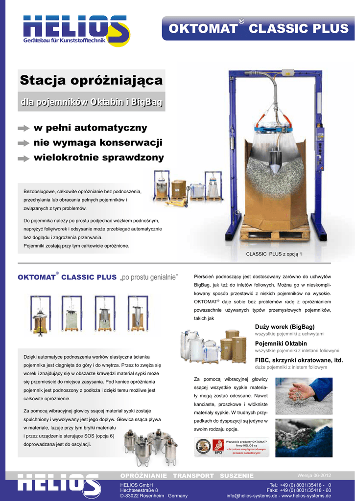 ® Oktomat Classic PLUS Gerätebau für Kunststofftechnik Stacja opróżniająca dla pojemników Oktabin i BigBag w pełni automatyczny nie wymaga konserwacji wielokrotnie sprawdzony Bezobsługowe, całkowite opróżnianie bez podnoszenia, przechylania lub obracania pełnych pojemników i związanych z tym problemów. Do pojemnika należy po prostu podjechać wózkiem podnośnym, naprężyć folię/worek i odsysanie może przebiegać automatycznie bez doglądu i zagrożenia przerwania. Pojemniki zostają przy tym całkowicie opróżnione. CLASSIC PLUS z opcją 1 ® OKTOMAT CLASSIC PLUS „po prostu genialnie” Pierścień podnoszący jest dostosowany zarówno do uchwytów BigBag, jak też do inletów foliowych. Można go w nieskomplikowany sposób przestawić z niskich pojemników na wysokie. OKTOMAT® daje sobie bez problemów radę z opróżnianiem powszechnie używanych typów przemysłowych pojemników, takich jak Duży worek (BigBag) wszystkie pojemniki z uchwytami Pojemniki Oktabin wszystkie pojemniki z inletami foliowymi Dzięki automatyce podnoszenia worków elastyczna ścianka FIBC, skrzynki okratowane, itd. pojemnika jest ciągnięta do góry i do wnętrza. Przez to zwęża się worek i znajdujący się w obszarze krawędzi materiał sypki może się przemieścić do miejsca zasysania. Pod koniec opróżniania pojemnik jest podnoszony z podłoża i dzięki temu możliwe jest całkowite opróżnienie. duże pojemniki z inletem foliowym Za pomocą wibracyjnej głowicy ssącej wszystkie sypkie materiały mogą zostać odessane. Nawet kanciaste, proszkowe i włókniste Za pomocą wibracyjnej głowicy ssącej materiał sypki zostaje materiały sypkie. W trudnych przy- spulchniony i wywoływany jest jego dopływ. Głowica ssąca pływa padkach do dyspozycji są jedyne w w materiale, luzuje przy tym bryłki materiału swoim rodzaju opcje. i przez urządzenie sterujące SOS (opcja 6) Wszystkie produkty OKTOMAT® firmy HELIOS są chronione międzynarodowym prawem patentowym! doprowadzana jest do oscylacji. OPRÓŻNIANIE TRANSPORT SUSZENIE HELIOS GmbH Hechtseestraße 8 D-83022 Rosenheim Germany Wersja 06-2012 Tel.: +49 (0) 8031/35418 - 0 Faks: +49 (0) 8031/35418 - 60 [email protected] - www.helios-systems.de ® Oktomat Classic PLUS Gerätebau für Kunststofftechnik Urządzenia sterujące Wersja standardowa Wersja portalu ze stali powlekanej proszkowo (RAL 5002) Uniwersalny pierścień podnoszący Ø 600 mm ze stali szlachetnej 1.4301 do inletów foliowych i kieszeni BigBag Automatyczne podnoszenie worków Wibracyjna głowica ssąca typu S, średnica rury tłoczącej 38 lub 50 mm ze stali szlachetnej 1.4301 Włączanie odbywa przez automatyczne wykrywanie dostępności próżni Automatyczny wybieg głowicy ssącej przez przeciwwagę Zgłaszanie opróżnienia przez lampkę LED Wysokość ustawienia 2620–3670 mm Wyposażenie w opcje 1–10 możliwe także w późniejszym czasie Dostosowane do pojemników o wysokości do 2200 mm Szybkie dopasowanie do różnych wysokości pojemników Opcjonalny sterownik 1/2 Odporność na zużycie, niewielkie nakłady konserwacji Opcjonalny sterownik 1/2/6/9/10 ® OKTOMAT CLASSIC PLUS „po prostu genialnie“ Opcje Akcesoria Opcja 1Sterowanie regulowanym czasem usuwania resztek Opcja 5Wibrator(-y) sprężonego powietrza Opcja 2Automatyczne ponowne przełączanie na drugi pojemnik Opcja 6 Opcja 3Specjalne głowice ssące S-80 lub XL-80 Ø 38/50/65/80 mm ze stali szlachetnej 1.4301 Opcja 4Dodatkowy ciężarek dla głowicy ssącej dla głowicy ssącej ►Ścianka osłonowa z przezroczystego PCW dla pierścienia podnoszącego Oscylująca głowica ssąca ►Specjalne pierścienie podnoszące o średnicy Ø 260/400/800 mm Opcja 7Fluidyzacja działkami ze sprężonym ►Zwiększona siła podnoszenia worków 2400 N (zamiast 1500 N) powietrzem Opcja 8Wersja ATEX, strefa 2/22 ►Pilot z kablem 5 m Opcja 9Automatyczne podnoszenie i opuszczanie ►Ważenie ilości resztkowej z urządzeniem sterującym Oktabag pierścienia podnoszącego S-38/50 ►Wersja głowicy ssącej Clean ze stali szlachetnej 1.4408 Opcja 10 Funkcja pustego zasysania OKTOMAT Classic 1525 mm ® 1160 mm 1295 mm Wszystkie produkty OKTOMAT® firmy HELIOS są chronione międzynarodowym prawem patentowym! montowany wstępnie w skrzyni transportowej OPRÓŻNIANIE TRANSPORT SUSZENIE HELIOS GmbH Hechtseestraße 8 D-83022 Rosenheim Germany Wersja 6-2012 Tel.: +49 (0) 8031/35418 - 0 Faks: +49 (0) 8031/35418 - 60 [email protected] - www.helios-systems.de 2012_06_DB_OKTOMAT-Classic_PL | Zmiany zastrzeżone! min. 2620 mm — maks. 3670 mm Tysiące zastosowań na całym świecie
