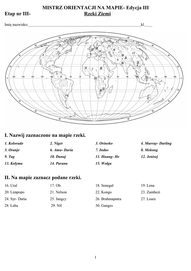 Etap nr III- MISTRZ ORIENTACJI NA MAPIE- Edycja III Rzeki Ziemi Imię nazwisko: kl. I. Nazwij zaznaczone na mapie rzeki. 1. Kolorado 2. Niger 3. Orinoko 4. Murray- Darling 5. Oranje 6. Amu- Daria 7. Indus 8. Mekong 9. Tag 10. Dunaj 11. Huang- He 12. Jenisej 13. Kołyma 14. Parana 15. Wołga II. Na mapie zaznacz podane rzeki. 16..Ural 17. Ob. 18. Senegal 19. Lena 20. Limpopo 21. Nelson 22. Kongo 23. Zambezi 24. Syr- Daria 25. Jangcy 26. Brahmaputra 27. Loara 28. Łaba 29. Nil 30. Ganges 1 Bonus- Prądy morskie Nazwij zaznaczone na mapie prądy morskie: 1.Północnorównikowy 2.Południoworównikowy 3.Równikowy Wsteczny 4. Północnopacyficzny 5.Zatokowy 6.Północnoatlantycki 7.Norweski 8. Kuro- Siwo 9.Madagaskarski 10.Mozambicki 11.Somalijski 12. Wschodnioaustralijski 13. Gwinejski 14. Brazylijski 15. Dryf Wiatrów Zachodnich16.Grenlandzki 17. Labradorski 18. Kalifornijski 19. Peruwiański 21. Zachodnioaustralijski 22. Oja- Siwo 23. Kanaryjski 20.Benguelski Złoty bonus!!! Podkreśl ciepłe prądy morskie!!! Rozwiązanie: Przerywaną linia zaznaczono prądy zimne 2
