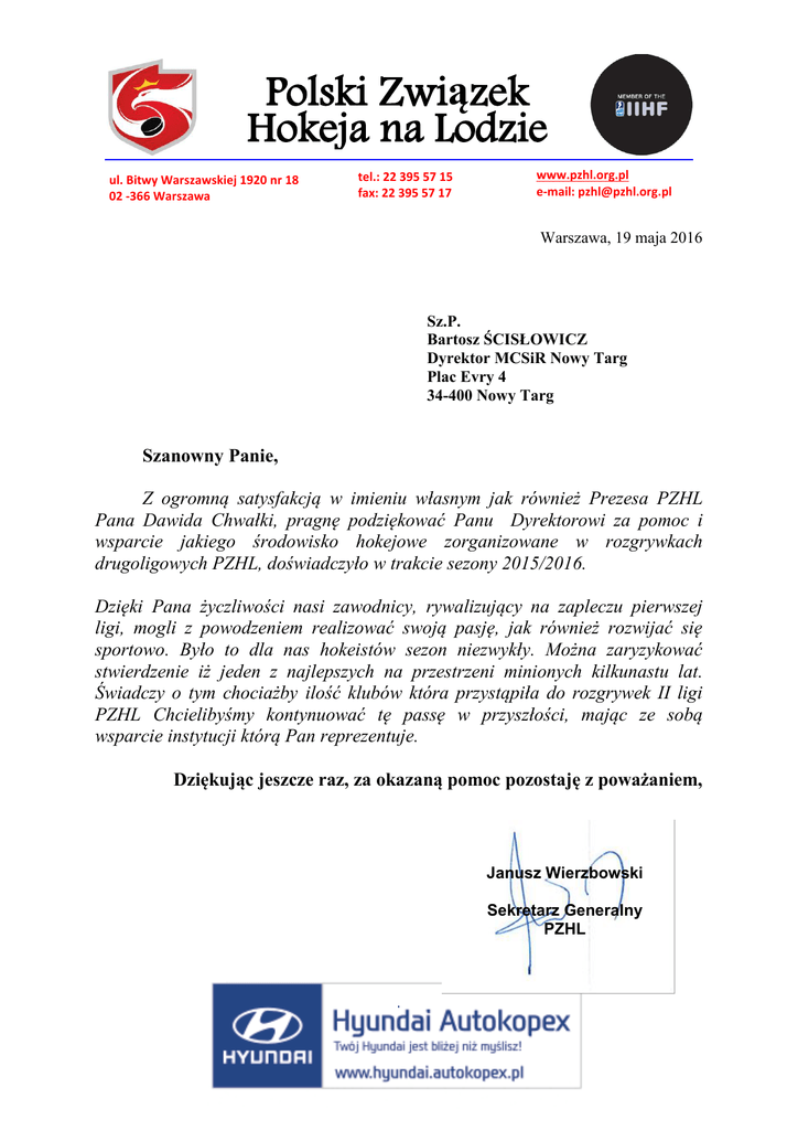 Polski Związek Hokeja na Lodzie ul. Bitwy Warszawskiej 1920 nr 18 02 -366 Warszawa tel.: 22 395 57 15 fax: 22 395 57 17 www.pzhl.org.pl e-mail: [email protected] Warszawa, 19 maja 2016 Sz.P. Bartosz ŚCISŁOWICZ Dyrektor MCSiR Nowy Targ Plac Evry 4 34-400 Nowy Targ Szanowny Panie, Z ogromną satysfakcją w imieniu własnym jak również Prezesa PZHL Pana Dawida Chwałki, pragnę podziękować Panu Dyrektorowi za pomoc i wsparcie jakiego środowisko hokejowe zorganizowane w rozgrywkach drugoligowych PZHL, doświadczyło w trakcie sezony 2015/2016. Dzięki Pana życzliwości nasi zawodnicy, rywalizujący na zapleczu pierwszej ligi, mogli z powodzeniem realizować swoją pasję, jak również rozwijać się sportowo. Było to dla nas hokeistów sezon niezwykły. Można zaryzykować stwierdzenie iż jeden z najlepszych na przestrzeni minionych kilkunastu lat. Świadczy o tym chociażby ilość klubów która przystąpiła do rozgrywek II ligi PZHL Chcielibyśmy kontynuować tę passę w przyszłości, mając ze sobą wsparcie instytucji którą Pan reprezentuje. Dziękując jeszcze raz, za okazaną pomoc pozostaję z poważaniem, Janusz Wierzbowski Sekretarz Generalny PZHL