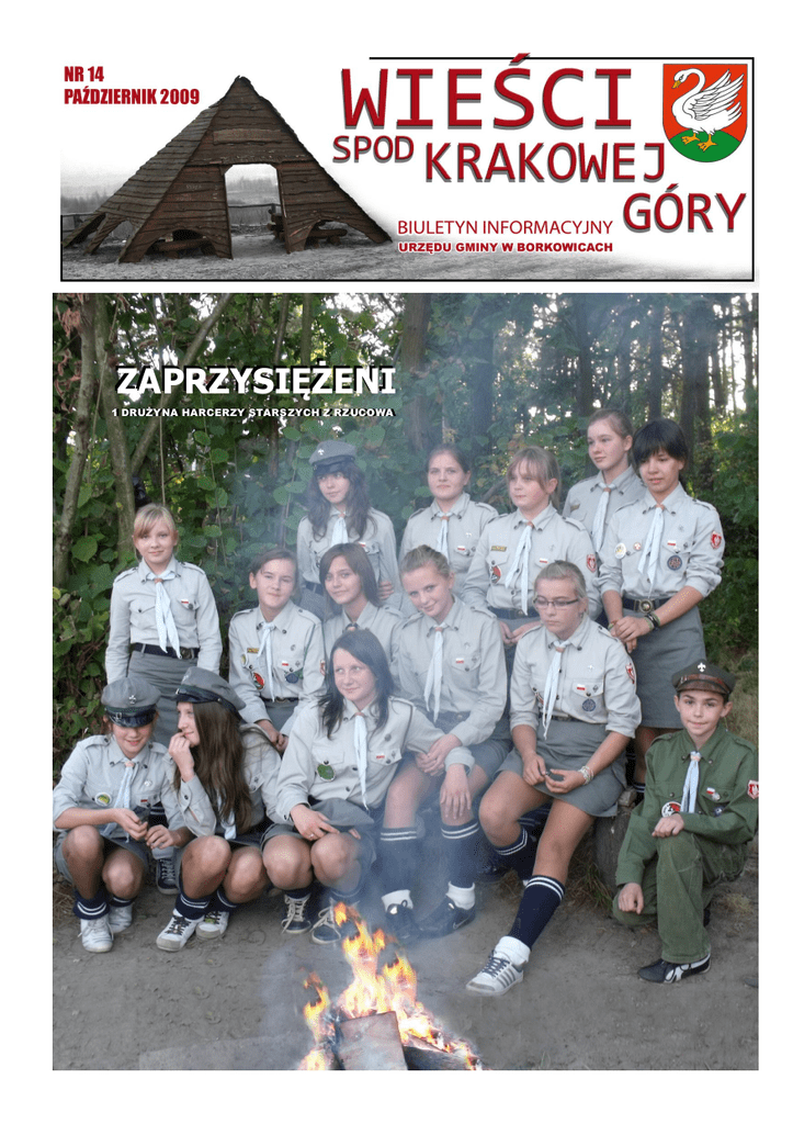 ZAPRZYSIĘŻENI 11 DRUŻY DRUŻYNA NA HARCERZY HARCERZY STARSZYCH STARSZYCH ZZ RZUCOWA RZUCOWA 1 NA DOBRY POCZĄTEK: Drodzy Czytelnicy! Jesień przyszła, nie ma rady na to. W połowie października przyszła nawet zima, ale tylko na tydzień. Nie ma co się jednak łudzić. Wróci. To pewne: cieplej nie będzie. Przynajmniej przez najbliższe pół roku. I co tu robić? Wszak w deszcz nudzą się nie tylko dzieci. Rada jest prosta: ciepły koc, gorąca herbata i najgorętszy - bo prosto z drukarni - numer naszego pisma. Miłej lektury! a Redakcja TABLICA OGŁOSZEŃ GOK: GMINNY OŚRODEK KULTURY CZYNNY JEST RÓWNIEŻ W SOBOTY I NIEDZIELE W GODZINACH 16.00 - 21.00 KONKURS: 2 GMINNY OŚRODEK KULTURY ZAPRASZA NA KURS TAŃCA TOWARZYSKIEGO DLA DOROSŁYCH I MŁODZIEŻY PIĄTKI, GODZ. 19.30 ZAPISY TRWAJĄ GMINNY OŚRODEK KULTURY ZAPRASZA NA ZAJĘCIA AEROBICU ZAPISY TRWAJĄ :GOK WIECZÓR LITERACKI SPOTKANIE AUTORSKIE PANI DANUTY SKALSKIEJ 11 października w sali kameralnej Gminnego Ośrodka Kultury miało miejsce spotkanie autorskie promujące najnowszą książkę znanej choćby z naszych łamów - pisarki pani Danuty Skalskiej. Jej najnowsze dzieło zatytułowane „Ocalanie miłości” to zbiór trzech opowiadań zainspirowanych najbliższym regionem. Spotkanie rozpoczęło się od przedstawienia przez organizatorów sylwetki bohaterki wieczoru. Następnie sama autorka mówiła o sobie, swojej twórczości i najnowszej książce. Ponadto odczytała fragmenty publikowanych tam opowiadań oraz zaprezentowała swoje ulubione wiersze oraz fragmenty prozatorskie. W przerwach pomiędzy kolejnymi porcjami literatury wystąpiła młodzież z muzycznych kół GOK-u przygotowana przez pana Zbigniewa Bidzińskiego, która wykonała filmowe standardy z muzyką z „07 zgłoś się” i „Ojca chrzestnego” na czele. Ponadto pan Waldemar Cichawa wykonał mini-koncert poezji śpiewanej muzycznie interpretując utwory klasyków polskiej liryki m.in. Leopolda Staffa, Edwarda Stachury i Juliana Tuwima. Na koniec spotkania radny Borkowic pan Piotr Kowalski w imieniu Rady Gminy złożył autorce życzenia dalszej owocnej pracy twórczej oraz wręczył upominek. Wieczór zakończyło oczywiście podpisanie przez pisarkę książek. 3 KRONIKA HARCERSKA: RUSZYŁ ROK HARCERSKI 2009 - 2010 Jak co roku we wrześniu harcerze z Borkowic wraz z innymi druhami Hufca ZHP Przysucha uroczyście rozpoczęli nowy rok harcerski podczas odbywającego się w Topornii w dniach 11-13 września ,,Harcerskiego Startu”. Tydzień później borkowiccy harcerze wzięli udział w Dniach Chorągwi Mazowieckiej, które odbywały się na stanicy w Gorzewie koło Płocka. Program imprezy obejmował przejście trasy na orientację, wystawę regionalną, gry i zabawy harcerskie oraz rozstrzygnięcie konkursu na projekt ,,A niech to szlak”, który realizowała borkowicka 5 Wielopoziomowa Drużyna Harcerska. Biorący w niej udział harcerze otrzymali od komendanta chorągwi Regionalne Odznaki Chorągwi Mazowieckiej. Imprezę uświetnił występ zespołu Bayer Full, którego lider Sławek Świerzyński harcerzem jest od wielu lat. 26 września miała miejsce tradycyjnie organizowana na Krakowej Górze przez naszych harcerzy Polowa Msza Harcerska, którą odprawił ks. Piotr Nojek wspólnie z p. Michałem Kołodziejczykiem. Nabożeństwo uświetniła gra Powiatowej Młodzieżowej Orkiestry Dętej kierowanej przez p. Waldemara Cichawę. We mszy uczestniczył Wójt Gminy Borkowice Lech Fidos, instruktorzy Hufca ZHP Przysucha oraz mieszkańcy Borkowic i młodzież szkolna. Po mszy przy ognisku phm. Marek Turek przeprowadził ceremonię przyrzeczenia harcerskiego. 14 harcerzy z 1 Drużyny Harcerzy Starszych z Rzucowa złożyło przyrzeczenie i otrzymało krzyże harcerskie z rąk drużynowej dh. Agnieszki Powideł stając się w ten sposób pełnoprawnymi członkami ZHP. Następnie miało miejsce tradycyjne ognisko. W dniach 9-11 października harcerze naszej gminy (z 5 WDH Borkowice i 1 DHS Rzuców) uczestniczyli w zorganizowanych przez instruktora Wydziału Programowego Kwatery Głównej ZHP phm. Pawła Chmielewskiego warsztatach z cyklu ,,7 recept na dobrą drużynę”, z których druhowie dowiedzieli się między innymi o korzyściach organizowania obozów, ich uwarunkowaniach prawnych, o obozowej kadrze, budżecie i pozyskiwaniu środków oraz współpracy z rodzicami, sprawach wychowawczych, ponadto o aktualnych propozycjach programowych ZHP związanych z turystyką i 600-ną rocznicą bitwy pod Grunwaldem, co ważne, gdyż w najbliższym czasie harcerze z Borkowic i Rzucowa będą realizować zadania mające na celu zdobycie tytułu drużyny grunwaldzkiej oraz odznaki Grunwald 2010. Czuwaj! phm. Marek Turek 4 :KRONIKA STRAŻACKA ZAWODY STRAŻACKIE 6 września na stadionie i obiektach przysuskiego klubu sportowego „Oskar” odbyły się zawody sportowo-pożarnicze. Rywalizację przeprowadzono w dwóch kategoriach wiekowych: strażaków grupy A (seniorzy) i strażaków młodzieżowych drużyn pożarniczych według regulaminu CTIF. W zawodach wzięło udział 9 jednostek Ochotniczej Straży Pożarnej z terenu powiatu przysuskiego: Przysucha, Skrzyńsko, Grabowa, Wir, Klwów, Sulgostów, Smogorzów oraz reprezentujący naszą gminę strażacy z Borkowic (grupa A i drużyna młodzieżowa - przygotowywane przez naczelnika Roberta Siudka) i Ninkowa (grupa A - przygotowywana przez naczelnika dh Wojciecha Łobodzińskiego). Zawody składały się z dwóch konkurencji: 1. sztafety 7 x 50 metrów z przeszkodami; 2. ćwiczenia bojowego - które wykonywano na czas. Komisję sędziowską tworzyli druhowie z Komendy Powiatowej PSP z Szydłowca. W rywalizacji grupy A strażacy z Ninkowa - po druhach z Klwowa i Przysuchy - zajęli 3 miejsce. Strażacy z Borkowic, którzy po sztafecie zajmowali 1 miejsce - w następstwie awarii motopompy - ostatecznie zakończyli zawody na 7 miejscu. Więcej szczęścia mięli ich młodsi koledzy, którzy zwyciężyli w