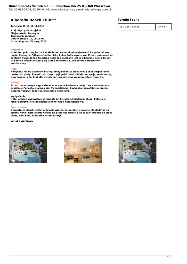 Biuro Podróży WIGRA s.c. ul. Człuchowska 25 01-360 Warszawa Tel. 22 665 06 06, 22 664 94 86, www.wigra.com.pl, e-mail: [email protected] Alborada Beach Club*** Teneryfa 09.11-16.11.2015 Termin i cena 09.11-16.11.2015 3049 zł Kraj: Wyspy Kanaryjskie Miejscowość: Teneryfa Transport: Samolot Data ważności: 2015-11-09 Nr katalogowy: Wczasy/2015 Położenie Hotel ten położony jest w Las Galletas, kameralnej miejscowości w południowej części Teneryfy. Odległość od lotniska Reina Sofia wynosi ok. 12 km, natomiast od centrum Playa de las Americas hotel ten położony jest w odległości około 15 km. W pobliżu hotelu znajdują się liczne restauracje, sklepy oraz przystanek autobusowy. Hotel Kompleks ma do zaoferowania ogromny basen ze słoną wodą oraz bezpośredni dostęp do plaży. Ponadto do dyspozycji gości hotel oddaje: recepcję, restaurację, dwa baseny, mini klub dla dzieci, bar, pralnię oraz wypożyczalnię rowerów. Pokoje Przestronne pokoje wyposażone są w aneks kuchenny połączony z salonem oraz sypialnię. Ponadto znajdują się: TV satelitarna, kuchenka mikrofalowa, czajnik bezprzewodowy, lodówka oraz stół z krzesłami. Wyżywienie Hotel oferuje wyżywienie w formule All Inclusive.Śniadania, obiad, kolacja w formie bufetu, lokalne napoje alkoholowe i bezalkoholowe. Sport i relaks Bezpłatnie: bilard, rzutki, animacje wieczorne,aerobic w wodzie. Za dodatkową opłatą: tenis, golf, sporty wodne na plaży.Dla dzieci: plac zabaw, brodzik ze słoną wodą, mini klub, krzesełka w restauracji. Wylot z Warszawy 1/1 Powered by TCPDF (www.tcpdf.org)