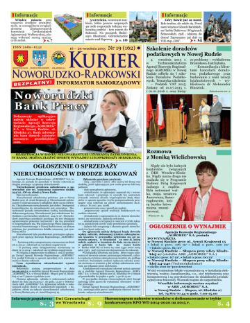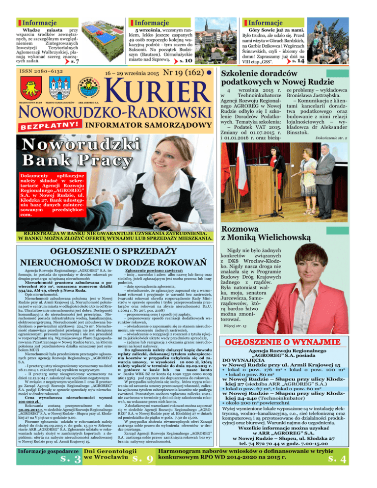 Informacje Informacje 5 września, wczesnym rankiem, lekko jeszcze zaspanych 49 osób rozpoczęło kolejną wakacyjną podróż - tym razem do Saksonii. Na początek Budziszyn (Bautzen). Górnołużyckie miasto nad Szprewą. s. 10 Władze miasta przy wsparciu środków zewnętrznych, ze szczególnym uwzględnieniem Zintegrowanych Inwestycji Terytorialnych Aglomeracji Wałbrzyskiej, planują wykonać szereg znaczących zadań. s. 7 i s s n 2 0 8 0 – 61 3 2 b e z p ł at n 16 – 29 września 2015 y! Nr 19 (162) informator samorządowy Noworudzki Bank Pracy Informacje Góry Sowie już za nami. Było trudno, ale udało się. Przed nami wizyta w Górach Bardzkich, na Garbie Dzikowca i Wzgórzach Ścinawskich, czyli - idziemy do domu! Zapraszamy już dziś na s. 14 VIII etap „GSS”. Szkolenie doradców podatkowych w Nowej Rudzie 4 września 2015 r. w Technoinkubatorze Agencji Rozwoju Regionalnego AGROREG w Nowej Rudzie odbyło się I szkolenie Doradców Podatkowych. Tematyka szkolenia: – Podatek VAT 2015. Zmiany od 01.07.2015 r. i 01.01.2016 r. oraz bieżą- ce problemy – wykładowca Bronisława Jastrzębska. – Komunikacja z klientami kancelarii doradztwa podatkowego oraz budowanie z nimi relacji lojalnościowych – wykładowca dr Aleksander Binsztok. Dokończenie str. 2 Dokumenty aplikacyjne należy składać w sekretariacie Agencji Rozwoju Regionalnego „Agroreg” S.A. w Nowej Rudzie, ul. Kłodzka 27. Bank udostępnia bazę danych zainteresowanym przedsiębiorcom. REJESTRACJA W BANKU NIE GWARANTUJE UZYSKANIA ZATRUDNIENIA. W BANKU MOŻNA ZŁOŻYĆ OFERTĘ WYNAJMU LUB SPRZEDAŻY MIESZKANIA. OGŁOSZENIE O SPRZEDAŻY NIERUCHOMOŚCI W DRODZE ROKOWAŃ Agencja Rozwoju Regionalnego „AGROREG” S.A. informuje, że posiada do sprzedaży w drodze rokowań po drugim przetargu n/opisaną nieruchomość: Nieruchomość gruntowa zabudowana o powierzchni 160 m2, oznaczona numerem działki 334/22, AM-19, obręb 3 Nowa Ruda. Opis nieruchomości. Nieruchomość zabudowana położona jest w Nowej Rudzie przy ul. Armii Krajowej 15. Nieruchomość położona jest w centrum miasta w odległości około 150 m od Rynku. Ukształtowanie nieruchomości jest dobre. Dostępność komunikacyjna do nieruchomości jest przeciętna. Nieruchomość posiada infrastrukturę wodną, kanalizacyjna, elektroenergetyczną. Nieruchomość jest zabudowana budynkiem o powierzchni użytkowej 224,70 m2. Nieruchomość stanowiąca przedmiot przetargu nie jest obciążona ograniczonymi prawami rzeczowymi i nie ma przeszkód w rozporządzaniu nią. Wg miejscowego Planu Zagospodarowania Przestrzennego w Nowej Rudzie teren, na którym położona jest przedmiotowa działka oznaczony jest symbolem MUCi Nieruchomość była przedmiotem przetargów ogłoszonych przez Agencję Rozwoju Regionalnego „AGROREG” S.A. - I przetarg ustny nieograniczony wyznaczony na dzień 28.11.2014 r. zakończył się wynikiem negatywnym - II przetarg ustny nieograniczony wyznaczony na dzień 12.12.2014 r. zakończył się wynikiem negatywnym W związku z negatywnym wynikiem I oraz II przetargu Zarząd Agencji Rozwoju Regionalnego „AGROREG” S.A. podjął Uchwałę w sprawie sprzedaży w/w nieruchomości w drodze rokowań. Cena wywoławcza nieruchomości wynosi 100 000 zł. Rokowania zostaną przeprowadzone w dniu 30.09.2015 r, w siedzibie Agencji Rozwoju Regionalnego „AGROREG” S.A. w Nowej Rudzie - Słupcu przy ul. Kłodzkiej 27 na V piętrze o godzinie 9.00. Pisemne zgłoszenia udziału w rokowaniach należy złożyć do dnia 29.09.2015 r. do godz. 15.30 w Sekretariacie ARR „AGROREG” S.A. Zgłoszenie udziału w rokowaniach należy złożyć w zamkniętych kopertach z dopiskiem: oferta na nabycie nieruchomości zabudowanej w Nowej Rudzie przy ul. Armii Krajowej 15. Zgłoszenie powinno zawierać: - imię , nazwisko i adres albo nazwę lub firmę oraz siedzibę, jeżeli zgłaszającym jest osoba prawna lub inny podmiot, - datę sporządzenia zgłoszenia, - oświadczenie, że zgłaszający zapoznał się z warunkami rokowań i przyjmuje te warunki bez zastrzeżeń, (warunki rokowań określa rozporządzenie Rady Ministrów w sprawie sposobu i trybu przeprowadzenia przetargów oraz rokowań na zbycie nieruchomości Dz.U. z 2004 r. Nr 207, poz. 2108) - proponowaną cenę i sposób jej zapłaty, - proponowany sposób realizacji dodatkowych warunków rokowań, - oświadczenie o zapoznaniu się ze stanem nieruchomości, nie wnoszeniu żadnych zastrzeżeń, - oświadczenie o rezygnacji z roszczeń z tytułu rękojmi za jakiekolwiek ukryte wady przedmiotu sprzedaży, - żądanie lub rezygnację z okazania granic nieruchomości na koszt nabywcy. Do zgłoszenia należy dołączyć kopię dowodu wpłaty zaliczki, dokonanej tytułem zabezpieczenia kosztów w przypadku uchylenia się od zawarcia umowy, w wysokości 10 000 zł, którą należy wpłacić w terminie do dnia 29.09.2015 r. w gotówce w kasie lub na nasze konto w Banku WBK BZ nr konta 64 1090 2330 0000 0005 9601 5363 pod rygorem nie dopuszczenia do rokowań. W przypadku uchylenia się osoby, która wygra rokowania od zawarcia umowy przenoszącej własność, zaliczka wpłacona tytułem zabezpieczenia kosztów nie podlega zwrotowi. Pozostałym osobom wpłacona zaliczka zostanie zwrócona w terminie 3 dni od daty zakończenia rokowań, na wskazane przez nich konto. Z dodatkowymi warunkami rokowań można zapoznać się w siedzibie Agencji Rozwoju Regionalnego „AGROREG” S.A. w Nowej Rudzie przy ul. Kłodzkiej 27 w dniach od poniedziałku do piątku w godz. 7.30 do 15.00. W przypadku złożenia równorzędnych ofert Zarząd zastrzega sobie prawo do wyłonienia oferentów w drodze przetargu. Zarząd Agencji Rozwoju Regionalnego „AGROREG” S.A. zastrzega sobie prawo zamknięcia rokowań bez wybrania nabywcy nieruchomości. Informacje gospodarcze Dni Gerontologii we Wrocławiu s. 3 s. 9 Rozmowa z Moniką Wielichowską Nigdy nie było żadnych konkretów związanych z DK8 Wrocław-Kłodzko.