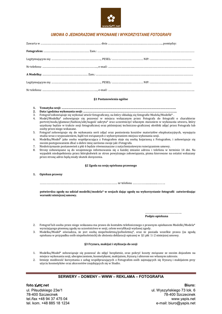 UMOWA O JEDNORAZOWE WYKONANIE I WYKORZYSTANIE FOTOGRAFII Zawarta w ……………………………………………………………………… dnia ………………………………………..…………………….., pomiędzy: Fotografem: ……………………………………………………. Zam.: …………………………………………………………………………………………………………………. Legitymującym się: …………………………………………………………, PESEL: …………………………………… NIP: ……………………………………………….. Nr telefonu: ……………………………………………………………….., e-mail: …………………………………………………………………………………………………….. A Modelką: ……………………………………………………. Zam.: …………………………………………………………………………………………………………………. Legitymującym się: …………………………………………………………, PESEL: …………………………………… NIP: ……………………………………………….. Nr telefonu: ……………………………………………………………….., e-mail: …………………………………………………………………………………………………….. §1 Postanowienia ogólne 1. 2. 3. 4. 5. 6. 7. 8. Tematyka sesji: ………………………………………………………………………………………………………………………………….. Data i godzina wykonania sesji: ………………………………………………………………………………………………………….. Fotograf zobowiązuje się wykonać utwór fotograficzny, na który składają się fotografie Modela/Modelki* . Model/Modelka* zobowiązuje się pozować w miejscu wskazanym przez Fotografa do fotografii o charakterze portret/moda/glamour/fashion/akt/nagość zakryta* oraz uczestniczyć własnym staraniem w wykonaniu utworu, który uzyskany będzie w trakcie sesji fotograficznej oraz późniejszej techniczno-graficznej obróbki zdjęć przez Fotografa lub osoby przez niego wskazane. Fotograf zobowiązuje się do wykonania serii zdjęć oraz poniesienia kosztów materiałów eksploatacyjnych, wynajęcia studia wraz z wyposażeniem, bądź też związanych z wykorzystaniem miejsca wykonania sesji. Modelka/Model* jako osoba współpracująca z Fotografem staje się osobą kojarzoną z Fotografem, i zobowiązuje się swoim postępowaniem dbać o dobre imię zarówno swoje jak i Fotografa. Niedotrzymanie postanowień z pkt 6 będzie równoznaczne z natychmiastowym rozwiązaniem umowy. Strony zobowiązane są do wzajemnego informowania się o każdej zmianie adresu i telefonu w terminie 14 dni. Na wypadek niedopełnienia przez którąkolwiek ze stron powyższego zobowiązania, pisma kierowane na ostatni wskazany przez stronę adres będą miały skutek doręczenia. §2 Zgoda na sesję opiekuna prawnego 1. Opiekun prawny ………………………………………………………………………………………….. nr telefonu ………………...................………. potwierdza zgodę na udział modelki/modela* w sesjach dając zgodę na wykorzystanie fotografii zatwierdzając warunki niniejszej umowy. …………………………………………. Podpis opiekuna 2. 3. Fotograf lub osoba przez niego wskazana ma prawo do kontaktu telefonicznego z prawnym opiekunem Modelki/Modela* wyrażającego pisemną zgodę na uczestnictwo w sesji, celem weryfikacji wydanej zgody. Modelka/Model* oświadcza, że jest osobą niepełnoletnią/pełnoletnią*, oraz że posiada wszelkie prawa (za zgodą opiekuna w przypadku osób niepełnoletnich) do złożenia deklaracji opisanej w §1 pkt 1 i 2 niniejszej umowy. §3 Fryzura, makijaż i stylizacja do sesji 1. 2. Modelka/Model* zobowiązuje się pozować do zdjęć bezpłatnie, oraz pokryć koszty związane ze swoim dojazdem na miejsce wykonania sesji, ubezpieczeniem, kosmetykami, makijażem, fryzurą i ubiorem we własnym zakresie. Istnieje możliwość korzystania z usług współpracujących z Fotografem osób zajmujących się fryzurą i makijażem przy użyciu kosmetyków oraz akcesoriów znajdujących się w Studio. SERWERY – DOMENY – WWW – REKLAMA – FOTOGRAFIA foto.YaPIS.net ul. Piłsudskiego 23e/1 78-400 Szczecinek tel./fax +48 94 37 475 04 tel. kom. +48 885 18 1234 Biuro: ul. Wyszyńskiego 73 lok. 6 78-400 Szczecinek www.yapis.net e-mail: [email protected] UMOWA O JEDNORAZOWE WYKONANIE I WYKORZYSTANIE FOTOGRAFII 3. W przypadku wykonania makijażu przez Modelkę/Modela* we własnym zakresie, Fotograf i osoby z nim współpracujące nie odpowiadają za jego jakość, oraz ewentualne błędy w makijażu na wykonanych zdjęciach. §4 Przebieg sesji 1. 2. 3. 4. Udział w sesji mogą brać udział tylko i wyłącznie osoby, których obecność jest niezbędna do prawidłowego jej przeprowadzenia – Modelka/Model*, Fotograf, Makijażystka, Fryzjerka, Stylistka, oraz osoba obsługująca sprzęt fotograficzny. Wyjątkiem od zasady z pkt. 1 jest sesja Modelki/Modela* niepełnoletniej/go. W takim przypadku wskazane jest uczestnictwo prawnego opiekuna Modelki/Modela*, który wyraził pisemną zgodę na sesję, bądź innej osoby pełnoletniej wskazanej przez Fotografa. Jeżeli nie ma takiej możliwości, w sesji uczestniczy przynajmniej jedna osoba pełnoletnia wskazana przez Fotografa. Pkt. 2 nie dotyczy Modelki/Modela* pełnoletniego. W przypadku niedotrzymania postanowień §4 Fotograf, jak i osoby z nim współpracujące mogą w każdej chwili przerwać sesję. §5 Wykorzystanie wizerunku Modelki/Modela 1. 2. 3. 4. 5. Fotograf zastrzega sobie wyłączność na obróbkę i modyfikację graficzną fotografii P