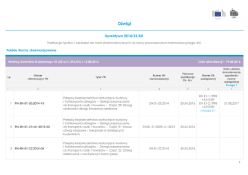 Dźwigi Dyrektywa 2014/33/UE Publikacja tytułów i odniesień do norm zharmonizowanych na mocy prawodawstwa harmonizacyjnego Unii. Polskie Normy zharmonizowane Według Dziennika Urzędowego UE (2016/C 293/05) z 12.08.2016 Lp. 1 1 2 3 Data aktualizacji – 19.08.2016 Numer referencyjny PN Tytuł PN Numer EN wprowadzonej Pierwsza publikacja Dz. Urz. Numer EN zastąpionej Data ustania domniemania zgodności normy zastąpionej Uwaga 1 2 3 4 5 6 7 EN 81-1:1998 +A3:2009 EN 81-2:1998 +A3:2009 Uwaga 2.1 31.08.2017 PN-EN 81-20:2014-10 Przepisy bezpieczeństwa dotyczące budowy i instalowania dźwigów -- Dźwigi przeznaczone do transportu osób i towarów -- Część 20: Dźwigi osobowe i dźwigi towarowo-osobowe EN 81-20:2014 20.04.2016 PN-EN 81-21+A1:2013-02 Przepisy bezpieczeństwa dotyczące budowy i instalowania dźwigów -- Dźwigi przeznaczone do transportu osób i towarów -- Część 21: Nowe dźwigi osobowe i towarowe w istniejących budynkach EN 81-21:2009+A1:2012 20.04.2016 PN-EN 81-22:2014-06 Przepisy bezpieczeństwa dotyczące budowy i instalowania dźwigów -- Dźwigi przeznaczone do transportu osób i towarów -- Część 22: Dźwigi elektryczne z nachylonym torem jazdy EN 81-22:2014 20.04.2016 1 Dźwigi Dyrektywa 2014/33/UE Publikacja tytułów i odniesień do norm zharmonizowanych na mocy prawodawstwa harmonizacyjnego Unii. Polskie Normy zharmonizowane Według Dziennika Urzędowego UE (2016/C 293/05) z 12.08.2016 Lp. 1 Data aktualizacji – 19.08.2016 Numer referencyjny PN Tytuł PN Numer EN wprowadzonej Pierwsza publikacja Dz. Urz. Numer EN zastąpionej Data ustania domniemania zgodności normy zastąpionej Uwaga 1 2 3 4 5 6 7 EN 81-28:2003 20.04.2016 EN 81-1:1998 +A3:2009 EN 81-2:1998 +A3:2009 Uwaga 2.1 31.08.2017 PN-EN 81-28:2004 Przepisy bezpieczeństwa dotyczące budowy i instalowania dźwigów -- Dźwigi osobowe i towarowe -- Część 28: Zdalne alarmowanie w dźwigach osobowych i towarowych PN-EN 81-50:2014-10 Przepisy bezpieczeństwa dotyczące budowy i instalowania dźwigów -- Badania i próby -Część 50: Zasady projektowania, obliczania, badania i próby elementów dźwigowych EN 81-50:2014 20.04.2016 6 PN-EN 81-58:2005 Przepisy bezpieczeństwa dotyczące budowy i instalowania dźwigów -- Badania i próby -Część 58: Próba odporności ogniowej drzwi przystankowych EN 81-58:2003 20.04.2016 7 PN-EN 81-70:2005 EN 81-70:2003 20.04.2016 8 PN-EN 81-70:2005/A1:2006 EN 81-70:2003/A1:2004 20.04.2016 4 5 Przepisy bezpieczeństwa dotyczące budowy i instalowania dźwigów -- Szczególne zastosowania dźwigów osobowych i towarowych -- Część 70: Dostępność dźwigów dla osób, w tym osób niepełnosprawnych Uwaga 3 2 Dźwigi Dyrektywa 2014/33/UE Publikacja tytułów i odniesień do norm zharmonizowanych na mocy prawodawstwa harmonizacyjnego Unii. Polskie Normy zharmonizowane Według Dziennika Urzędowego UE (2016/C 293/05) z 12.08.2016 Lp. 1 9 10 11 12 Data aktualizacji – 19.08.2016 Numer referencyjny PN Tytuł PN Numer EN wprowadzonej Pierwsza publikacja Dz. Urz. Numer EN zastąpionej Data ustania domniemania zgodności normy zastąpionej Uwaga 1 2 3 4 5 6 7 PN-EN 81-71+A1:2007 Przepisy bezpieczeństwa dotyczące budowy i instalowania dźwigów -- Szczególne zastosowania dźwigów osobowych i towarowych –Część 71: Dźwigi odporne na wandalizm EN 81-71:2005+A1:2006 20.04.2016 PN-EN 81-72:2015-06 Przepisy bezpieczeństwa dotyczące budowy i instalowania dźwigów -- Szczególne zastosowania dźwigów osobowych i towarowych -- Część 72: Dźwigi dla straży pożarnej EN 81-72:2015 20.04.2016 EN 81-72:2003 Uwaga 2.1 31.08.2017 PN-EN 81-73:2016 Przepisy bezpieczeństwa dotyczące budowy i instalowania dźwigów -- Szczególne zastosowania dźwigów osobowych i towarowych – Część 73: Funkcjonowanie dźwigów w przypadku pożaru EN 81-73:2005 Pierwsza publikacja EN 81-72:2005 Uwaga 2.1 31.08.2018 PN-EN 81-77:2014-02 Przepisy bezpieczeństwa dotyczące budowy i instalowania dźwigów -- Szczególne zastosowania dźwigów osobowych i towarowych -- Część 77: Dźwigi w warunkach sejsmicznych EN 81-77:2013 20.04.2016 3 Dźwigi Dyrektywa 2014/33/UE Publikacja tytułów i odniesień do norm zharmonizowanych na mocy prawodawstwa harmonizacyjnego Unii. Polskie Normy zharmonizowane Według Dziennika Urzędowego UE (2016/C 293/05) z 12.08.2016 Lp. 1 Data aktualizacji – 19.08.2016 Numer referencyjny PN Tytuł PN Numer EN wprowadzonej Pierwsza publikacja Dz. Urz. Numer EN zastąpionej Data ustania domniemania zgodności normy zastąpionej Uwaga 1 2 3 4 5 6 7 EN 12016:2013 20.04.2016 EN 12385-3:2004+A1:2008 20.04.2016 EN 12385-5:2002 20.04.2016 EN 12385-5:2002/AC:2005 20.04.2016 EN 13015:2001+A1:2008 20.04.2016 13 PN-EN 12016:2013-12 Kompatybilność elektromagnetyczna -Standardowa rodzina produktów stosowanych w dźwigach, schodach i chodnikach ruchomych -Odporność 14 PN-EN 12385-3+A1:2008 Liny stalowe -- Bezpieczeństwo -- Część 3: Informacje dotyczące stosowania i konserwacji 15 PN-EN 12385-5:2004 Liny stalowe -- Bezpieczeństwo -- Część 5: Liny splotkowe dla dźwigów 16 PN-EN 12385-5:2004/AC:2006 17 PN-EN 13015+A1:2008 Konserwacja dźwigów i schodów ruchomych -Zasady opracowywania instrukcji konserwacji 4 Dźwigi Dyrektywa 2014/33/UE Publikacja tytułów i odniesień do norm zharmonizowanych na mocy prawodawstwa harmonizacyjnego Unii. Polskie Normy zharmonizowane Według Dziennika Urzędowego UE (2016/C 293/05) z 12.08.2016 Lp. 1 18 Numer referencyjny PN Tytuł PN Numer EN wprowadzonej Pierwsza publikacja Dz. Urz. Numer EN zastąpionej Data ustania domniemania zgodności normy zastąpionej Uwaga 1 2 3 4 5 6 7 EN 13411-7:2006+A1:2008 20.04.2016 PN-EN 13411-7+A1:2009 Uwaga 1: Data aktualizacji – 19.08.2016 Zakończenia lin stalowych -- Bezpieczeństwo -Część 7: Zacisk sercówkowy symetryczny Data ustania domniemania zgodności jest zasadniczo datą wycofania „dow” określoną przez europejskie organizacje normalizacyjne. Zwraca się jednak uwa