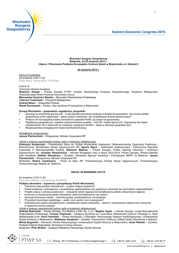 1 Wschodni Kongres Gospodarczy Białystok, 24-25 września 2015 r. (Opera i Filharmonia Podlaska Europejskie Centrum Sztuki w Białymstoku ul. Odeska1) 24 września 2015 r. SESJA PLENARNA 24 września; 9.00-11.00 Duża scena. Tłumaczenie: PL/EN/RU 9.00-9.15 Uroczyste otwarcie kongresu Wojciech Kuśpik – Prezes Zarządu PTWP, Inicjator Wschodniego Kongresu Gospodarczego, Wydawca Miesięcznika Gospodarczego Nowy Przemysł oraz portalu wnp.pl Mieczysław Kazimierz Baszko – Marszałek Województwa Podlaskiego Tadeusz Truskolaski – Prezydent Białegostoku Andrzej Meyer – Wojewoda Podlaski Witold Karczewski – Prezes, Izba Handlowo-Przemysłowa w Białymstoku Europa Wschodnia – gospodarka, współpraca, przyszłość § Sytuacja za wschodnią granicą UE – w jaki sposób warunkuje działania w dziedzinie gospodarki. Jak można działać gospodarczo mimo ograniczeń – gdzie szukać możliwości i jak modyfikować dotychczasowe plany? § Polityka Unii Europejskiej wobec wschodnich sąsiadów Polski i jej wpływ na gospodarkę § Współpraca gospodarcza i wspólne międzynarodowe projekty – rola UE i krajów spoza Unii. Zagrożenia dla krajów członkowskich UE a skłonność do integracji i wspólnych działań – także w obszarze gospodarczym § Bezpieczeństwo energetyczne krajów wschodniej Europy Wystąpienie inauguracyjne: Janusz Piechociński – Wicepremier, Minister Gospodarki RP Udział w dyskusji zapowiedzieli (wykaz osób w kolejności alfabetycznej): Katarzyna Kacperczyk – Podsekretarz Stanu ds. Polityki Afrykańskiej, Azjatyckiej i Bliskowschodniej, Dyplomacji Publicznej i Ekonomicznej, Ministerstwo Spraw Zagranicznych RP; Ilgvars Kļava – Ambasador Nadzwyczajny i Pełnomocny Republiki Łotewskiej w Rzeczypospolitej Polskiej; Sławomir Majman – Prezes Zarządu, Polska Agencja Informacji i Inwestycji Zagranicznych SA; Jarosław Niewierowicz – Minister Energetyki Litwy w latach 2012-2014, Prezes Zarządu, Polsko-Litewska Izba Handlowa; Natallia Nikandrava – Dyrektor, Narodowa Agencja Inwestycji i Prywatyzacji (NAIP) na Białorusi; Janusz Piechociński – Wicepremier, Minister Gospodarki RP Moderator: Robert Tyszkiewicz – Poseł na Sejm RP, Przewodniczący Komisji Spraw Zagranicznych, Przewodniczący Parlamentarnego Zespołu ds. Białorusi SESJE: 24 WRZEŚNIA 2015 R. 24 września | 9.30-11.00 Sala prób orkiestry | Tłumaczenie: PL/EN/RU Polityka zdrowotna – wyzwania z perspektywy Polski Wschodniej § Tworzenie map potrzeb zdrowotnych – w jakim miejscu jesteśmy? § Pakiet kolejkowy i onkologiczny z perspektywy ogólnopolskiej oraz wybranych placówek we wschodnich województwach § Projekt ustawy o zdrowiu publicznym – znaczenie takich regulacji dla kształtowania polityki zdrowotnej w regionie § Konkursy na świadczenia opieki zdrowotnej. Jakie kontraktowanie nas czeka? § Sytuacja finansowa szpitali – restrukturyzacja, przekształcenia, konsolidacje § Przyszłość lecznictwa szpitalnego – spółki, sieć szpitali, inne rozwiązania? § Ambulatoryjna opieka specjalistyczna i podstawowa opieka zdrowotna – obecne i postulowane miejsce oraz znaczenie w systemie ochrony zdrowia Udział w dyskusji zapowiedzieli (wykaz osób w kolejności alfabetycznej): Andrzej Bujnowski – Prezes Zarządu, Pro-Medica w Ełku Sp. z o.o.; Bogdan Dyjuk – Członek Zarządu, Urząd Marszałkowski Województwa Podlaskiego; Tomasz Filipowski – Zastępca Dyrektora ds. Lecznictwa, Białostockie Centrum Onkologii im. Marii Skłodowskiej-Curie; Karol Kamiński – Klinika Kardiologii z Oddziałem Intensywnego Nadzoru Kardiologicznego, Uniwersytecki Szpital Kliniczny w Białymstoku; Waldemar Kwaterski – Dyrektor, Samodzielny Publiczny Zakład Opieki Zdrowotnej w Sejnach; Marek Rogowski – Kierownik, Klinika Otolaryngologii, Uniwersytecki Szpital Kliniczny w Białymstoku; Jacek Roleder – Dyrektor, Podlaski Oddział Wojewódzki, Narodowy Fundusz Zdrowia Moderator: Piotr Wróbel – Zastępca Redaktora Naczelnego, Rynek Zdrowia 2 24 września | 11.30-13.00 Sala wystawiennicza | Tłumaczenie: PL/EN Nowa perspektywa finansowa UE § Czy Program Operacyjny Rozwój Polski Wschodniej spełnił swe cele? Sukcesy i niedostatki § PO Polska Wschodnia – główne cele na lata 2014-2020. Kwoty, programy i preferowane w nich kierunki inwestowania § Innowacyjność, infrastruktura, energetyka i inne obszary aktywności inwestycyjnej wspieranej ze środków UE § Nowe zasady w programach unijnych, nowe wymagania, nowa sytuacja beneficjenta Udział w dyskusji zapowiedzieli (wykaz osób w kolejności alfabetycznej): Mieczysław Groszek – Wiceprezes, Związek Banków Polskich; Bożena Lublińska-Kasprzak – Prezes, Polska Agencja Rozwoju Przedsiębiorczości; Ewa Mikos – Dyrektor ds. Rozwoju Biznesu, Siemens Sp. z o.o.; Radosław Stępień – Wiceprezes, Pierwszy Zastępca Prezesa Zarządu, Bank Gospodarstwa Krajowego; Iwona Wendel – Podsekretarz Stanu, Ministerstwo Infrastruktury i Rozwoju RP; Maciej Żywno – Wicemarszałek Województwa Podlaskiego Moderator: Jacek Socha – Wiceprezes, Partner, Dział Doradztwa Biznesowego, PwC, Minister Skarbu Państwa w latach 20042005 24 września | 11.30-13.00 Sala prób orkiestry | Tłumaczenie: PL/EN/RU Energetyka. Inwestycje infrastrukturalne i wytwórcze § Inwestycje infrastrukturalne w sektorze energetyczno-paliwowym w Polsce § Połączenia transgraniczne na Wschodzie jako element europejskiej architektury bezpieczeństwa § Stan zaawansowania kluczowych inwestycji i projektów w makroregionie wschodnim. Ich znaczenie dla relacji z sąsiadami § Inwestycje sieciowe we wschodniej Polsce. Finansowanie kolejnych etapów rozbudowy infrastruktury § Najważniejsze inwestycje w moce wytwórcze. Plany i ich realizacja Udział w dyskusji zapowiedzieli (wykaz osób w kolejności alfabetycznej): Grzegorz Dolecki – Wiceprezes Zarządu ds. Operacyjnych, PGE Dystrybucja SA; Włodzimierz Mucha – Dyrektor, Departament Rozwoju Syst
