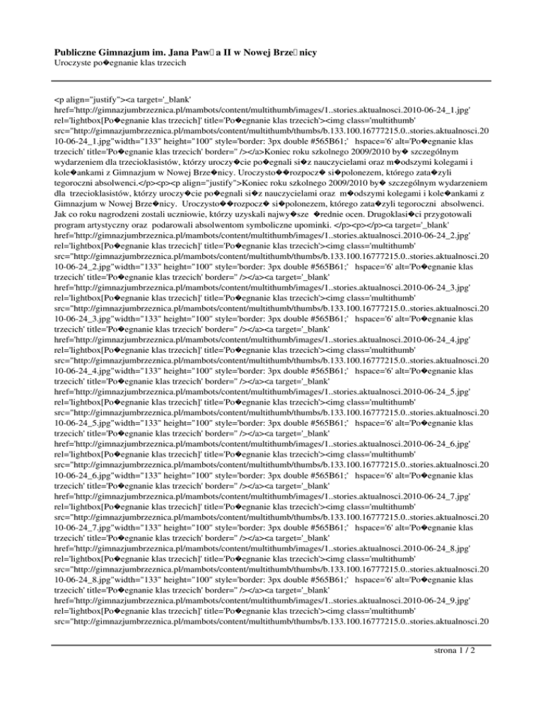 Publiczne Gimnazjum im. Jana Paw�a II w Nowej Brze�nicy Uroczyste po�egnanie klas trzecich <p align="justify"><a target='_blank' href='http://gimnazjumbrzeznica.pl/mambots/content/multithumb/images/1..stories.aktualnosci.2010-06-24_1.jpg' rel='lightbox[Po�egnanie klas trzecich]' title='Po�egnanie klas trzecich'><img class='multithumb' src="http://gimnazjumbrzeznica.pl/mambots/content/multithumb/thumbs/b.133.100.16777215.0..stories.aktualnosci.20 10-06-24_1.jpg"width="133" height="100" style='border: 3px double #565B61;' hspace='6' alt='Po�egnanie klas trzecich' title='Po�egnanie klas trzecich' border='' /></a>Koniec roku szkolnego 2009/2010 by� szczególnym wydarzeniem dla trzecioklasistów, którzy uroczy�cie po�egnali si�z nauczycielami oraz m�odszymi kolegami i kole�ankami z Gimnazjum w Nowej Brze�nicy. Uroczysto��rozpocz� si�polonezem, którego zata�zyli tegoroczni absolwenci.</p><p><p align="justify">Koniec roku szkolnego 2009/2010 by� szczególnym wydarzeniem dla trzecioklasistów, którzy uroczy�cie po�egnali si�z nauczycielami oraz m�odszymi kolegami i kole�ankami z Gimnazjum w Nowej Brze�nicy. Uroczysto��rozpocz� si�polonezem, którego zata�zyli tegoroczni absolwenci. Jak co roku nagrodzeni zostali uczniowie, którzy uzyskali najwy�sze �rednie ocen. Drugoklasi�ci przygotowali program artystyczny oraz podarowali absolwentom symboliczne upominki. </p><p></p><a target='_blank' href='http://gimnazjumbrzeznica.pl/mambots/content/multithumb/images/1..stories.aktualnosci.2010-06-24_2.jpg' rel='lightbox[Po�egnanie klas trzecich]' title='Po�egnanie klas trzecich'><img class='multithumb' src="http://gimnazjumbrzeznica.pl/mambots/content/multithumb/thumbs/b.133.100.16777215.0..stories.aktualnosci.20 10-06-24_2.jpg"width="133" height="100" style='border: 3px double #565B61;' hspace='6' alt='Po�egnanie klas trzecich' title='Po�egnanie klas trzecich' border='' /></a><a target='_blank' href='http://gimnazjumbrzeznica.pl/mambots/content/multithumb/images/1..stories.aktualnosci.2010-06-24_3.jpg' rel='lightbox[Po�egnanie klas trzecich]' title='Po�egnanie klas trzecich'><img class='multithumb' src="http://gimnazjumbrzeznica.pl/mambots/content/multithumb/thumbs/b.133.100.16777215.0..stories.aktualnosci.20 10-06-24_3.jpg"width="133" height="100" style='border: 3px double #565B61;' hspace='6' alt='Po�egnanie klas trzecich' title='Po�egnanie klas trzecich' border='' /></a><a target='_blank' href='http://gimnazjumbrzeznica.pl/mambots/content/multithumb/images/1..stories.aktualnosci.2010-06-24_4.jpg' rel='lightbox[Po�egnanie klas trzecich]' title='Po�egnanie klas trzecich'><img class='multithumb' src="http://gimnazjumbrzeznica.pl/mambots/content/multithumb/thumbs/b.133.100.16777215.0..stories.aktualnosci.20 10-06-24_4.jpg"width="133" height="100" style='border: 3px double #565B61;' hspace='6' alt='Po�egnanie klas trzecich' title='Po�egnanie klas trzecich' border='' /></a><a target='_blank' href='http://gimnazjumbrzeznica.pl/mambots/content/multithumb/images/1..stories.aktualnosci.2010-06-24_5.jpg' rel='lightbox[Po�egnanie klas trzecich]' title='Po�egnanie klas trzecich'><img class='multithumb' src="http://gimnazjumbrzeznica.pl/mambots/content/multithumb/thumbs/b.133.100.16777215.0..stories.aktualnosci.20 10-06-24_5.jpg"width="133" height="100" style='border: 3px double #565B61;' hspace='6' alt='Po�egnanie klas trzecich' title='Po�egnanie klas trzecich' border='' /></a><a target='_blank' href='http://gimnazjumbrzeznica.pl/mambots/content/multithumb/images/1..stories.aktualnosci.2010-06-24_6.jpg' rel='lightbox[Po�egnanie klas trzecich]' title='Po�egnanie klas trzecich'><img class='multithumb' src="http://gimnazjumbrzeznica.pl/mambots/content/multithumb/thumbs/b.133.100.16777215.0..stories.aktualnosci.20 10-06-24_6.jpg"width="133" height="100" style='border: 3px double #565B61;' hspace='6' alt='Po�egnanie klas trzecich' title='Po�egnanie klas trzecich' border='' /></a><a target='_blank' href='http://gimnazjumbrzeznica.pl/mambots/content/multithumb/images/1..stories.aktualnosci.2010-06-24_7.jpg' rel='lightbox[Po�egnanie klas trzecich]' title='Po�egnanie klas trzecich'><img class='multithumb' src="http://gimnazjumbrzeznica.pl/mambots/content/multithumb/thumbs/b.133.100.16777215.0..stories.aktualnosci.20 10-06-24_7.jpg"width="133" height="100" style='border: 3px double #565B61;' hspace='6' alt='Po�egnanie klas trzecich' title='Po�egnanie klas trzecich' border='' /></a><a target='_blank' href='http://gimnazjumbrzeznica.pl/mambots/content/multithumb/images/1..stories.aktualnosci.2010-06-24_8.jpg' rel='lightbox[Po�egnanie klas trzecich]' title='Po�egnanie klas trzecich'><img class='multithumb' src="http://gimnazjumbrzeznica.pl/mambots/content/multithumb/thumbs/b.133.100.16777215.0..stories.aktualnosci.20 10-06-24_8.jpg"width="133" height="100" style='border: 3px double #565B61;' hspace='6' alt='Po�egnanie klas trzecich' title='Po�egnanie klas trzecich' border='' /></a><a target='_blank' href='http://gimnazjumbrzeznica.pl/mambots/content/multithumb/images/1..stories.aktualnosci.2010-06-24_9.jpg' rel='lightbox[Po�egnanie klas trzecich]' title='Po�egnanie klas trzecich'><img class='multithumb' src="http://gimnazjumbrzeznica.pl/mambots/content/multithumb/thumbs/b.133.100.16777215.0..stories.aktualnosci.20 strona 1 / 2 Publiczne Gimnazjum im. Jana Paw�a II w Nowej Brze�nicy Uroczyste po�egnanie klas trzecich 10-06-24_9.jpg"width="133" height="100" style='border: 3px double #565B61;' hspace='6' alt='Po�egnanie klas trzecich' title='Po�egnanie klas trzecich' border='' /></a><p align="center">fot. Monika Su�kowska </p> strona 2 / 2