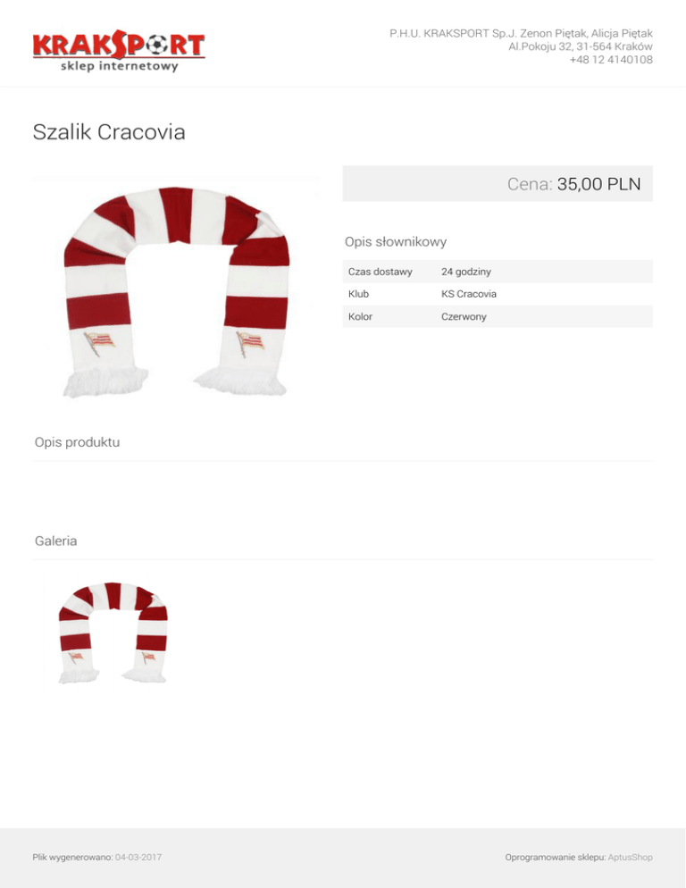 P.H.U. KRAKSPORT Sp.J. Zenon Piętak, Alicja Piętak Al.Pokoju 32, 31-564 Kraków +48 12 4140108 Szalik Cracovia Cena: 35,00 PLN Opis słownikowy Czas dostawy 24 godziny Klub KS Cracovia Kolor Czerwony Opis produktu Galeria Plik wygenerowano: 04-03-2017 Powered by TCPDF (www.tcpdf.org) Oprogramowanie sklepu: AptusShop