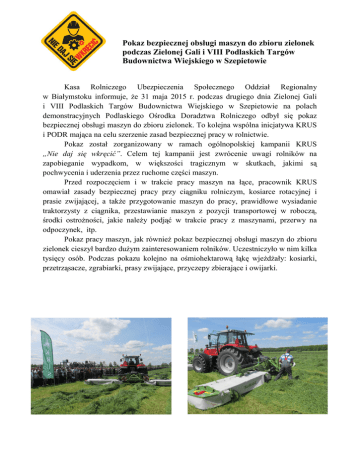 Pokaz bezpiecznej obsługi maszyn do zbioru zielonek podczas Zielonej Gali i VIII Podlaskich Targów Budownictwa Wiejskiego w Szepietowie Kasa Rolniczego Ubezpieczenia Społecznego Oddział Regionalny w Białymstoku informuje, że 31 maja 2015 r. podczas drugiego dnia Zielonej Gali i VIII Podlaskich Targów Budownictwa Wiejskiego w Szepietowie na polach demonstracyjnych Podlaskiego Ośrodka Doradztwa Rolniczego odbył się pokaz bezpiecznej obsługi maszyn do zbioru zielonek. To kolejna wspólna inicjatywa KRUS i PODR mająca na celu szerzenie zasad bezpiecznej pracy w rolnictwie. Pokaz został zorganizowany w ramach ogólnopolskiej kampanii KRUS „Nie daj się wkręcić”. Celem tej kampanii jest zwrócenie uwagi rolników na zapobieganie wypadkom, w większości tragicznym w skutkach, jakimi są pochwycenia i uderzenia przez ruchome części maszyn. Przed rozpoczęciem i w trakcie pracy maszyn na łące, pracownik KRUS omawiał zasady bezpiecznej pracy przy ciągniku rolniczym, kosiarce rotacyjnej i prasie zwijającej, a także przygotowanie maszyn do pracy, prawidłowe wysiadanie traktorzysty z ciągnika, przestawianie maszyn z pozycji transportowej w roboczą, środki ostrożności, jakie należy podjąć w trakcie pracy z maszynami, przerwy na odpoczynek, itp. Pokaz pracy maszyn, jak również pokaz bezpiecznej obsługi maszyn do zbioru zielonek cieszył bardzo dużym zainteresowaniem rolników. Uczestniczyło w nim kilka tysięcy osób. Podczas pokazu kolejno na ośmiohektarową łąkę wjeżdżały: kosiarki, przetrząsacze, zgrabiarki, prasy zwijające, przyczepy zbierające i owijarki. Pokaz bezpiecznej obsługi maszyn do zbioru zielonek – Szepietowo 31.05.2015 r. Krzysztof Kozioł OR KRUS w Białymstoku