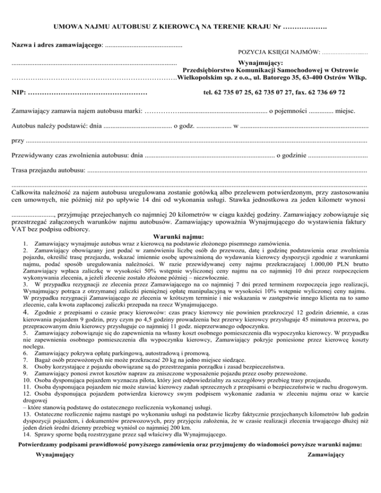 UMOWA NAJMU AUTOBUSU Z KIEROWCĄ NA TERENIE KRAJU Nr ………………. Nazwa i adres zamawiającego: ............................................ POZYCJA KSIĘGI NAJMÓW: …………….……...… .............................................................................................. Wynajmujący: Przedsiębiorstwo Komunikacji Samochodowej w Ostrowie ………….………………………………………………….Wielkopolskim sp. z o.o., ul. Batorego 35, 63-400 Ostrów Wlkp. NIP: …………………………………………… tel. 62 735 07 25, 62 735 07 27, fax. 62 736 69 72 Zamawiający zamawia najem autobusu marki: …………….................................................. o pojemności .............. miejsc. Autobus należy podstawić: dnia ....................................... o godz. .................... w ......................................................................... przy .................................................................................................................................................................................................. Przewidywany czas zwolnienia autobusu: dnia .......................................................................... o godzinie .................................. Trasa przejazdu autobusu: ............................................................................................................................................................... .......................................................................................................................................................................................................... Całkowita należność za najem autobusu uregulowana zostanie gotówką albo przelewem potwierdzonym, przy zastosowaniu cen umownych, nie później niż po upływie 14 dni od wykonania usługi. Stawka jednostkowa za jeden kilometr wynosi ........................, przyjmując przejechanych co najmniej 20 kilometrów w ciągu każdej godziny. Zamawiający zobowiązuje się przestrzegać załączonych warunków najmu autobusów. Zamawiający upoważnia Wynajmującego do wystawienia faktury VAT bez podpisu odbiorcy. Warunki najmu: 1. Zamawiający wynajmuje autobus wraz z kierowcą na podstawie złożonego pisemnego zamówienia. 2. Zamawiający obowiązany jest podać w zamówieniu liczbę osób do przewozu, datę i godzinę podstawienia oraz zwolnienia pojazdu, określić trasę przejazdu, wskazać imiennie osobę upoważnioną do wydawania kierowcy dyspozycji zgodnie z warunkami najmu, podać sposób uregulowania należności. W razie przewidywanej ceny najmu przekraczającej 1.000,00 PLN brutto Zamawiający wpłaca zaliczkę w wysokości 50% wstępnie wyliczonej ceny najmu na co najmniej 10 dni przez rozpoczęciem wykonywania zlecenia, a jeżeli zlecenie zostało złożone później – niezwłocznie. 3. W przypadku rezygnacji ze zlecenia przez Zamawiającego na co najmniej 7 dni przed terminem rozpoczęcia jego realizacji, Wynajmujący potrąca z otrzymanej zaliczki pieniężnej opłatę manipulacyjną w wysokości 10% wstępnie wyliczonej ceny najmu. W przypadku rezygnacji Zamawiającego ze zlecenia w krótszym terminie i nie wskazania w zastępstwie innego klienta na to samo zlecenie, cała kwota zapłaconej zaliczki przepada na rzecz Wynajmującego. 4. Zgodnie z przepisami o czasie pracy kierowców: czas pracy kierowcy nie powinien przekroczyć 12 godzin dziennie, a czas kierowania pojazdem 9 godzin, przy czym po 4,5 godziny prowadzenia bez przerwy kierowcy przysługuje 45 minutowa przerwa, po przepracowanym dniu kierowcy przysługuje co najmniej 11 godz. nieprzerwanego odpoczynku. 5. Zamawiający zobowiązuje się do zapewnienia na własny koszt osobnego pomieszczenia dla wypoczynku kierowcy. W przypadku nie zapewnienia osobnego pomieszczenia dla wypoczynku kierowcy, Zamawiający pokryje poniesione przez kierowcę koszty noclegu. 6. Zamawiający pokrywa opłatę parkingową, autostradową i promową. 7. Bagaż osób przewożonych nie może przekraczać 20 kg na jedno miejsce siedzące. 8. Osoby korzystające z pojazdu obowiązane są do przestrzegania porządku i zasad bezpieczeństwa. 9. Zamawiający ponosi zwrot kosztów napraw za zniszczone wyposażenie pojazdu przez osoby przewożone. 10. Osoba dysponująca pojazdem wyznacza pilota, który jest odpowiedzialny za szczegółowy przebieg trasy przejazdu. 11. Osoba dysponująca pojazdem nie może stawiać kierowcy zadań sprzecznych z przepisami o bezpieczeństwie w ruchu drogowym. 12. Osoba dysponująca pojazdem potwierdza kierowcy swym podpisem wykonanie zadania w zleceniu najmu oraz w karcie drogowej – które stanowią podstawę do ostatecznego rozliczenia wykonanej usługi. 13. Ostateczne rozliczenie najmu nastąpi po wykonaniu usługi na podstawie liczby faktycznie przejechanych kilometrów lub godzin dyspozycji pojazdem, i dokumentów przewozowych, przy przyjęciu założenia, że w czasie realizacji zlecenia trwającego dłużej niż jeden dzień średni dzienny przebieg wyniósł co najmniej 200 km. 14. Sprawy sporne będą rozstrzygane przez sąd właściwy dla Wynajmującego. Potwierdzamy podpisami prawidłowość powyższego zamówienia oraz przyjmujemy do wiadomości powyższe warunki najmu: Wynajmujący Zamawiający