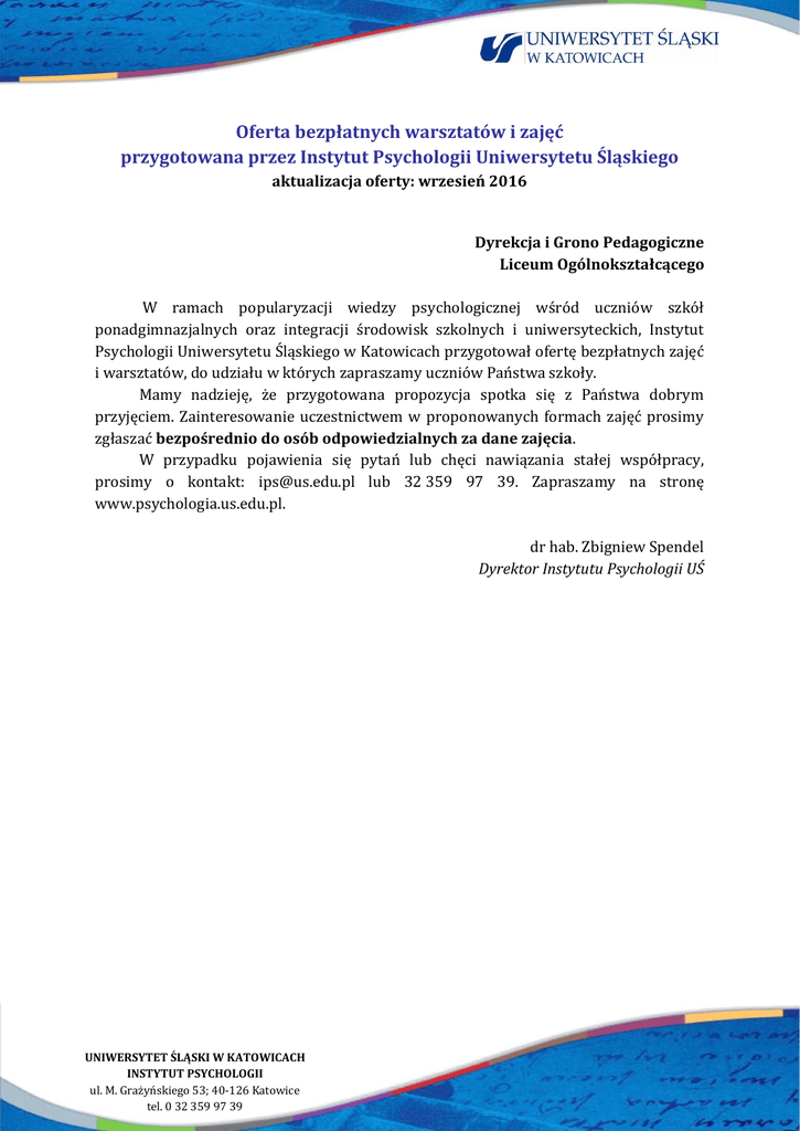 Oferta bezpłatnych warsztatów i zajęć przygotowana przez Instytut Psychologii Uniwersytetu Śląskiego aktualizacja oferty: wrzesień 2016 Dyrekcja i Grono Pedagogiczne Liceum Ogólnokształcącego W ramach popularyzacji wiedzy psychologicznej wśród uczniów szkół ponadgimnazjalnych oraz integracji środowisk szkolnych i uniwersyteckich, Instytut Psychologii Uniwersytetu Śląskiego w Katowicach przygotował ofertę bezpłatnych zajęć i warsztatów, do udziału w których zapraszamy uczniów Państwa szkoły. Mamy nadzieję, że przygotowana propozycja spotka się z Państwa dobrym przyjęciem. Zainteresowanie uczestnictwem w proponowanych formach zajęć prosimy zgłaszać bezpośrednio do osób odpowiedzialnych za dane zajęcia. W przypadku pojawienia się pytań lub chęci nawiązania stałej współpracy, prosimy o kontakt: [email protected] lub 32 359 97 39. Zapraszamy na stronę www.psychologia.us.edu.pl. dr hab. Zbigniew Spendel Dyrektor Instytutu Psychologii UŚ UNIWERSYTET ŚLĄSKI W KATOWICACH INSTYTUT PSYCHOLOGII ul. M. Grażyńskiego 53; 40-126 Katowice tel. 0 32 359 97 39 GOŚCINNA WIZYTA PODCZAS REGULARNYCH ZAJĘĆ AKADEMICKICH Ćwiczenia z różnych dyscyplin psychologicznych dotyczą zarówno wiedzy teoretycznej, jak i umiejętności praktycznych. Istnieje możliwość udziału w zajęciach małych grup szczególnie zainteresowanych uczniów. W celu uzyskania informacji, prosimy o kontakt z koordynatorem Zespołu ds. Współpracy z Otoczeniem: [email protected] UNIWERSYTET ŚLĄSKI W KATOWICACH INSTYTUT PSYCHOLOGII ul. M. Grażyńskiego 53; 40-126 Katowice tel. 0 32 359 97 39 WARSZTATY I ZAJĘCIA DLA UCZNIÓW PROWADZONE PRZEZ WYKŁADOWCÓW Poniżej prezentujemy ofertę autorskich warsztatów, stworzonych przez naszych pracowników naukowych specjalnie z myślą o uczniach szkół ponadgimnazjalnych. Warsztaty są bezpłatne. Jeśli Państwa uczniowie są zainteresowani udziałem w danym warsztacie, prosimy kontaktować się bezpośrednio z prowadzącym. Zajęcia prowadzone są na terenie Wydziału Pedagogiki i Psychologii Uniwersytetu Śląskiego i ich organizacja uzależniona jest od dostępności sal i czasu wolnego prowadzącego. Prosimy o kontakt z prowadzącym dany warsztat. Najciekawsze przypadki w psychologii, czyli po co w ogóle studiować ten kierunek? Prowadzący: mgr Lidia Baran Czas trwania: 90 minut Ilość uczestników: ok. 25-30 osób Krótki opis: Spektakularne przypadki z historii psychologii wykorzystane zostaną do zobrazowania podstaw tej dziedziny nauki, sensu pracy psychologa oraz czyhających na niego pułapek. Uczestnicy poznają podstawowe zasady psychologicznego funkcjonowania człowieka i będą mieli szansę samodzielnie je przetestować. Kontakt: [email protected] Tacy sami a jednak inni. O przyczynach różnic między ludźmi Prowadzący: dr Agnieszka Skorupa Czas trwania: 45 minut lub 90 minut Ilość uczestników: ok. 25 osób Krótki opis: Aktywny warsztat pozwoli uczniom uzyskać odpowiedzi na takie pytania jak: Dlaczego ludzie różnią się między sobą? Co jest tego przyczyną? Czy wszystko jest zapisane w genach? Skąd się bierze moja inteligencja, osobowość, temperament, wrażliwość na stres? Mowa będzie także o tym jak przez lata różnice indywidualne były wykorzystywane do dyskryminowania różnych grup ludzi oraz jak jest obecnie. Kontakt: [email protected] UNIWERSYTET ŚLĄSKI W KATOWICACH INSTYTUT PSYCHOLOGII ul. M. Grażyńskiego 53; 40-126 Katowice tel. 0 32 359 97 39 Psychologia na krańcach świata Prowadzący: dr Agnieszka Skorupa Czas trwania: 45 minut lub 90 minut Ilość uczestników: ok. 25 osób Krótki opis: W Polsce zróżnicowanie kulturowe społeczeństwa jest dość niewielkie, na całym świecie mamy jednak do czynienia z ogromną różnorodnością między ludźmi: od rasowej, po plemienną. Dlaczego kobiety z plemion Nowej Gwinei wybierają wyższych partnerów? Dlaczego Japończycy inaczej zaczynają pisanie wypracowań? Dlaczego niektóre plemiona z dżungli nie ulegają złudzeniom optycznym? Podczas warsztatu będziemy odkrywać w jaki sposób różni ludzie myślą i odczuwają, jak mocno kultura wpływa na naszą psychikę. Kontakt: [email protected] Uzależnienie od Internetu – prawda czy mit? Prowadzący: dr Łukasz Jach Czas trwania: 45 minut Ilość uczestników: ok. 20 osób Krótki opis: Zajęcia, podczas których uczniowie zapoznają się z ryzykiem powstawania uzależnień od czynności związanych z użytkowaniem komputera i Internetu (np. obecność na portalach społecznościowych, zakupy internetowe, gry on-line). Uczestnikom przedstawiana jest ponadto wiedza na temat zachowań pozwalających korzystać ze współczesnych zdobyczy techniki w sposób umożliwiający uniknięcie pojawienia się symptomów uzależnienia. Kontakt: [email protected] Szczęście – jak je rozumiemy? jak je osiągamy? Prowadzący: dr Łukasz Jach Czas trwania: 45 minut lub 90 minut Ilość uczestników: ok. 25 osób Krótki opis: Zajęcia za pomocą przykładów zaczerpniętych z życia codziennego prezentują wybrane psychologiczne teorie opisujące ludzkie dążenie do szczęścia. Uczestnicy będą mieli okazję ustosunkować się do pragnień występujących powszechnie w dzisiejszym świecie (np. materialnych, wizerunkowych) oraz zapoznać z koncepcjami wskazującymi sposoby aktywności zwiększające poziom życiowej satysfakcji. Kontakt: [email protected] Pieniądze, zakupy, wydatki Prowadzący: dr Łukasz Jach Czas trwania: 45 minut Ilość uczestników: ok. 25 osób Krótki opis: Zajęcia prezentują współczesne ustalenia psychologiczne dotyczące takich czynności, jak oszczędzanie czy dokonywanie zakupów. Ich uczestnicy będą mieli okazję zapoznać się ze zjawiskami towarzyszącymi wizytom w supermarkecie i podejmowaniu decyzji o zakupie konkretnych produktów. Odwołania do konkretnych, życiowych przykładów pozwolą uczniom dostrzec praktyczne zastosowania wiedzy psycholo
