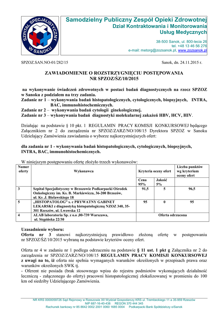 Samodzielny Publiczny Zespół Opieki Zdrowotnej Dział Kontraktowania i Monitorowania Usług Medycznych 38-500 Sanok, ul. 800-lecia 26 tel. +48 13 46 56 276 e-mail: [email protected], www.zozsanok.pl SPZOZ.SAN.NO-01/282/15 Sanok, dn. 24.11.2015 r. ZAWIADOMIENIE O ROZSTRZYGNIĘCIU POSTĘPOWANIA NR SPZOZ/ŚZ/10/2015 na wykonywanie świadczeń zdrowotnych w postaci badań diagnostycznych na rzecz SPZOZ w Sanoku z podziałem na trzy zadania. Zadanie nr 1 – wykonywania badań histopatologicznych, cytologicznych, biopsyjnych, INTRA, BAC, immunohistochemicznych. Zadanie nr 2 – wykonywania badań cytologii ginekologicznej. Zadanie nr 3 – wykonywania badań diagnostyki molekularnej zakażeń HBV, HCV, HIV. Działając na podstawie § 10 pkt. 1 REGULAMIN PRACY KOMISJI KONKURSOWEJ będącego Załącznikiem nr 2 do zarządzenia nr SPZOZ/ZARZ/NO/108/15 Dyrektora SPZOZ w Sanoku Udzielający Zamówienia zawiadamia o wyborze najkorzystniejszych ofert: dla zadania nr 1 - wykonywania badań histopatologicznych, cytologicznych, biopsyjnych, INTRA, BAC, immunohistochemicznych. W niniejszym postępowaniu ofertę złożyło trzech wykonawców: Numer oferty 3 5 4 Wykonawca Szpital Specjalistyczny w Brzozowie Podkarpacki Ośrodek Onkologiczny im. Ks. B. Markiewicza, 36-200 Brzozów, ul. Ks .J. Bielawskiego 18 „HISTOPATOLOG” s. c PRYWATNY GABINET LEKARSKI z diagnostyką histopatologiczną NZOZ 340, 35301 Rzeszów, ul. Lwowska 12 ALAB laboratoria Sp. z o.o ,00-739 Warszawa, ul. Stępińska 22/30 Kryteria oceny ofert Cena 95% 91,5 95 Uzasadnienie wyboru: Oferta nr 3 stanowi najkorzystniejszą prawidłowo złożoną nr SPZOZ/ŚZ/10/2015 wybraną na podstawie kryteriów oceny ofert. Liczba punktów wg kryterium oceny ofert Jakość 5% 5 96,5 0 95 Oferta odrzucona ofertę w postępowaniu Oferta nr 4 w zadaniu nr 1 podlega odrzuceniu na podstawie § 11 ust. 1 pkt g Załącznika nr 2 do zarządzenia nr SPZOZ/ZARZ/NO/108/15 REGULAMIN PRACY KOMISJI KONKURSOWEJ z uwagi na to, iż oferta nie spełnia wymaganych warunków określonych w przepisach prawa oraz warunków określonych SWK tj. - Oferent nie posiada (brak stosownego wpisu do rejestru podmiotów wykonujących działalność leczniczą - załączonego do oferty) pracowni histopatologicznej zlokalizowanej w promieniu do 100 km od siedziby Udzielającego Zamówienia. NR KRS 0000059726 Sąd Rejonowy w Rzeszowie XII Wydział Gospodarczy KRS ul. Trembeckiego 11 a 35-959 Rzeszów NIP 687-16-40-438 REGON 370 444 345 Rachunek bankowy nr 85 8642 0002 2001 0060 1685 0004 Podkarpacki Bank Spółdzielczy o/Sanok Warunek taki został określony w SWK w części IV w ust. 3 pkt 1 IV. Przedmiot konkursu nr SPZOZ/ŚZ/10/2015 3. Miejsce wykonywania zleconych badań: 1. Badania będą wykonywane w pomieszczeniach Wykonawcy, które muszą spełniać wymagania zawarte w obowiązujących przepisach prawa. Uwaga: badania histopatologiczne zad. Nr 1, określone w formularzu cenowym wykonywane będą wyłącznie na terenie woj. podkarpackiego w pracowni oferenta zlokalizowanej w promieniu do 100 km od siedziby Udzielającego Zamówienia. USTAWA z dnia 15 kwietnia 2011 r. o działalności leczniczej Art. 26 ust. 2 Przedmiot zamówienia nie może wykraczać poza rodzaj działalności leczniczej lub zakres świadczeń zdrowotnych wykonywanych przez przyjmującego zamówienie, zgodnie z wpisem do rejestru podmiotów wykonujących działalność leczniczą, o którym mowa w art. 100. ponadto: Oferta nr 4 w zadaniu nr 1 podlega odrzuceniu na podstawie § 11 ust. 1 pkt c, g, Załącznika nr 2 do zarządzenia nr SPZOZ/ZARZ/NO/108/15 REGULAMIN PRACY KOMISJI KONKURSOWEJ z uwagi na to, iż oferta nie spełnia wymaganych warunków określonych w przepisach prawa oraz warunków określonych SWK oraz nie podaje w sposób przyjęty w SWK ceny tj. - Oferent nie podał proponowanej ceny świadczeń opieki zdrowotnej w formularzu ofertowym, który powinien być wypełniony zgodnie z formularzem cenowym. Warunek taki został określony w SWK w części V w ust. 2 Formularz ofertowy zawiera następujące ceny : Liczbowo Netto – 318130,00 PLN Brutto – 318130,00 PLN Słownie Słownie netto – trzydzieści jeden tysięcy osiemset trzydzieści złotych Słownie brutto – trzydzieści jeden tysięcy osiemset trzydzieści złotych Formularz cenowy zawiera natomiast cenę : 316690,00 PLN V. Opis Sposobu przygotowania oferty 1. Zleceniodawca wymaga przygotowania i złożenia kompletnej oferty zgodnej z wymaganiami określonymi w niniejszych warunkach postępowania oraz w Regulaminie Pracy Komisji Konkursowej pod rygorem odrzucenia oferty. 2. Ofertę należy sporządzić w formie pisemnej na formularzu wg wzoru zgodnie z załącznikiem nr 1 do Szczegółowych Warunków Konkursu. Załącznik nr 1 do Szczegółowych Warunków Konkursu Ofert – FORMULARZ OFERTOWY szczegółowo określał sposób sporządzenia oferty cenowej tj. Oferuję wykonanie usług objętych zamówieniem, zgodnie z wymogami zawartymi w Szczegółowych Warunkach Konkursu Ofert za cenę : NETTO - .............................. PLN , BRUTTO- ............................. PLN, STAWKA VAT......% Słownie – wartość netto ....................................................................................................... Słownie – wartość brutto.............................................................................................. zgodnie z wypełnionym „Formularzem cenowym” – załącznik nr 2 SWKO dla zadania nr 3– wykonywania badań diagnostyki molekularnej zakażeń HBV, HCV, HIV. W niniejszym postępowaniu ofertę złożyło trzech wykonawców: Nr oferty 1 Wykonawca SYNEVO Sp. z o.o. 04-137 Warszawa, ul. Gdecka 3b Kryteria oceny ofert Cena 95% 95 Jakość 5% 5 Liczba punktów wg kryterium oceny ofert 100 NR KRS 0000059726 Sąd Rejonowy w Rzeszowie XII Wydział Gospodarczy KRS ul. Trembeckiego 11 a 35-959 Rzeszów NIP 687-16-40-438 REGON 370 444 345 Rachunek bankowy nr 85 8642 0002 2001 0060 1685 0004 Podkar