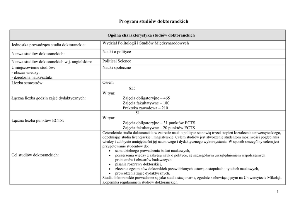 Program studiów doktoranckich - Wydział Politologii i Studiów