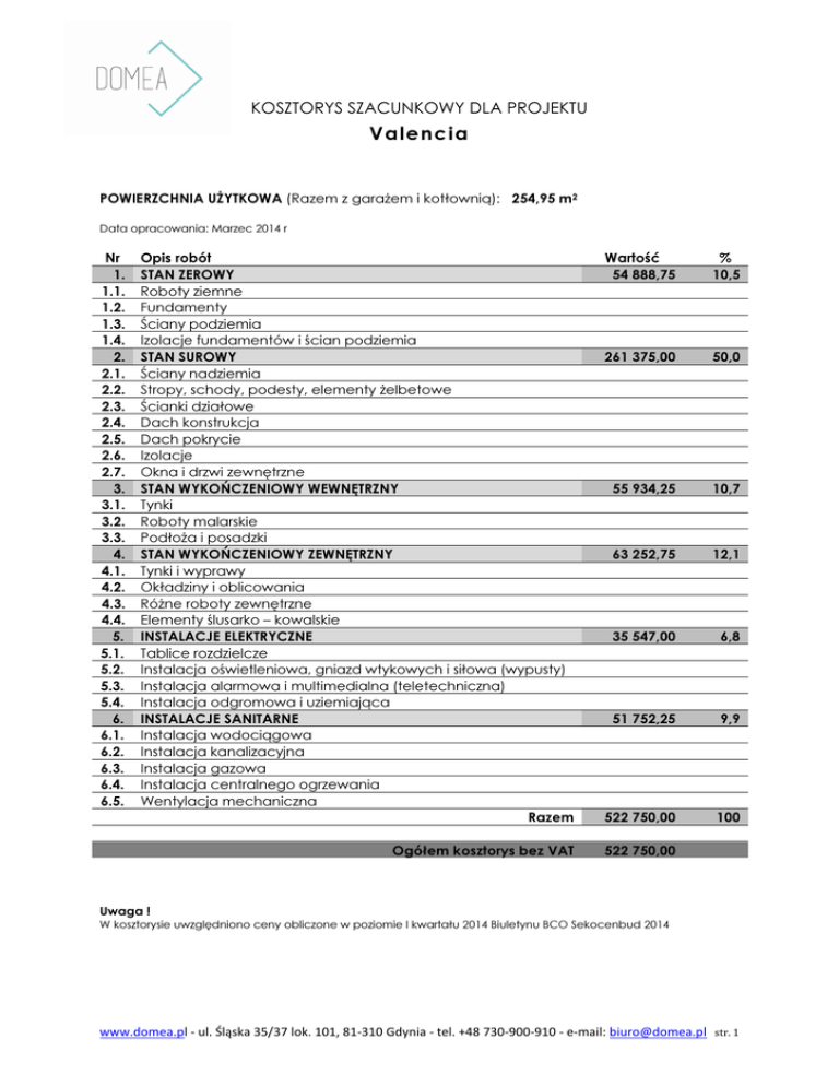 KOSZTORYS SZACUNKOWY DLA PROJEKTU Valencia POWIERZCHNIA UŻYTKOWA (Razem z garażem i kotłownią): 254,95 m2 Data opracowania: Marzec 2014 r Nr 1. 1.1. 1.2. 1.3. 1.4. 2. 2.1. 2.2. 2.3. 2.4. 2.5. 2.6. 2.7. 3. 3.1. 3.2. 3.3. 4. 4.1. 4.2. 4.3. 4.4. 5. 5.1. 5.2. 5.3. 5.4. 6. 6.1. 6.2. 6.3. 6.4. 6.5. Opis robót STAN ZEROWY Roboty ziemne Fundamenty Ściany podziemia Izolacje fundamentów i ścian podziemia STAN SUROWY Ściany nadziemia Stropy, schody, podesty, elementy żelbetowe Ścianki działowe Dach konstrukcja Dach pokrycie Izolacje Okna i drzwi zewnętrzne STAN WYKOŃCZENIOWY WEWNĘTRZNY Tynki Roboty malarskie Podłoża i posadzki STAN WYKOŃCZENIOWY ZEWNĘTRZNY Tynki i wyprawy Okładziny i oblicowania Różne roboty zewnętrzne Elementy ślusarko – kowalskie INSTALACJE ELEKTRYCZNE Tablice rozdzielcze Instalacja oświetleniowa, gniazd wtykowych i siłowa (wypusty) Instalacja alarmowa i multimedialna (teletechniczna) Instalacja odgromowa i uziemiająca INSTALACJE SANITARNE Instalacja wodociągowa Instalacja kanalizacyjna Instalacja gazowa Instalacja centralnego ogrzewania Wentylacja mechaniczna Razem Ogółem kosztorys bez VAT Wartość 54 888,75 % 10,5 261 375,00 50,0 55 934,25 10,7 63 252,75 12,1 35 547,00 6,8 51 752,25 9,9 522 750,00 100 522 750,00 Uwaga ! W kosztorysie uwzględniono ceny obliczone w poziomie I kwartału 2014 Biuletynu BCO Sekocenbud 2014 www.domea.pl - ul. Śląska 35/37 lok. 101, 81-310 Gdynia - tel. +48 730-900-910 - e-mail: [email protected] str. 1 KOSZTORYS SZACUNKOWY DLA PROJEKTU Valencia OPIS TECHNOLOGII ZASTOSOWANYCH DO OBLICZEŃ FUNDAMENTY: ławy betonowe, zbrojone, monolityczne ŚCIANY FUNDAMENTOWE: murowane z bloczków betonowych, izolacja termiczna ze styropianu ekstrudowanego, ŚCIANY NADZIEMIA: zewnętrzne ściany warstwowe z bloczków z betonu komórkowego o gr. 24cm, izolacja termiczna ze styropianu, wewnętrzne ściany konstrukcyjne z bloczków z betonu komórkowego o gr.24cm, ŚCIANY DZIAŁOWE: z bloczków z betonu komórkowego o gr.12cm, PODCIĄGI I SŁUPY: żelbetowe monolityczne, STROPY I SCHODY: strop i schody żelbetowe, DACH: drewniany kryty dachówką ceramiczną, ocieplony wełną mineralną, TYNKI I WYPRAWY WEWNĘTRZNE: tynki zwykłe cementowo – wapienne kat. III, POSADZKI: betonowe OKNA I DRZWI ZEWNĘTRZNE: okna PCV, ELEWACJE: tynk cienkowarstwowy, okładziny z płyt piaskowca, INSTALACJE ELEKTRYCZNE: instalacje oświetlenia (wewnętrzna i zewnętrzna) oraz siłowa wykonane jako wtynkowe, instalacja odgromowa, alarmowa. Bez przyłączy. INSTALACJE SANITARNE: wodociągowa i kanalizacyjna z rur PE, PEX z armaturą, przyborami i urządzeniami, c.o. z kotła gazowego, ogrzewanie podłogowe, instalacja gazowa z rur stalowych. Bez przyłączy. www.domea.pl - ul. Śląska 35/37 lok. 101, 81-310 Gdynia - tel. +48 730-900-910 - e-mail: [email protected] str. 2