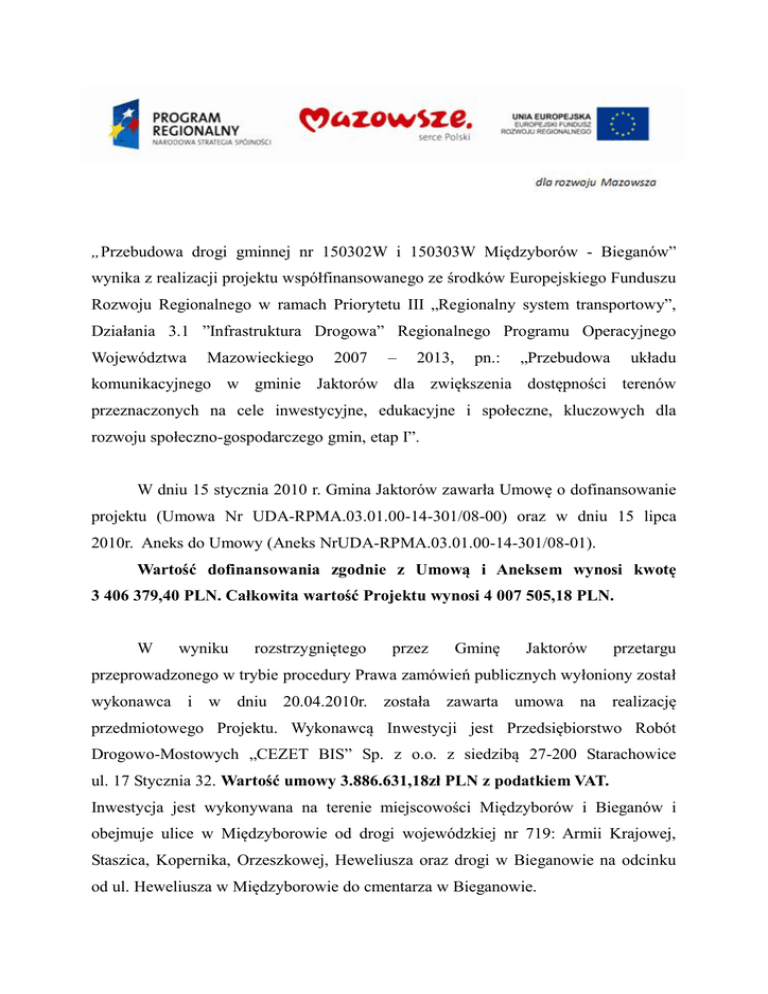 „Przebudowa drogi gminnej nr 150302W i 150303W Międzyborów - Bieganów” wynika z realizacji projektu współfinansowanego ze środków Europejskiego Funduszu Rozwoju Regionalnego w ramach Priorytetu III „Regionalny system transportowy”, Działania 3.1 ”Infrastruktura Drogowa” Regionalnego Programu Operacyjnego Województwa Mazowieckiego 2007 – 2013, pn.: „Przebudowa układu komunikacyjnego w gminie Jaktorów dla zwiększenia dostępności terenów przeznaczonych na cele inwestycyjne, edukacyjne i społeczne, kluczowych dla rozwoju społeczno-gospodarczego gmin, etap I”. W dniu 15 stycznia 2010 r. Gmina Jaktorów zawarła Umowę o dofinansowanie projektu (Umowa Nr UDA-RPMA.03.01.00-14-301/08-00) oraz w dniu 15 lipca 2010r. Aneks do Umowy (Aneks NrUDA-RPMA.03.01.00-14-301/08-01). Wartość dofinansowania zgodnie z Umową i Aneksem wynosi kwotę 3 406 379,40 PLN. Całkowita wartość Projektu wynosi 4 007 505,18 PLN. W wyniku rozstrzygniętego przez Gminę Jaktorów przetargu przeprowadzonego w trybie procedury Prawa zamówień publicznych wyłoniony został wykonawca i w dniu 20.04.2010r. została zawarta umowa na realizację przedmiotowego Projektu. Wykonawcą Inwestycji jest Przedsiębiorstwo Robót Drogowo-Mostowych „CEZET BIS” Sp. z o.o. z siedzibą 27-200 Starachowice ul. 17 Stycznia 32. Wartość umowy 3.886.631,18zł PLN z podatkiem VAT. Inwestycja jest wykonywana na terenie miejscowości Międzyborów i Bieganów i obejmuje ulice w Międzyborowie od drogi wojewódzkiej nr 719: Armii Krajowej, Staszica, Kopernika, Orzeszkowej, Heweliusza oraz drogi w Bieganowie na odcinku od ul. Heweliusza w Międzyborowie do cmentarza w Bieganowie. Inwestycja obejmuje przebudowę drogi, korektę niwelety osi jezdni ze wzmocnieniem konstrukcji, budowę chodnika oraz zatok postojowych, parkingu i odwodnienia. Planowana długość drogi do przebudowy wynosi 2,46 km, szerokość jezdni wynosi 5,5 m, szerokość chodnika jest zmienna od 1,5 m do 2 m. Wykonanie wzmocnienia istniejącej nawierzchni drogi tłuczniem, wykonanie wierzchniej warstwy z betonu asfaltowego spełniającego wymogi katalogowej konstrukcji KR-3. Nawierzchnia drogi ujęta zostanie w krawężniki betonowe wyniesione koloru szarego. Chodniki utwardzone kostką brukową betonową. Zewnętrzna krawędź chodnika zakończona obrzeżem betonowym szarym. Zjazdy indywidualne o wymiarach dopasowanych do istniejących bram wjazdowych z kostki betonowej. Ponadto wykonanie z kostki brukowej dwóch zatok postojowych na 20 samochodów osobowych każda, oraz jednej zatoki postojowej na 16 samochodów osobowych oraz parkingu na 47 samochodów osobowych. Pozostała część terenu pasa drogowego zostanie zagospodarowana w formie zieleńca. Odwodnienie nawierzchni utwardzonych drogi poprzez powierzchniowe odprowadzenie wód deszczowych do systemu rowów chłonnoodparowujących, połączonych ze sobą za pomocą przepustów pod zjazdami. Wykonanie oznakowania pionowego. Termin zakończenia realizacji Projektu – 29 listopad 2010r. „Wydatek współfinansowany przez Unię Europejską z Europejskiego Funduszu Rozwoju Regionalnego w ramach Regionalnego Programu Operacyjnego Województwa Mazowieckiego 2007-2013” Informacje źródłowe na temat Regionalnego Programu Operacyjnego Województwa Mazowieckiego 2007-2013 znajdują się na stronie: www.mazowia.eu