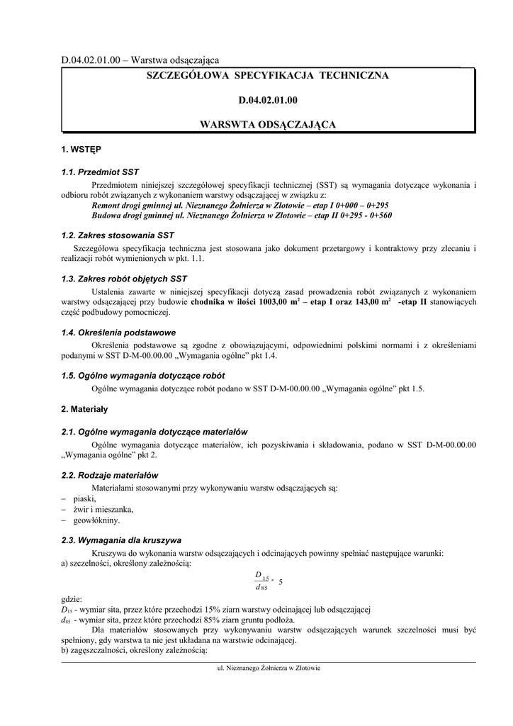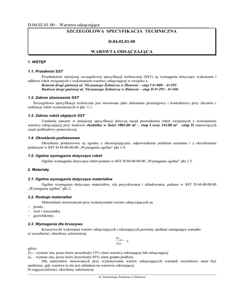D.04.02.01.00 – Warstwa odsączająca SZCZEGÓŁOWA SPECYFIKACJA TECHNICZNA D.04.02.01.00 WARSWTA ODSĄCZAJĄCA 1. WSTĘP 1.1. Przedmiot SST Przedmiotem niniejszej szczegółowej specyfikacji technicznej (SST) są wymagania dotyczące wykonania i odbioru robót związanych z wykonaniem warstwy odsączającej w związku z: Remont drogi gminnej ul. Nieznanego Żołnierza w Złotowie – etap I 0+000 – 0+295 Budowa drogi gminnej ul. Nieznanego Żołnierza w Zlotowie – etap II 0+295 - 0+560 1.2. Zakres stosowania SST Szczegółowa specyfikacja techniczna jest stosowana jako dokument przetargowy i kontraktowy przy zlecaniu i realizacji robót wymienionych w pkt. 1.1. 1.3. Zakres robót objętych SST Ustalenia zawarte w niniejszej specyfikacji dotyczą zasad prowadzenia robót związanych z wykonaniem warstwy odsączającej przy budowie chodnika w ilości 1003,00 m2 – etap I oraz 143,00 m2 -etap II stanowiących część podbudowy pomocniczej. 1.4. Określenia podstawowe Określenia podstawowe są zgodne z obowiązującymi, odpowiednimi polskimi normami i z określeniami podanymi w SST D-M-00.00.00 „Wymagania ogólne” pkt 1.4. 1.5. Ogólne wymagania dotyczące robót Ogólne wymagania dotyczące robót podano w SST D-M-00.00.00 „Wymagania ogólne” pkt 1.5. 2. Materiały 2.1. Ogólne wymagania dotyczące materiałów Ogólne wymagania dotyczące materiałów, ich pozyskiwania i składowania, podano w SST D-M-00.00.00 „Wymagania ogólne” pkt 2. 2.2. Rodzaje materiałów Materiałami stosowanymi przy wykonywaniu warstw odsączających są: − piaski, − żwir i mieszanka, − geowłókniny. 2.3. Wymagania dla kruszywa Kruszywa do wykonania warstw odsączających i odcinających powinny spełniać następujące warunki: a) szczelności, określony zależnością: D 15 d 85 ≤ 5 gdzie: D15 - wymiar sita, przez które przechodzi 15% ziarn warstwy odcinającej lub odsączającej d85 - wymiar sita, przez które przechodzi 85% ziarn gruntu podłoża. Dla materiałów stosowanych przy wykonywaniu warstw odsączających warunek szczelności musi być spełniony, gdy warstwa ta nie jest układana na warstwie odcinającej. b) zagęszczalności, określony zależnością: ul. Nieznanego Żołnierza w Złotowie D.04.02.01.00 – Warstwa odsączająca U = d 60 d 10 ≥ 5 gdzie: U - wskaźnik różnoziarnistości, d60 - wymiar sita, przez które przechodzi 60% kruszywa tworzącego warstwę odcinającą, d10 - wymiar sita, przez które przechodzi 10% kruszywa tworzącego warstwę odcinającą. Piasek stosowany do wykonywania warstw odsączających i odcinających powinien spełniać wymagania normy PN-B-11113 [5] dla gatunku 1 i 2. Żwir i mieszanka stosowane do wykonywania warstw odsączających i odcinających powinny spełniać wymagania normy PN-B-11111 [3], dla klasy I i II. Miał kamienny do warstw odsączających i odcinających powinien spełniać wymagania normy PN-B-11112 [4]. 2.4. Składowanie materiałów 2.4.1. Składowanie kruszywa Jeżeli kruszywo przeznaczone do wykonania warstwy odsączającej lub odcinającej nie jest wbudowane bezpośrednio po dostarczeniu na budowę i zachodzi potrzeba jego okresowego składowania, to Wykonawca robót powinien zabezpieczyć kruszywo przed zanieczyszczeniem i zmieszaniem z innymi materiałami kamiennymi. Podłoże w miejscu składowania powinno być równe, utwardzone i dobrze odwodnione. 3. Sprzęt 3.1. Ogólne wymagania dotyczące sprzętu Ogólne wymagania dotyczące sprzętu podano w SST D-M-00.00.00 „Wymagania ogólne” pkt 3. 3.2. Sprzęt do wykonania robót Wykonawca przystępujący do wykonania warstwy odcinającej lub odsączającej powinien wykazać się możliwością korzystania z następującego sprzętu: − równiarek, − walców statycznych, − płyt wibracyjnych lub ubijaków mechanicznych. 4. Transport 4.1. Ogólne wymagania dotyczące transportu Ogólne wymagania dotyczące transportu podano w SST D-M-00.00.00 „Wymagania ogólne” pkt 4. 4.2. Transport kruszywa Kruszywa można przewozić dowolnymi środkami transportu w warunkach zabezpieczających je przed zanieczyszczeniem, zmieszaniem z innymi materiałami, nadmiernym wysuszeniem i zawilgoceniem. 5. Wykonanie robót 5.1. Ogólne zasady wykonania robót Ogólne zasady wykonania robót podano w SST D-M-00.00.00 „Wymagania ogólne” pkt 5. 5.2. Przygotowanie podłoża Warstwa odsączająca powinna być wytyczona w sposób umożliwiający wykonanie ich zgodnie z dokumentacją projektową, z tolerancjami określonymi w niniejszych specyfikacjach. Paliki lub szpilki powinny być ustawione w osi drogi i w rzędach równoległych do osi drogi, lub w inny sposób zaakceptowany przez Inżyniera. Rozmieszczenie palików lub szpilek powinno umożliwiać naciągnięcie sznurków lub linek do wytyczenia robót w odstępach nie większych niż co 10 m. ul. Nieznanego Żołnierza w Złotowie D.04.02.01.00 – Warstwa odsączająca 5.3. Wbudowanie i zagęszczanie kruszywa Kruszywo powinno być rozkładane w warstwie o jednakowej grubości, przy użyciu równiarki, z zachowaniem wymaganych spadków i rzędnych wysokościowych. Grubość rozłożonej warstwy luźnego kruszywa powinna być taka, aby po jej zagęszczeniu osiągnięto grubość projektowaną. Jeżeli dokumentacja projektowa lub SST przewiduje wykonanie warstwy odsączającej lub odcinającej o grubości powyżej 20 cm, to wbudowanie kruszywa należy wykonać dwuwarstwowo. Rozpoczęcie układania każdej następnej warstwy może nastąpić po odbiorze przez Inżyniera warstwy poprzedniej. W miejscach, w których widoczna jest segregacja kruszywa należy przed zagęszczeniem wymienić kruszywo na materiał o odpowiednich właściwościach. Natychmiast po końcowym wyprofilowaniu warstwy odsączającej lub odcinającej należy przystąpić do jej zagęszczania. Zagęszczanie warstw o przekroju daszkowym należy rozpoczynać od krawędzi i stopniowo przesuwać pasami podłużnymi częściowo nakładającymi się,